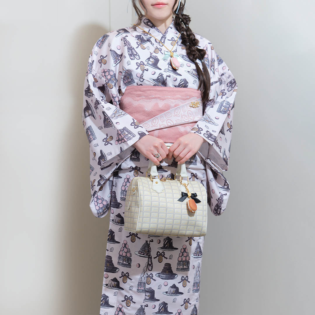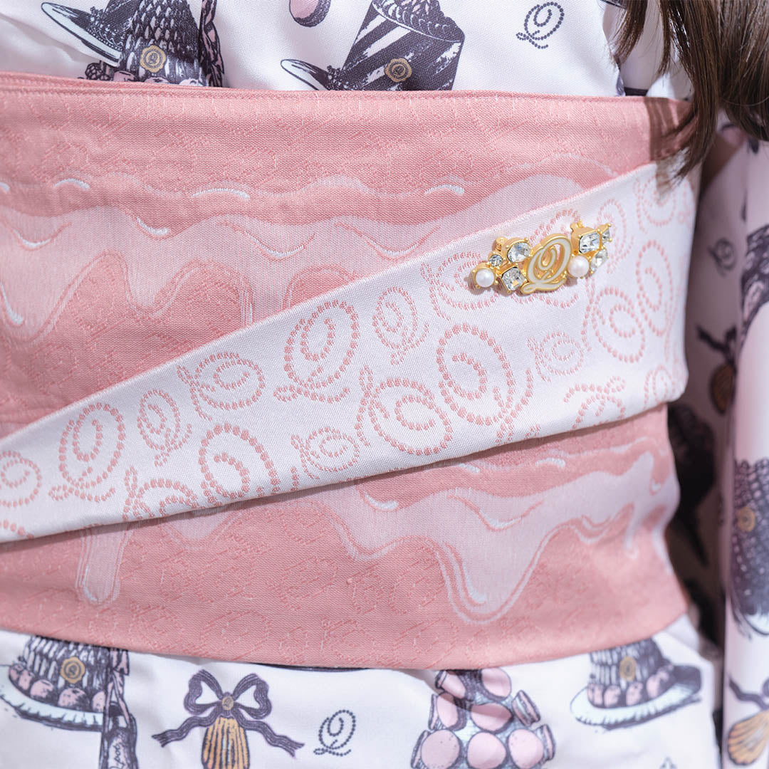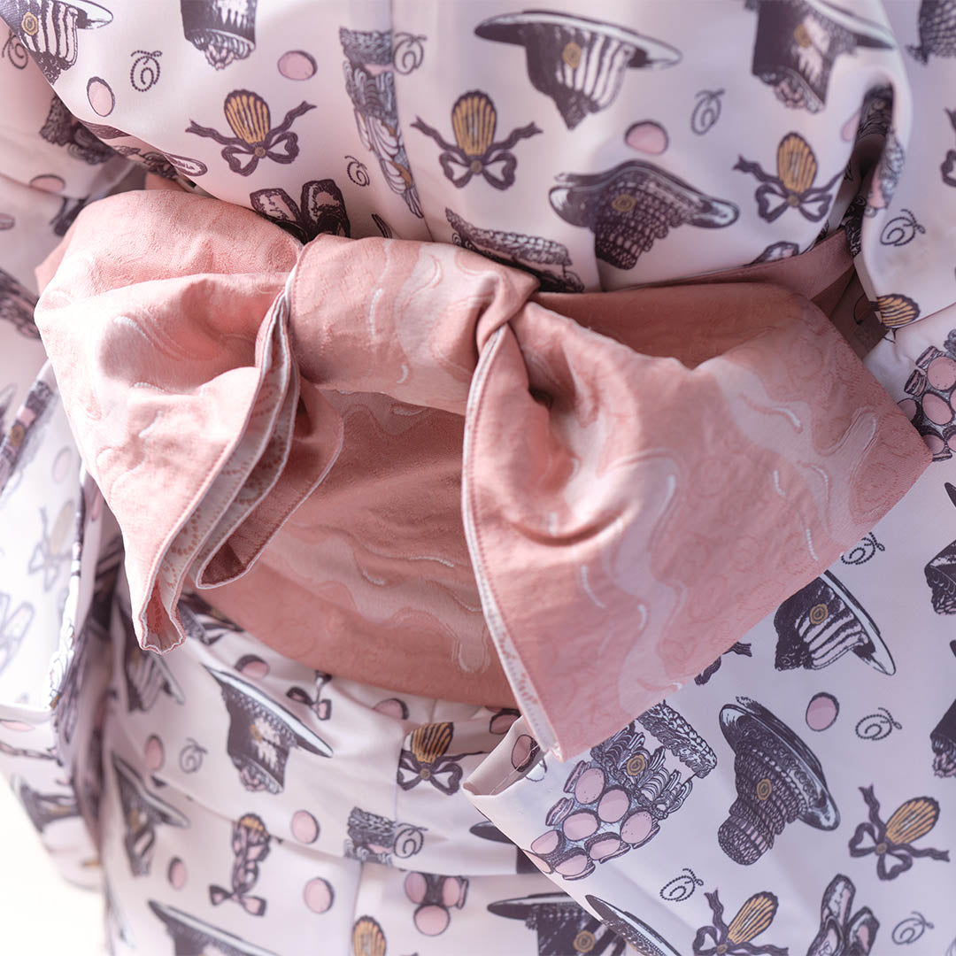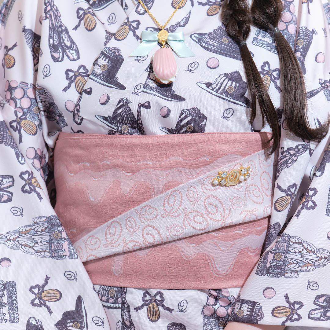 This yukata can be worn in the classic way, and also recommended to pair them with lace or stylish shoes for a fashionable style. The original elegant and sweet obi is inspired by strawberry milk. It has a reversible design featuring a meltiing pattern and Q-pot. logo. You can enjoy various arrangements with different ways of tying it!