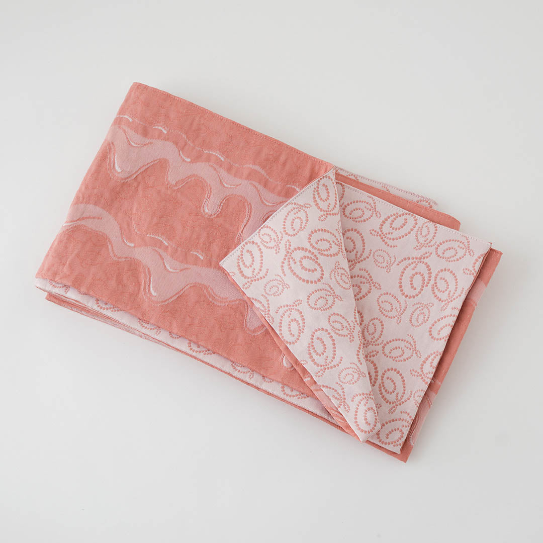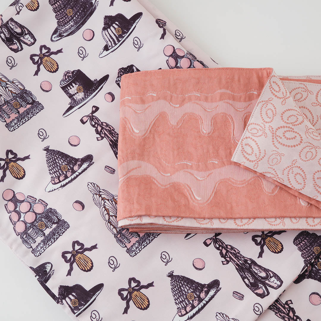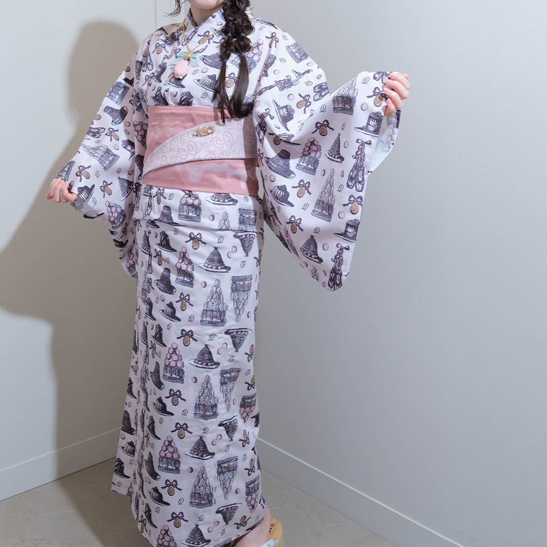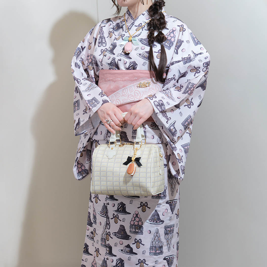 This yukata can be worn in the classic way, and also recommended to pair them with lace or stylish shoes for a fashionable style. The original elegant and sweet obi is inspired by strawberry milk. It has a reversible design featuring a meltiing pattern and Q-pot. logo. You can enjoy various arrangements with different ways of tying it!