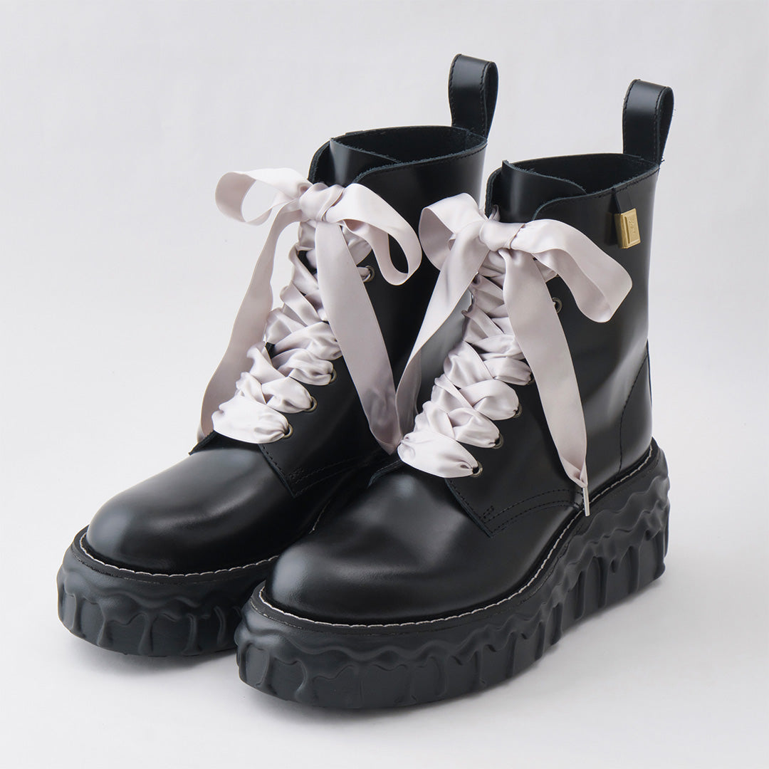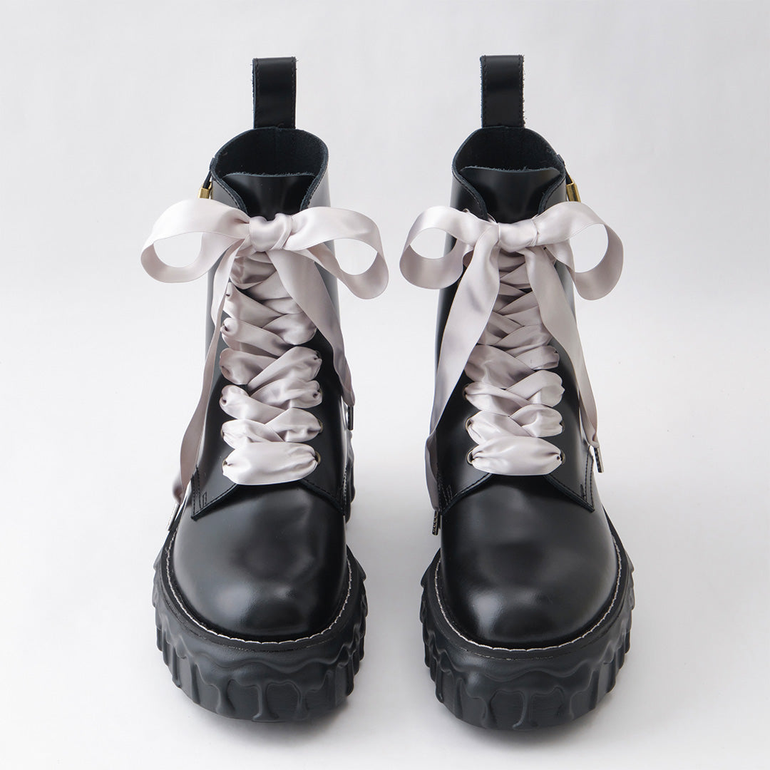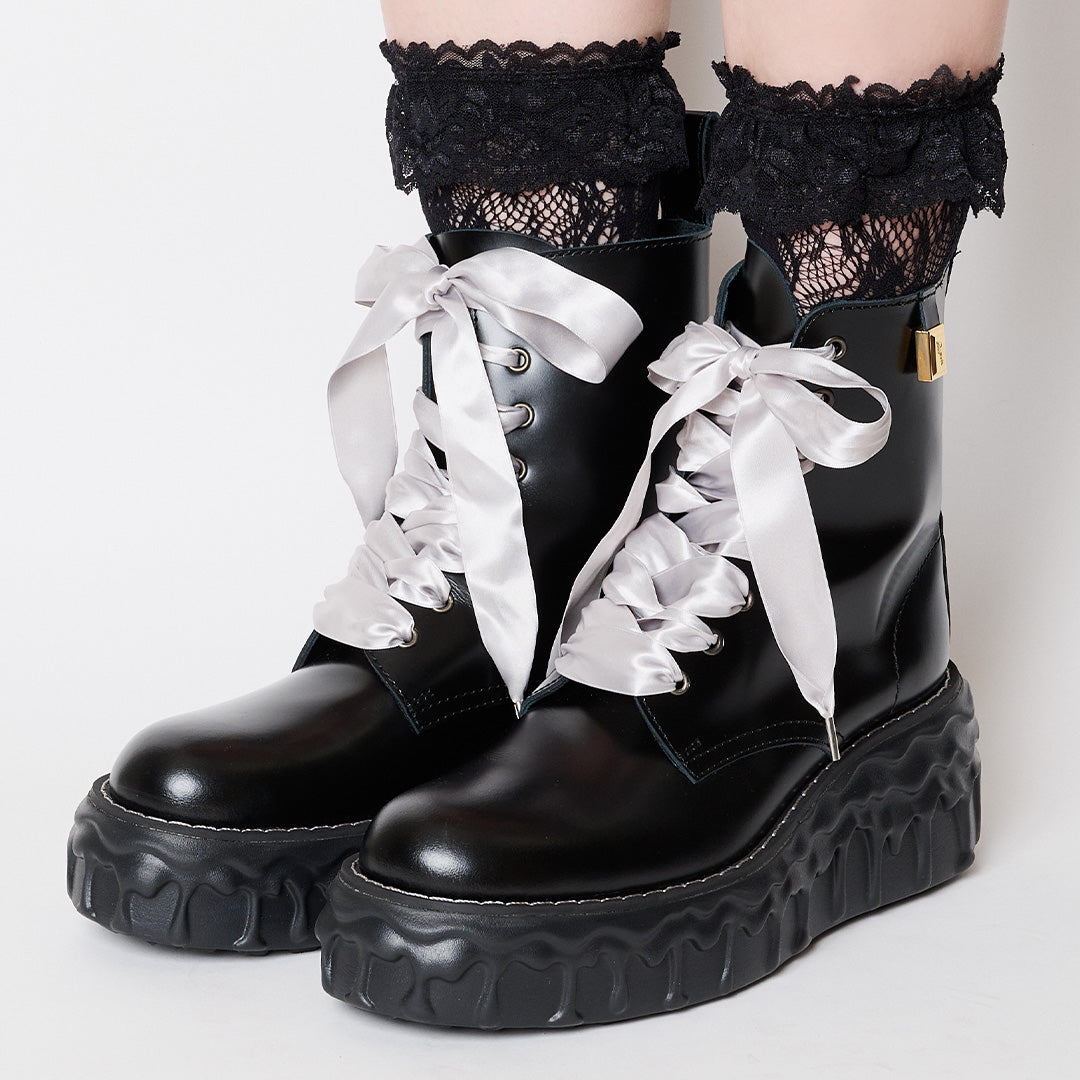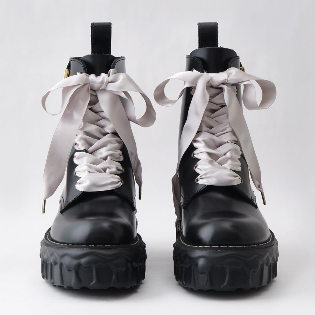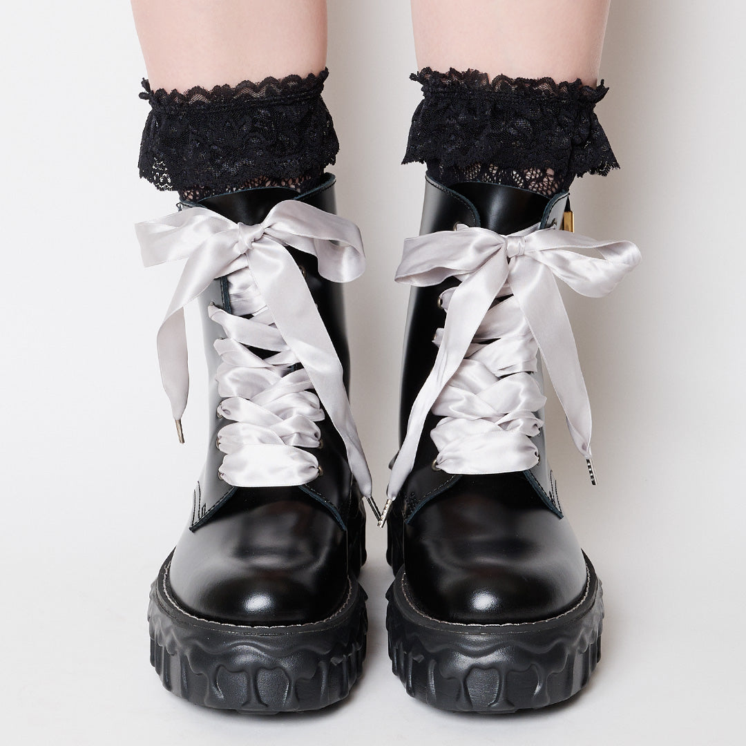 Melting Chocolate Satin Ribbon Lace Up Leather Boots (Black)【Japan Jewelry】