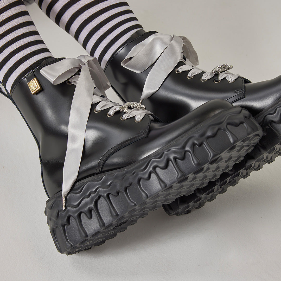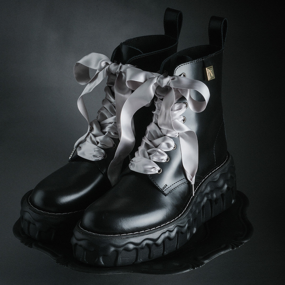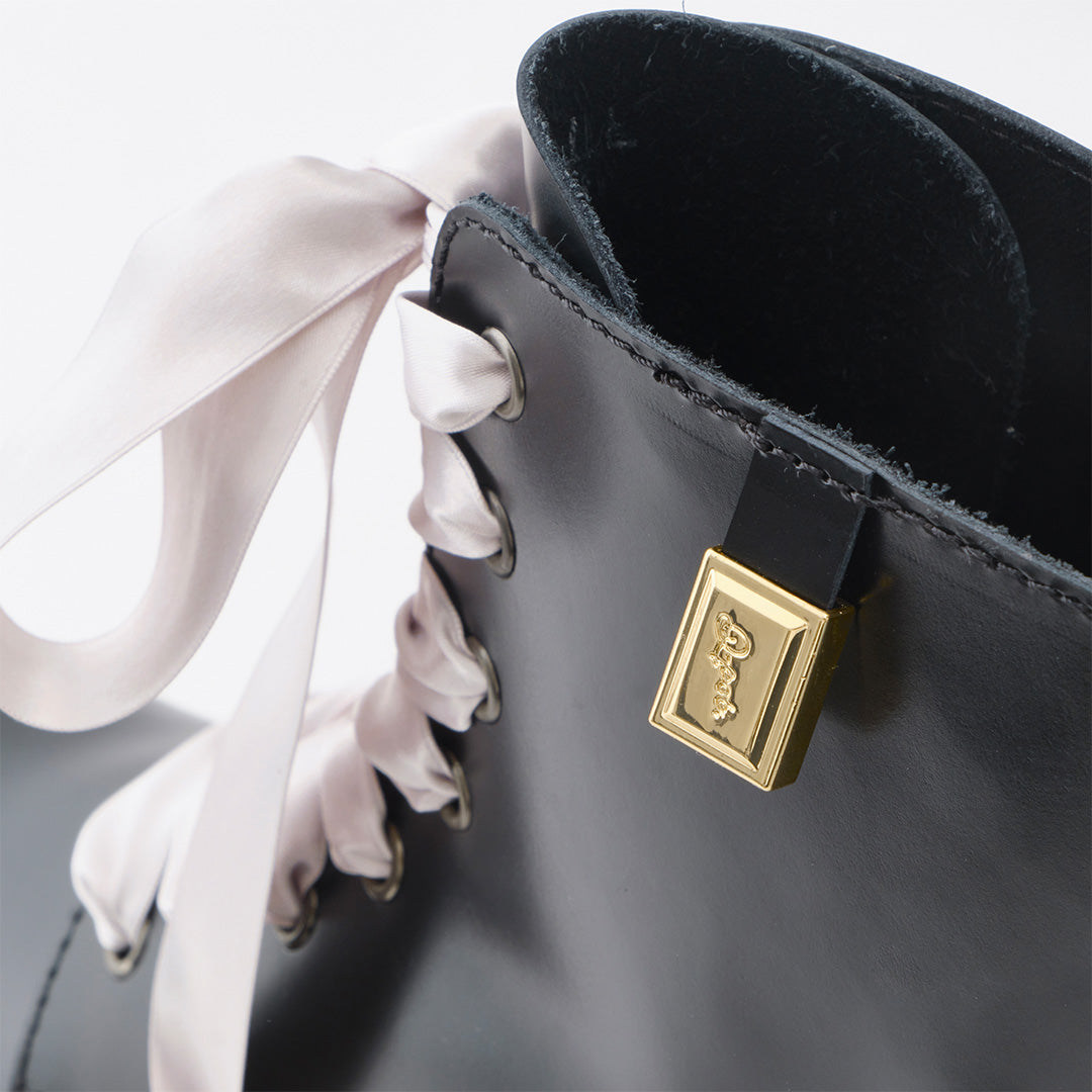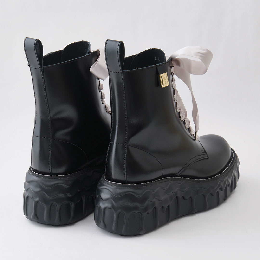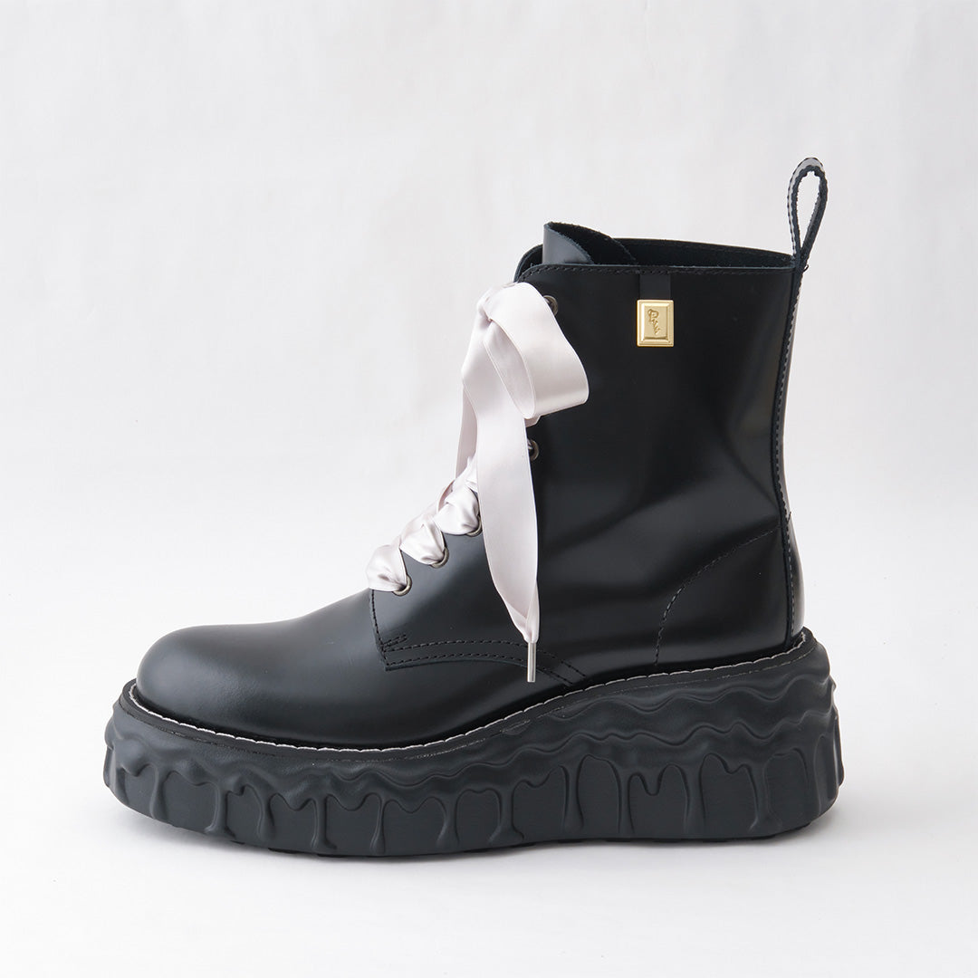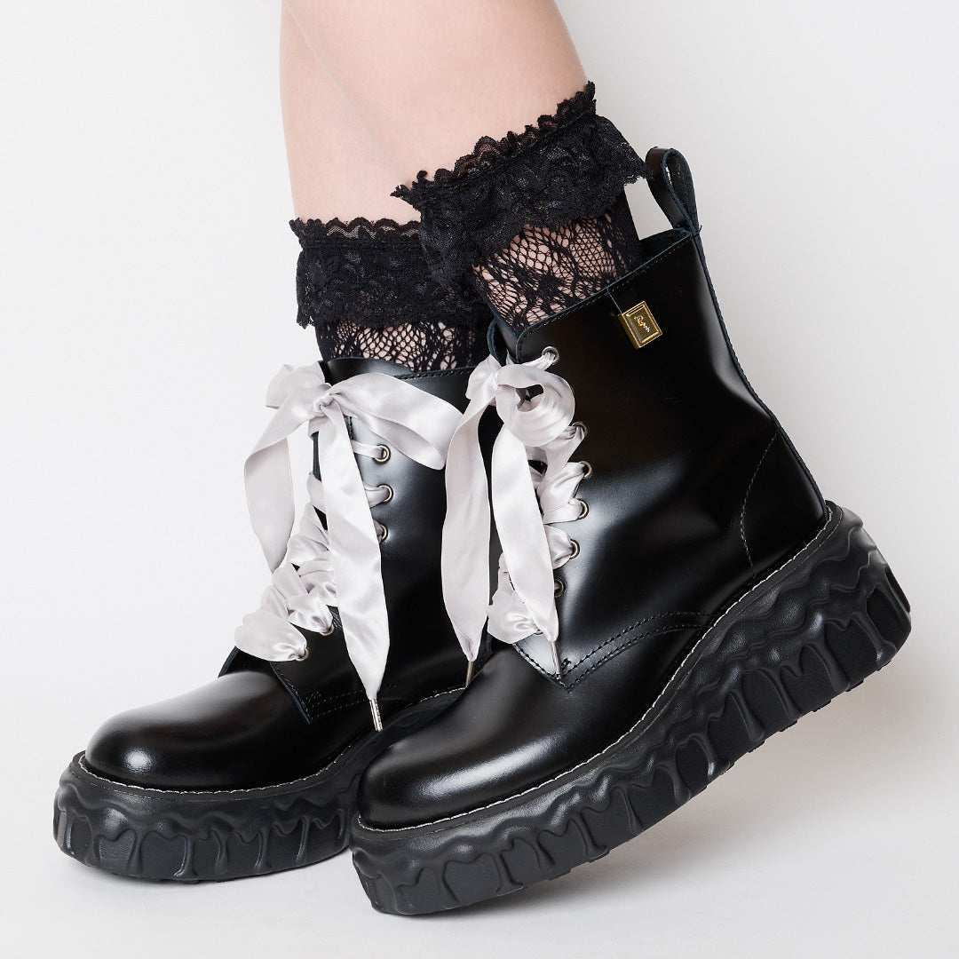 Melting Chocolate Satin Ribbon Lace Up Leather Boots (Black)【Japan Jewelry】