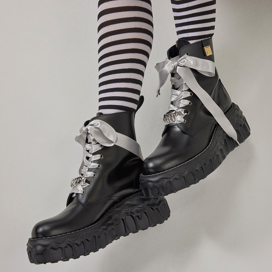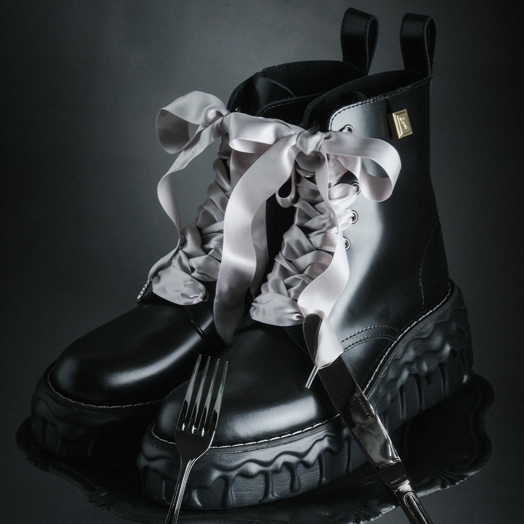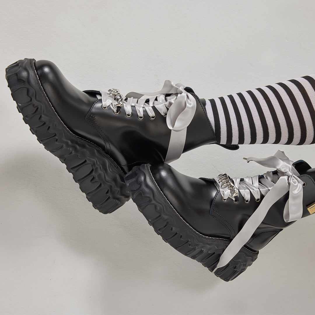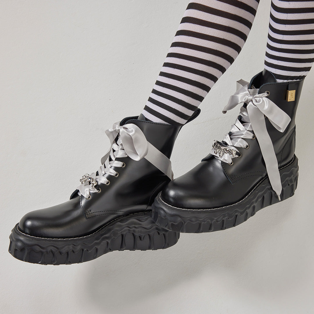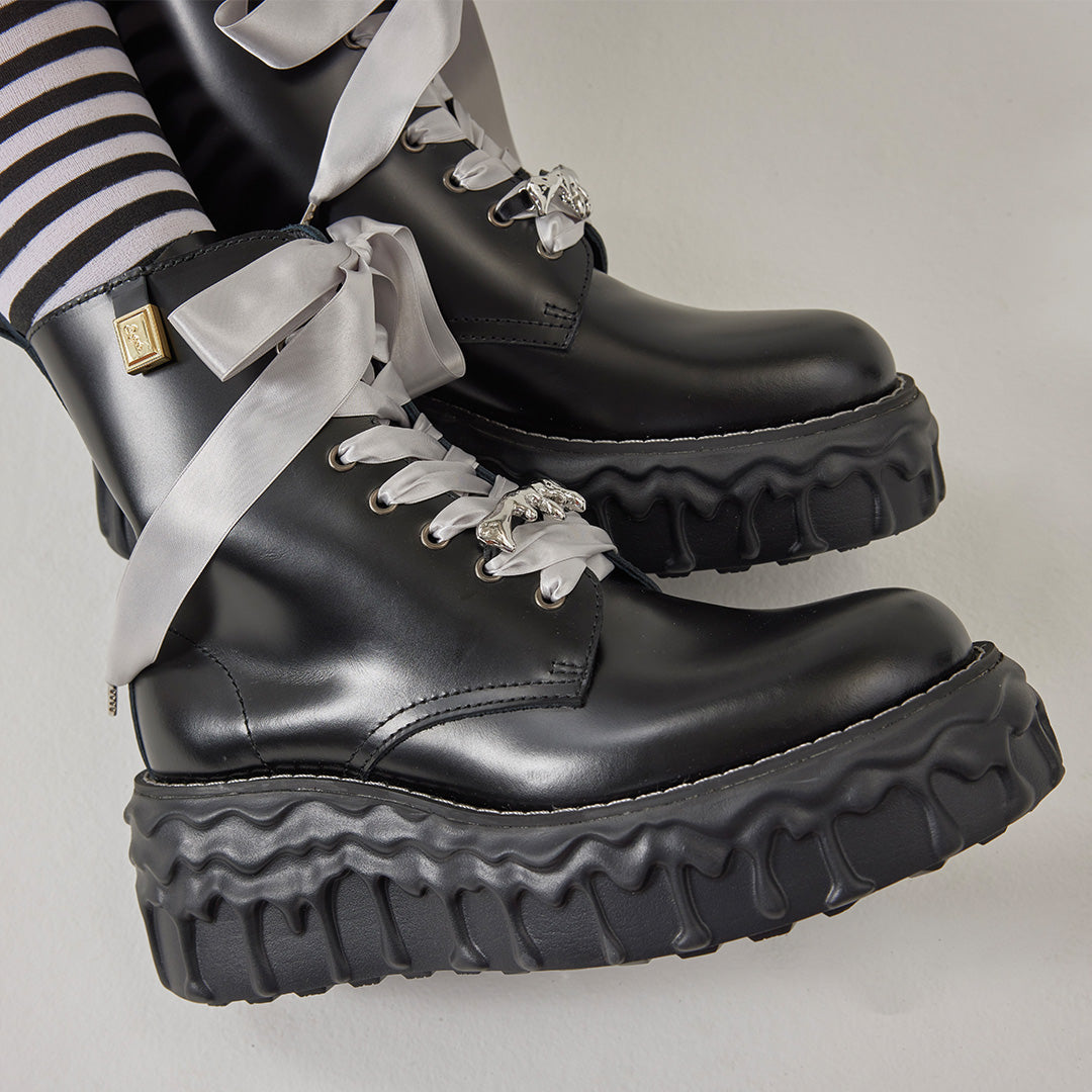 Melting Chocolate Satin Ribbon Lace Up Leather Boots (Black)【Japan Jewelry】