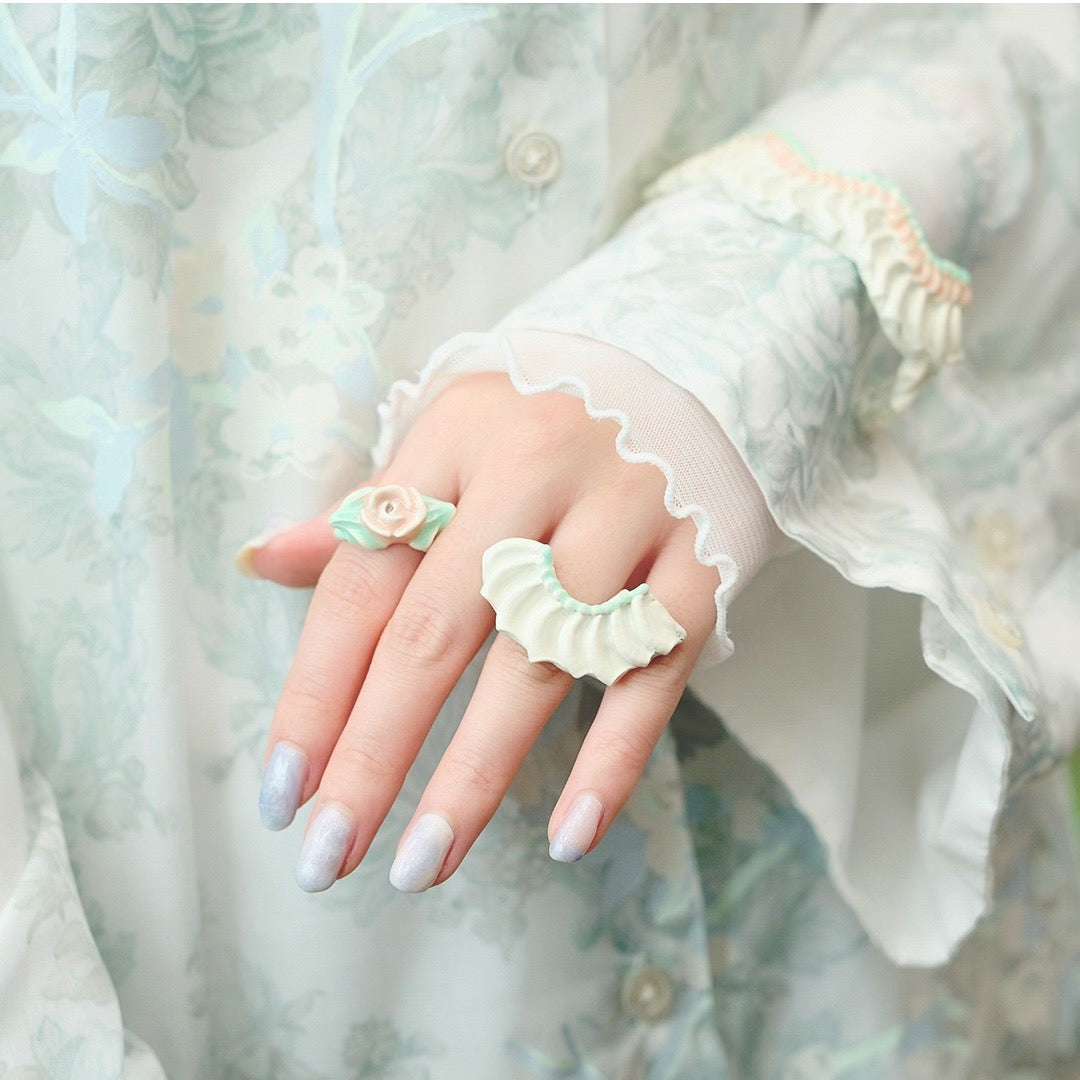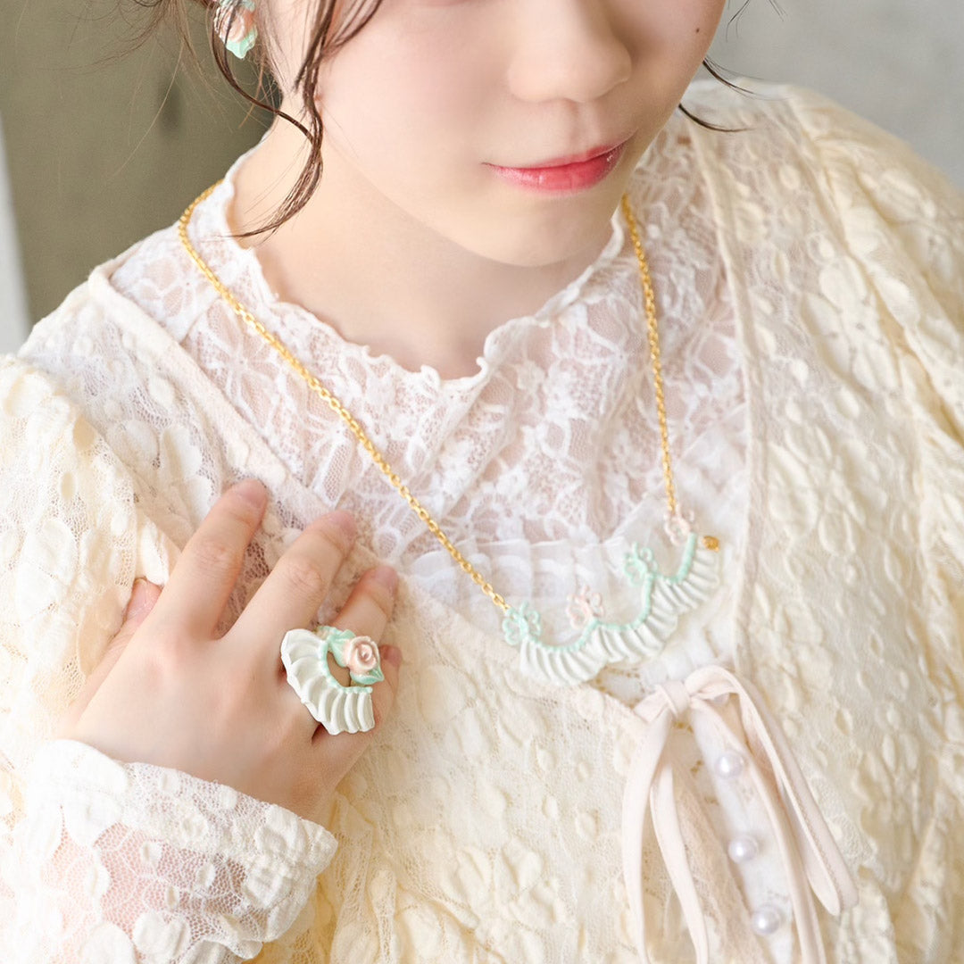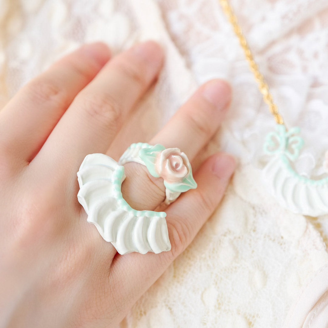 A ring like a light step of waltz curve. The large size will make your finger look gorgeous. You can also layer it with the Rose Cream Ring (sold separately).