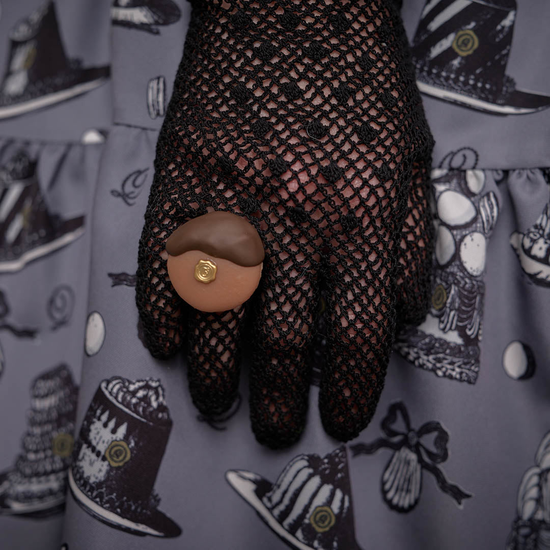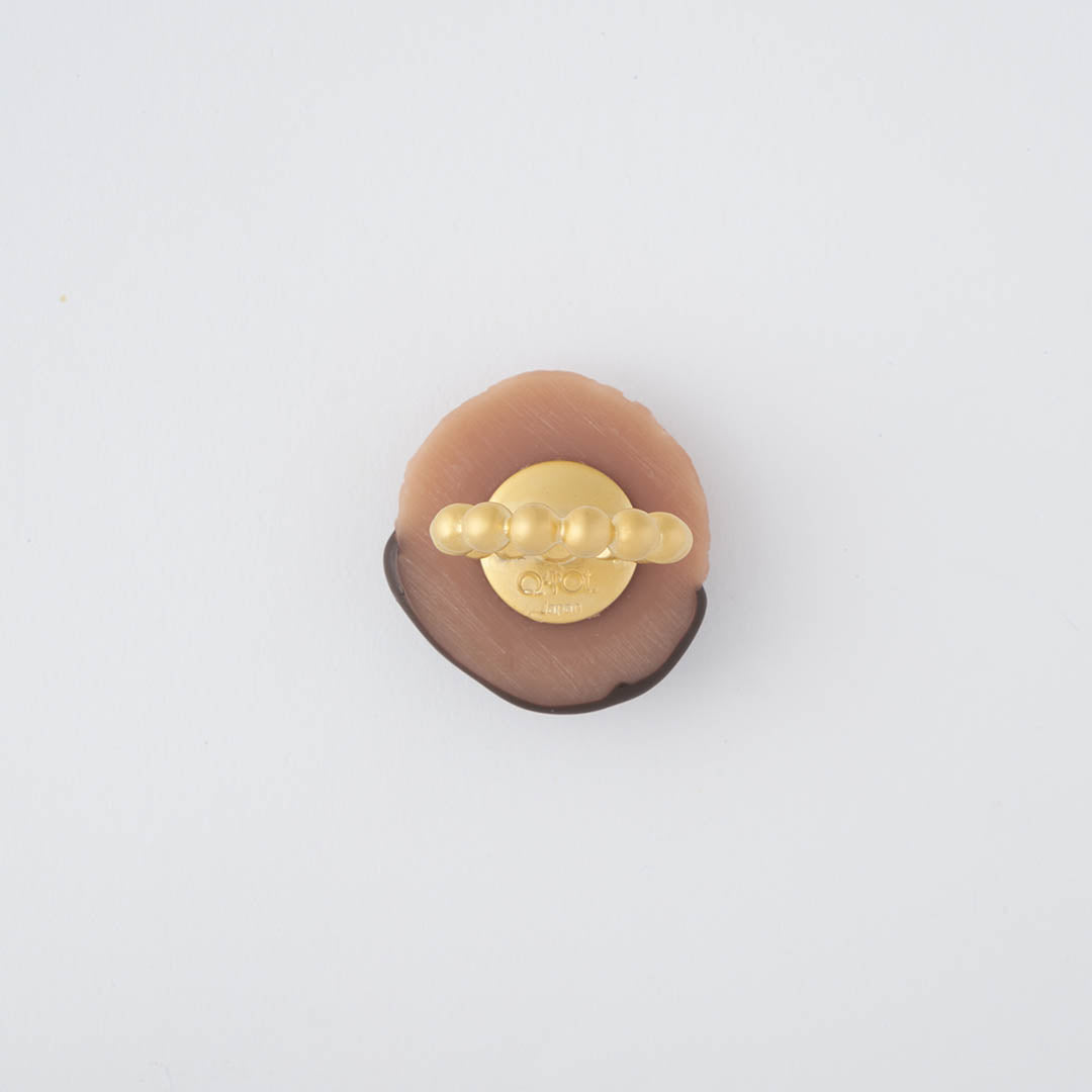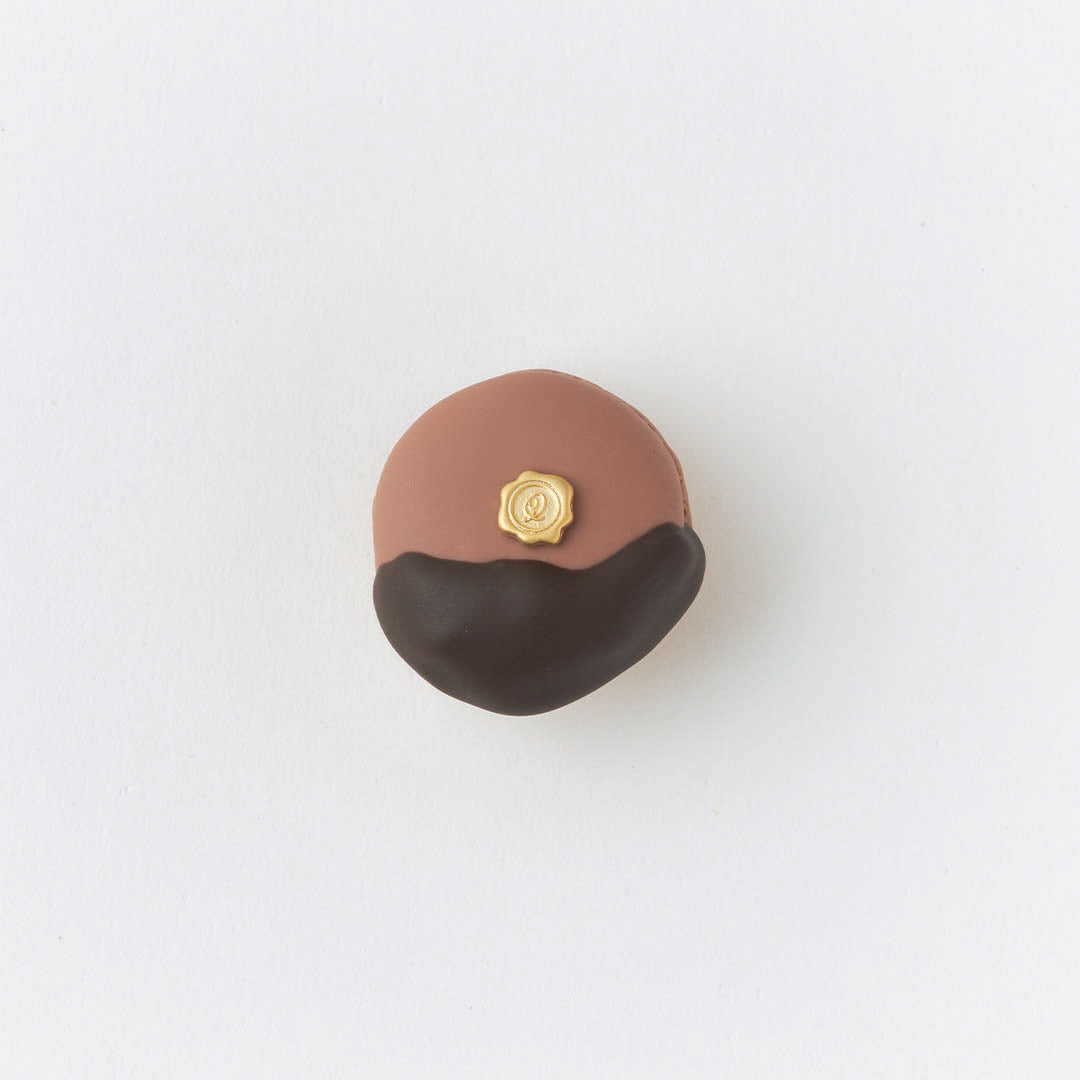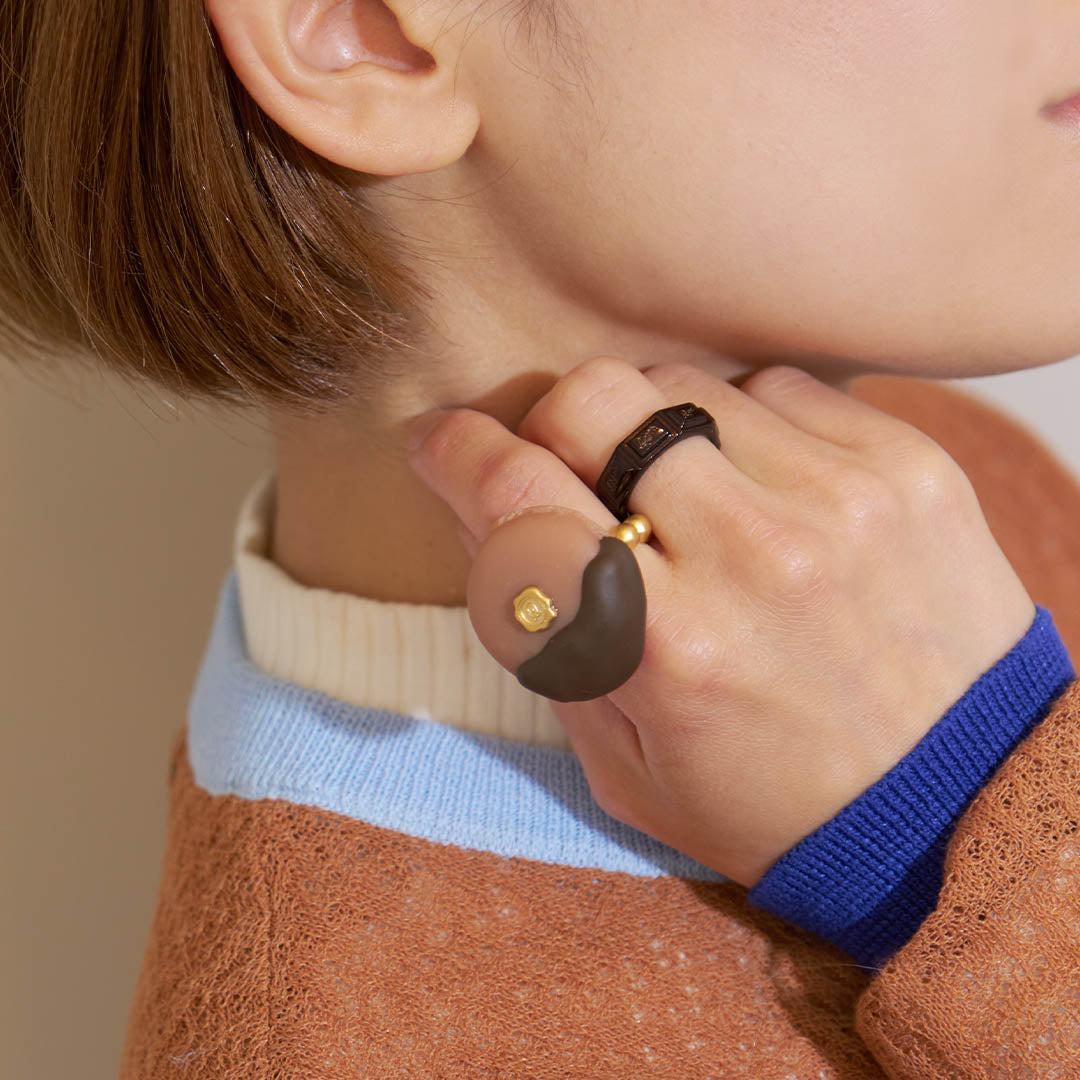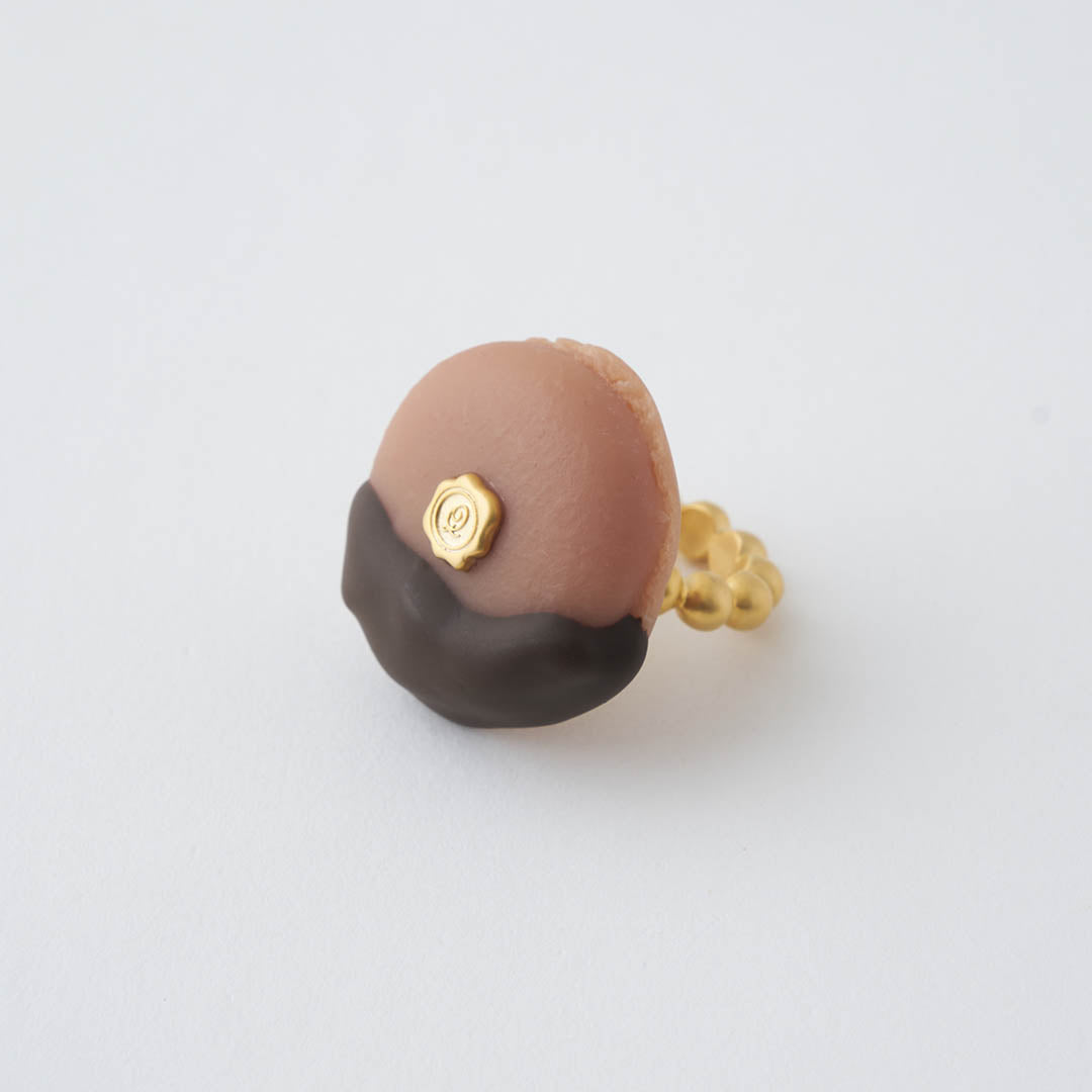 Macaron, one of the traditional French confection has been transformed into an elegant accessory. This ring features a crisp, well-baked macaron shell dipped in luscious, melted chocolate. A luxurious gold seal adds a sophisticated touch. The textured surface of the macaron shell and the smooth, flowing chocolate are crafted to look deliciously realistic.