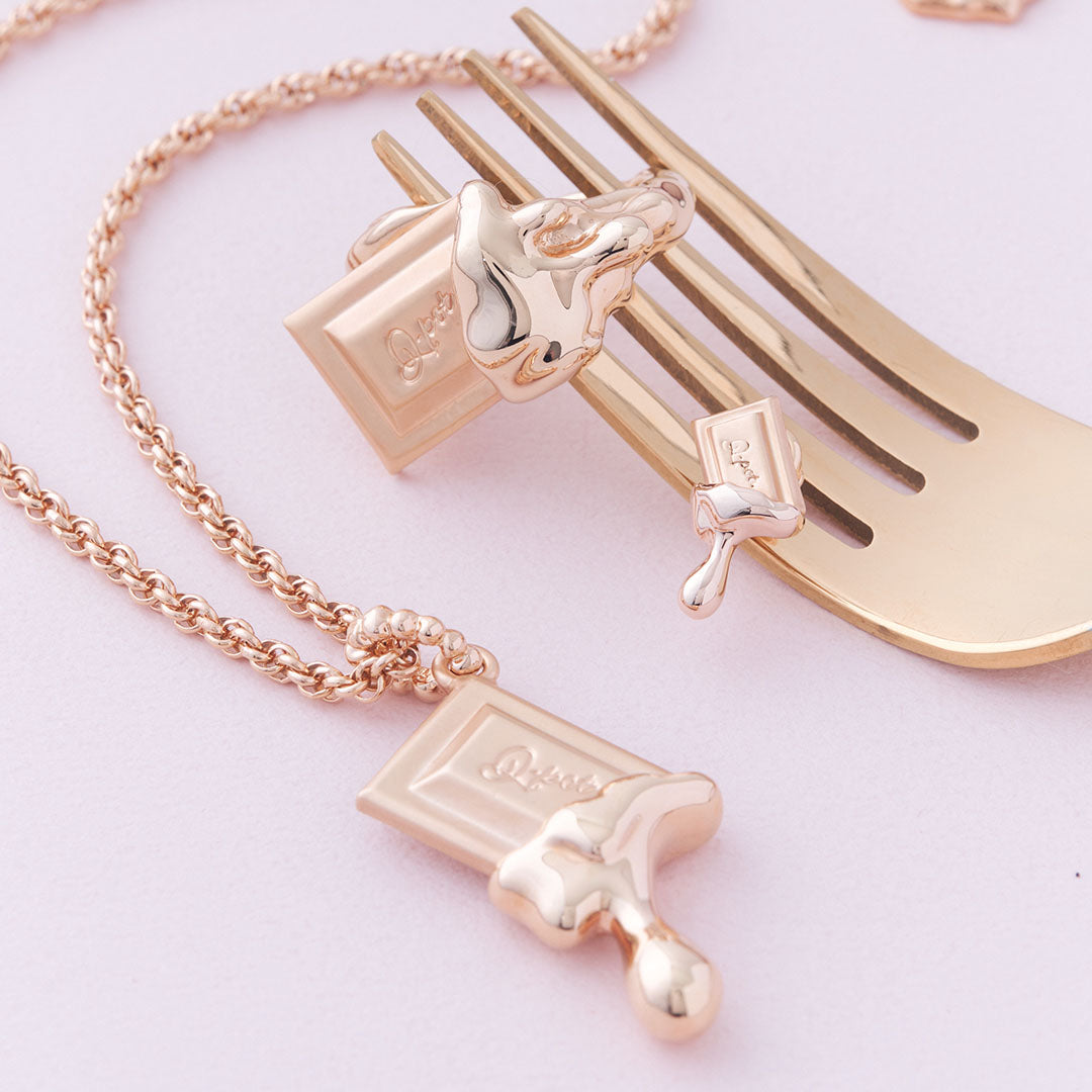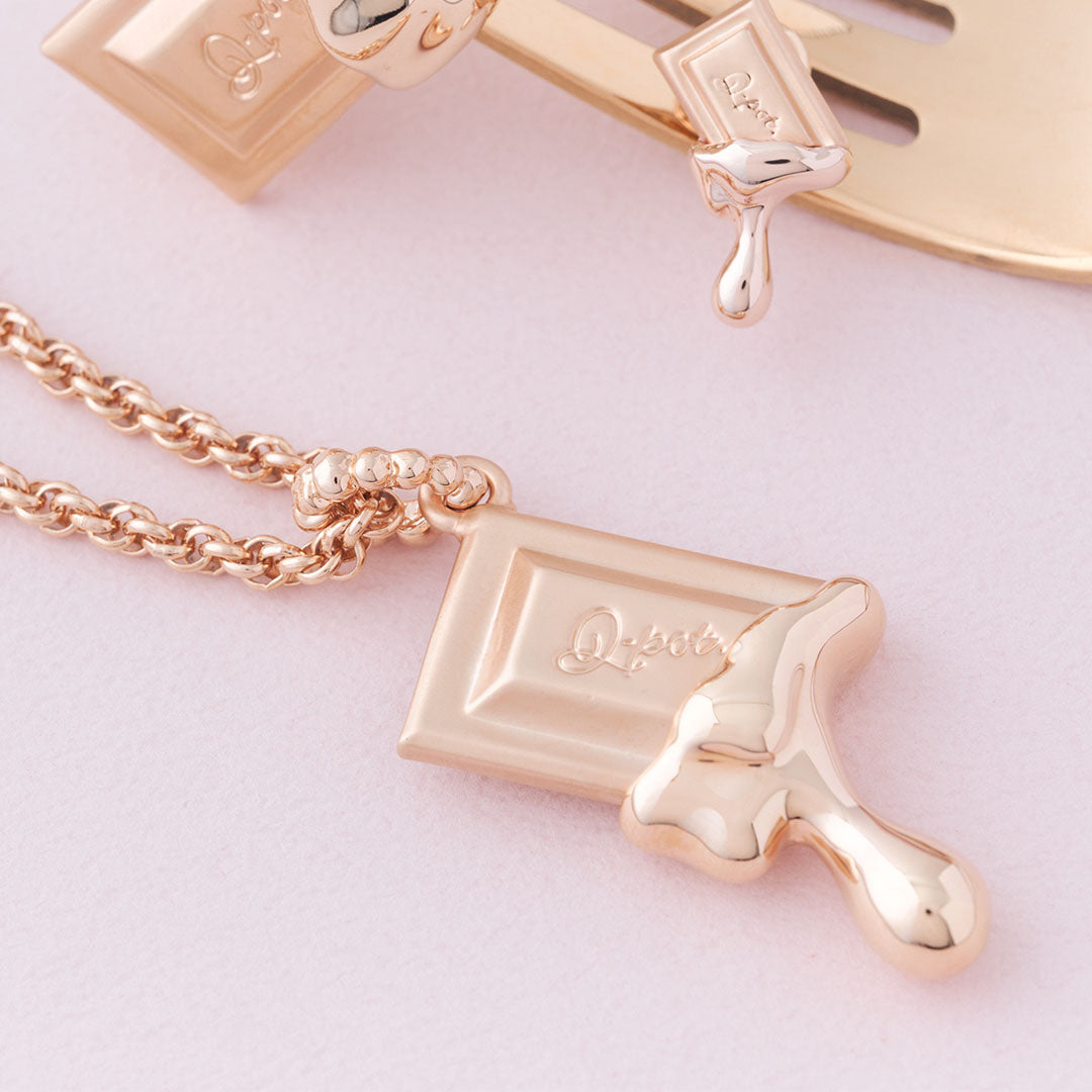 Piece of chocolate with Q-pot. logo engraved and dazzling ping gold dripping to express the moment of melting. The simple and sophisticated design goes well with a wide range of outfit. Enjoy Q-pot.'s wearable pop art!