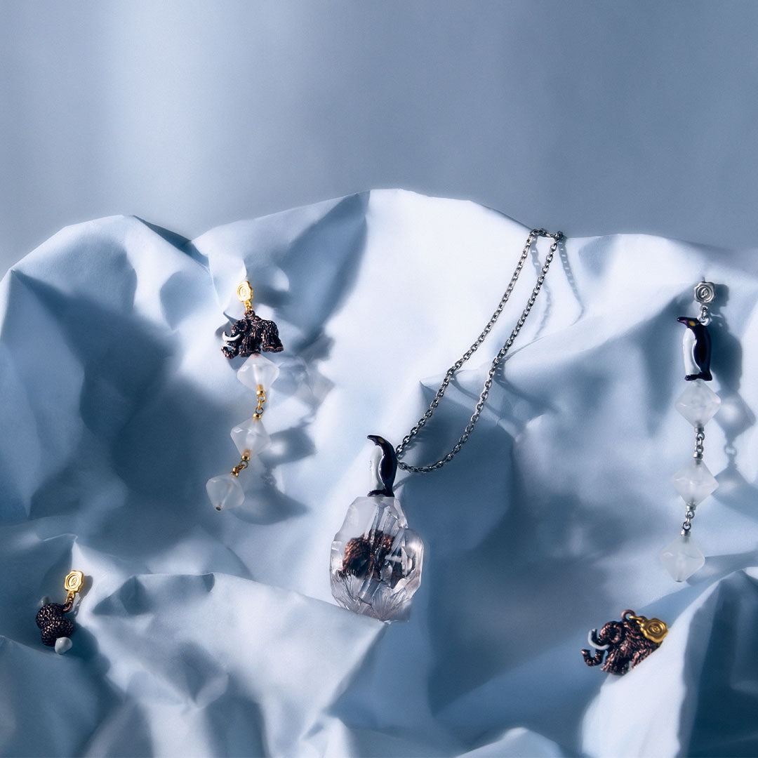Playful ice and penguin pair earrings inspired by glaciers. Penguins have a habit of following the first one to act rather than a specific leader. "The first penguin" idea comes from when penguins are about to jump in the water where might contain an abundance of fish but also predators, someone brave has to be the first penguin and jump in. These earrings are inspired by the brave first penguin and will encourage you.