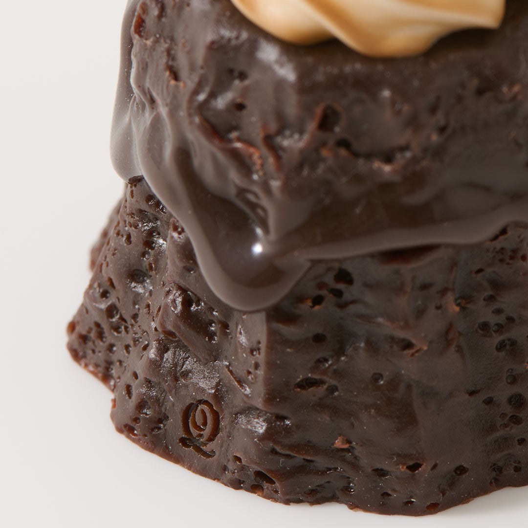 The traditional French pastry, Canelé, has been transformed into a classic, elegant accessory. The bittersweet chocolate canelé is generously drizzled with rich, melted chocolate sauce and topped with a finishing touch of perfectly toasted meringue.