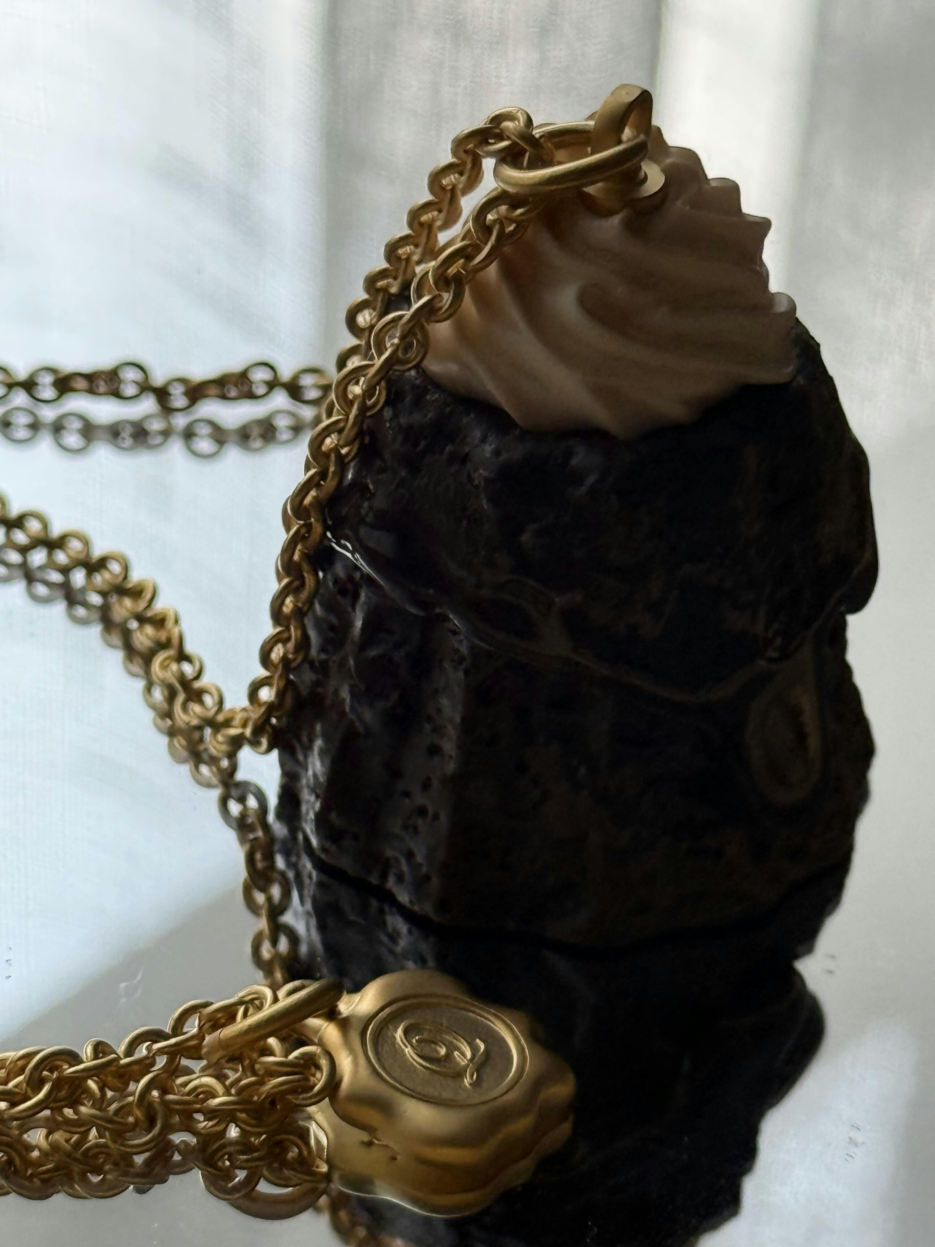 The traditional French pastry, Canelé, has been transformed into a classic, elegant accessory. The bittersweet chocolate canelé is generously drizzled with rich, melted chocolate sauce and topped with a finishing touch of perfectly toasted meringue.