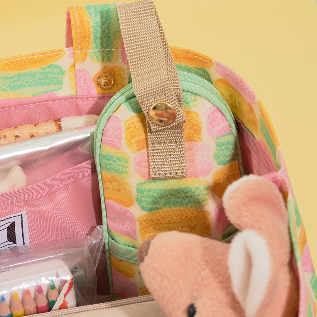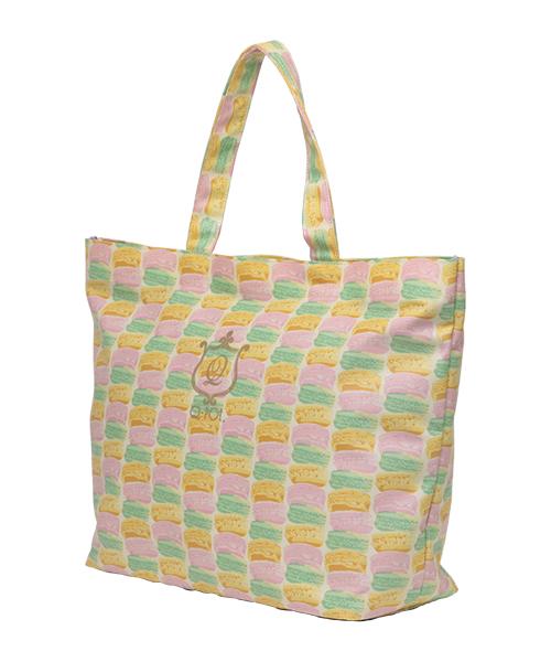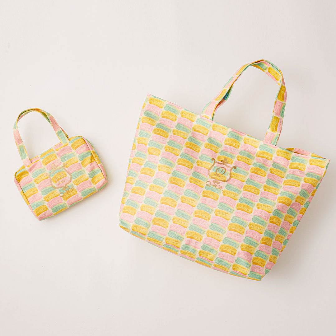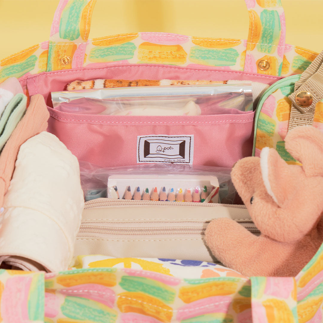 Q-pot. original designed macaron colorfully printed. With great capacity that is good for travel use. Inside pocket and a snap closure attached. PVC coating makes it not so easy to get dirty.