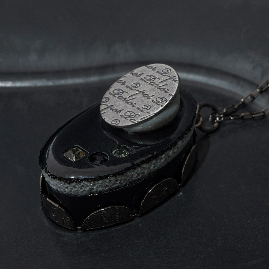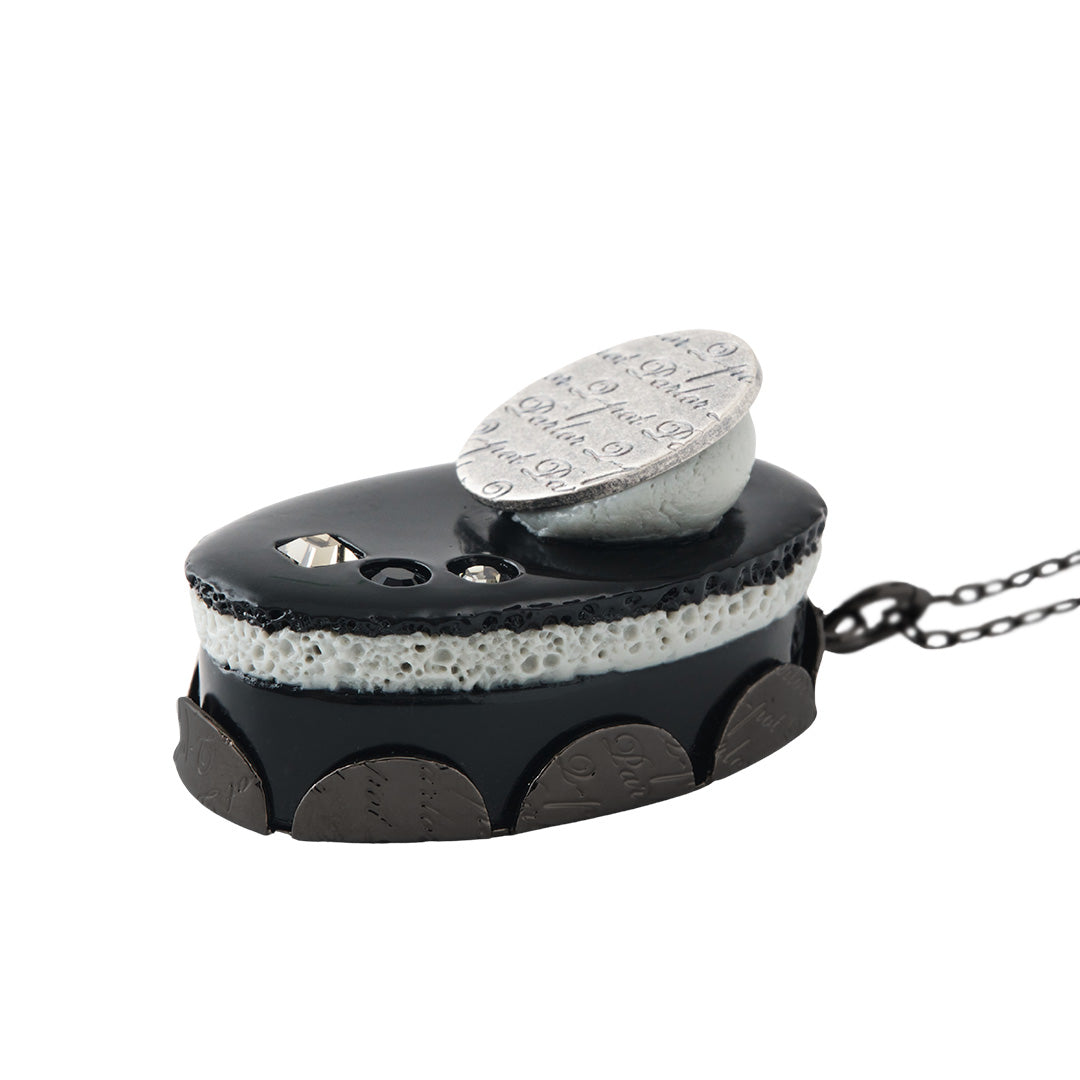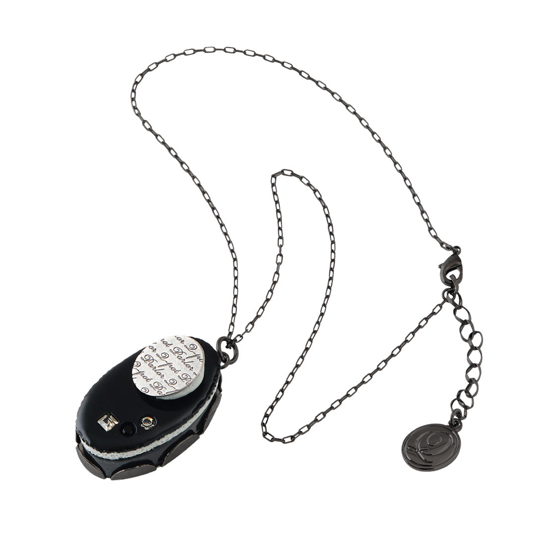 It’s a dark version of our signature oval cake necklace. Everything is the same, except for the color scheme. Awesome for those who dare to be different.