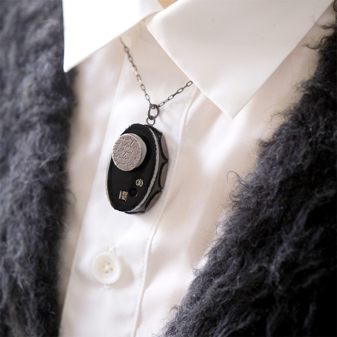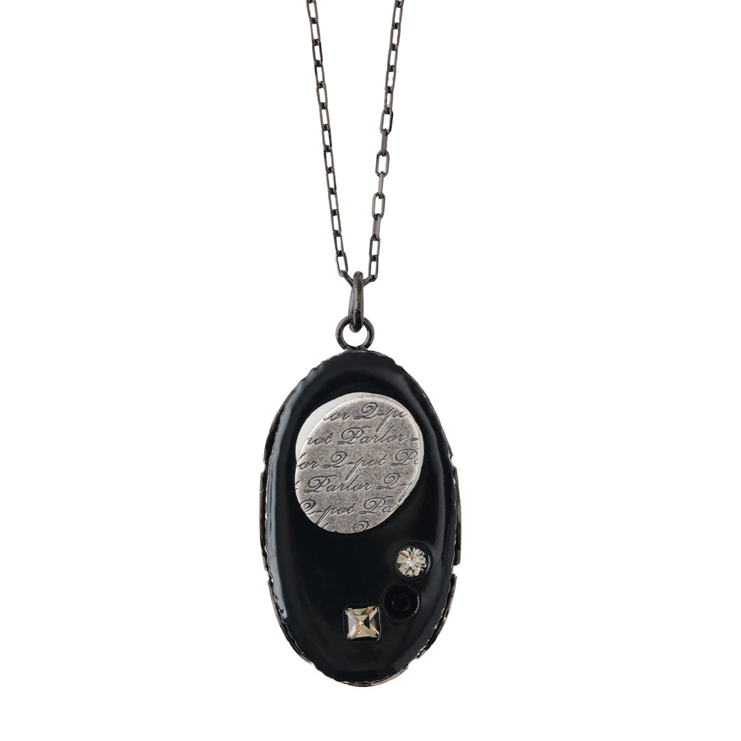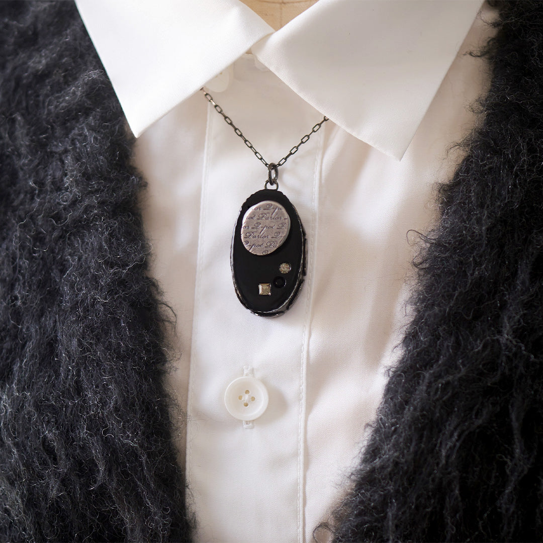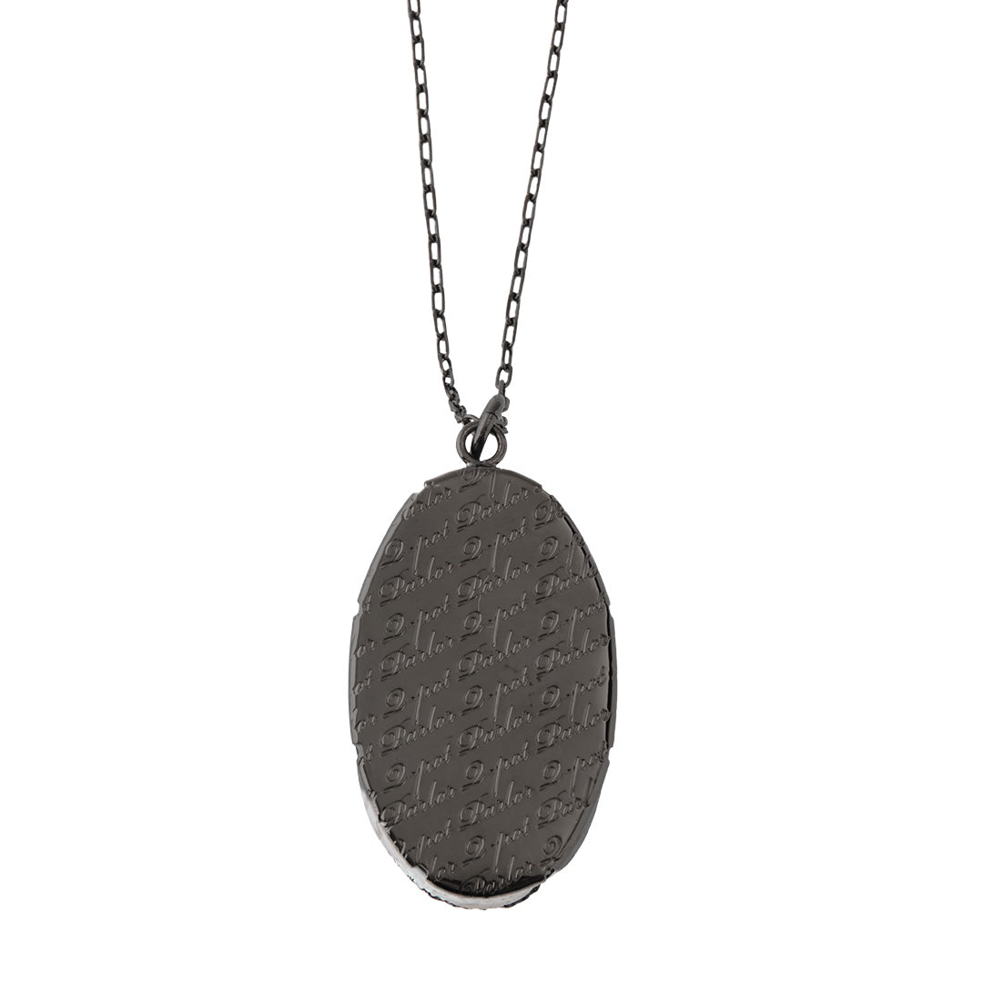 It’s a dark version of our signature oval cake necklace. Everything is the same, except for the color scheme. Awesome for those who dare to be different.