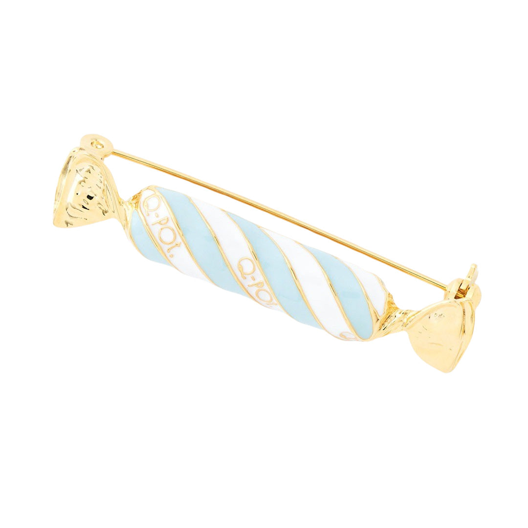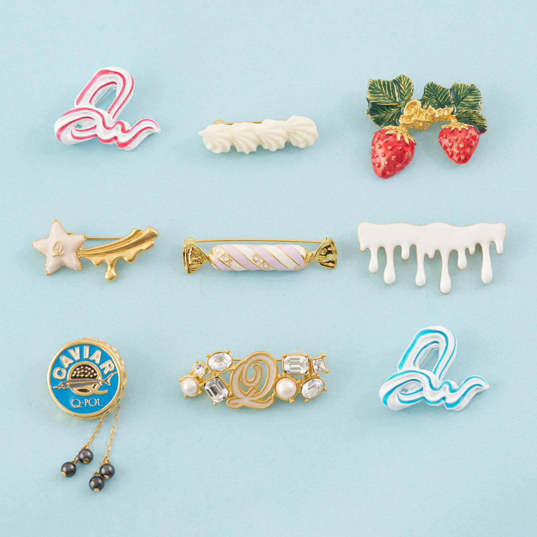 The twisted candy wrapped in striped paper with Q-pot. logo is classic yet modern. A playful brooch that changes the look just by adding it to the outfit.