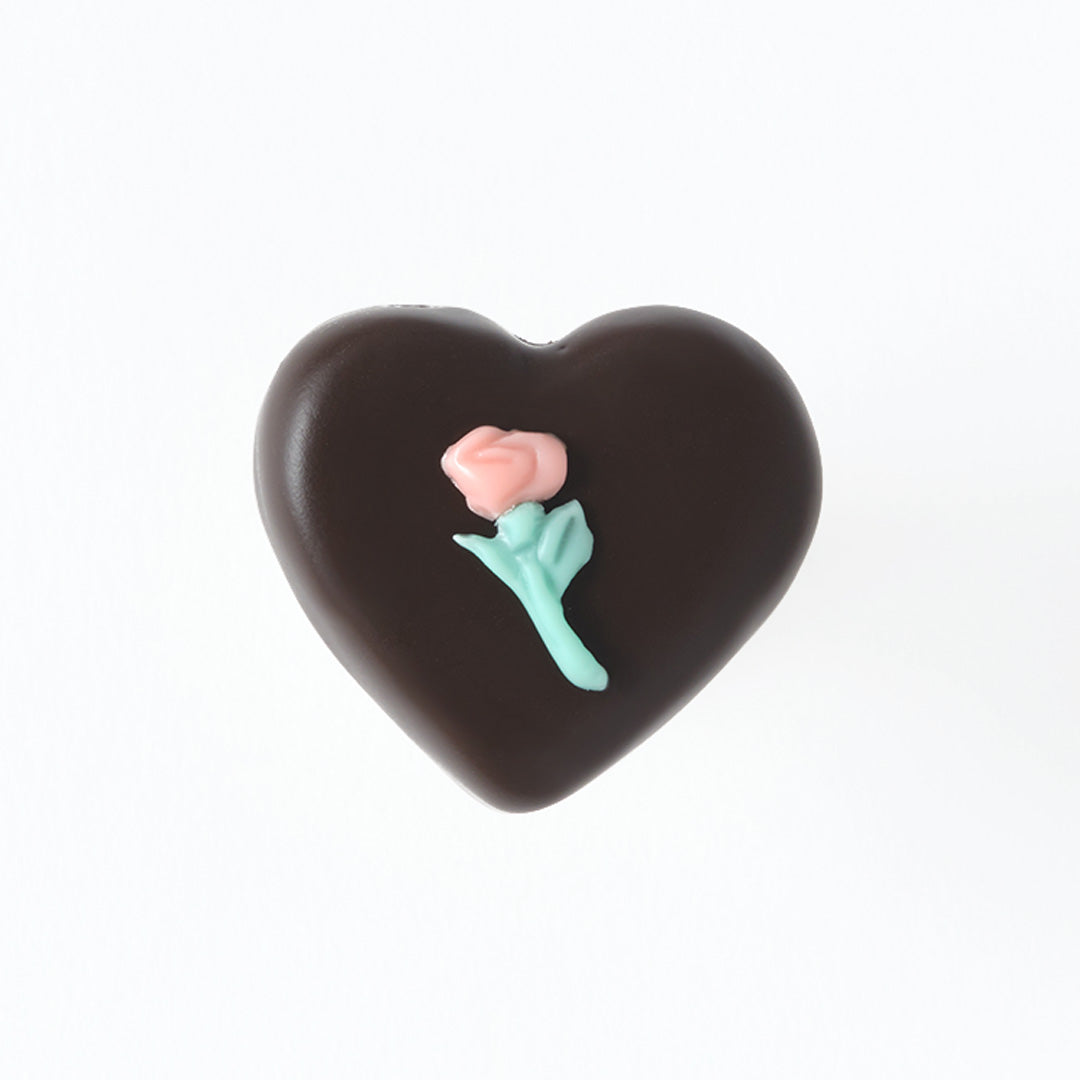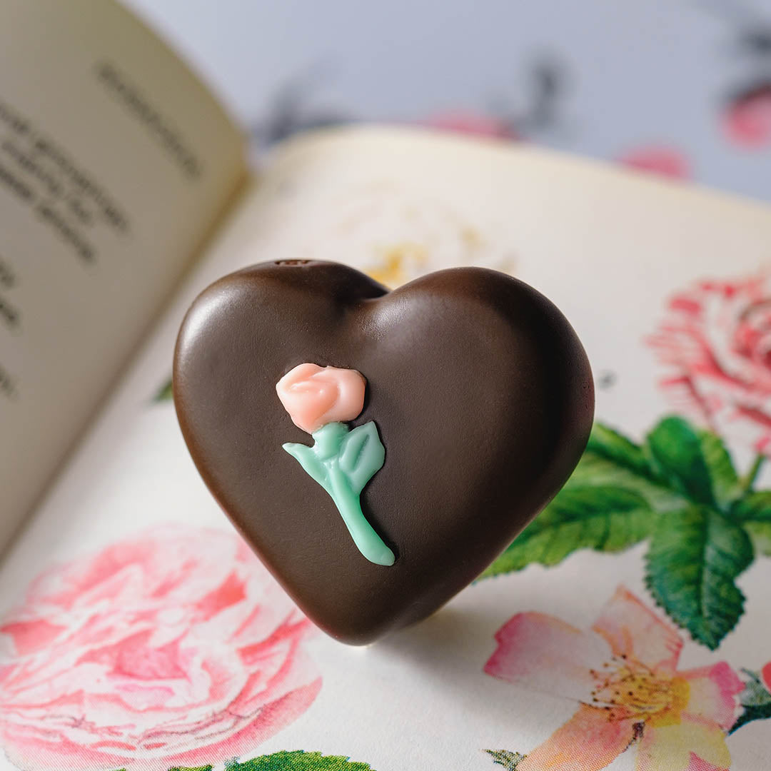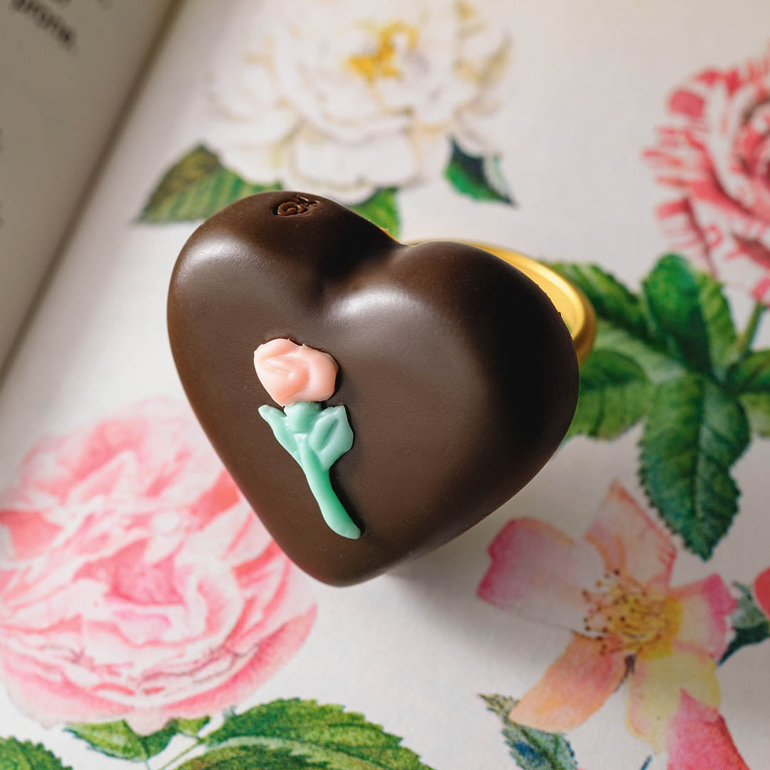 Classical yet sophisticated like a vintage jewelry, the heart-shaped chocolate looks so delicate, it feels as though it might melt at the slightest touch.