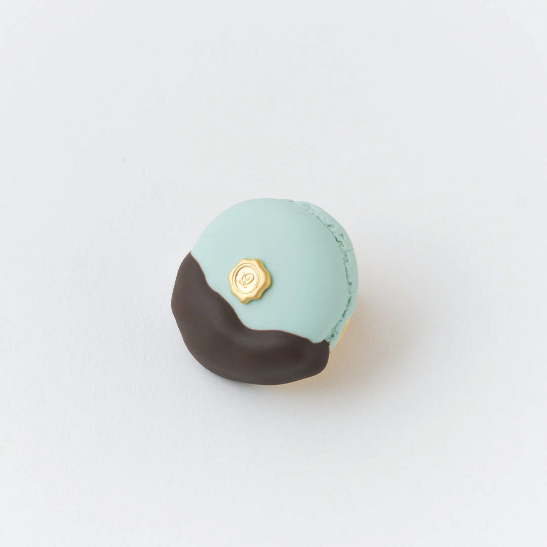 Macaron, one of the traditional French confection has been transformed into an elegant accessory. This earring features a crisp, well-baked macaron shell dipped in luscious, melted chocolate. A luxurious gold seal adds a sophisticated touch. The textured surface of the macaron shell and the smooth, flowing chocolate are crafted to look deliciously realistic.