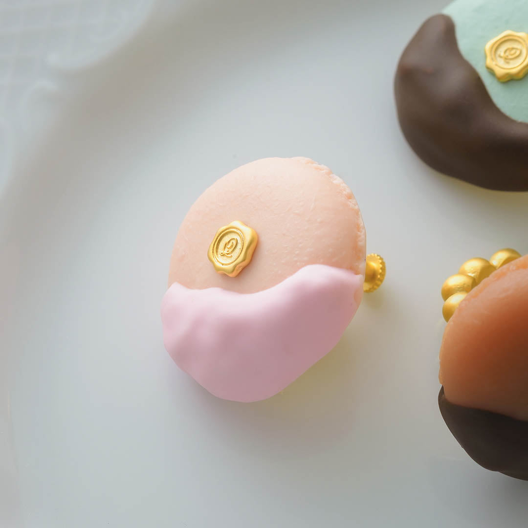 Macaron, one of the traditional French confection has been transformed into an elegant accessory. This earring features a crisp, well-baked macaron shell dipped in luscious, melted chocolate. A luxurious gold seal adds a sophisticated touch. The textured surface of the macaron shell and the smooth, flowing chocolate are crafted to look deliciously realistic.