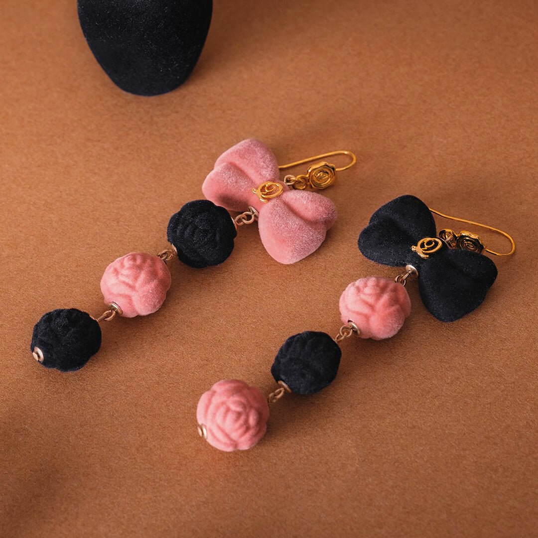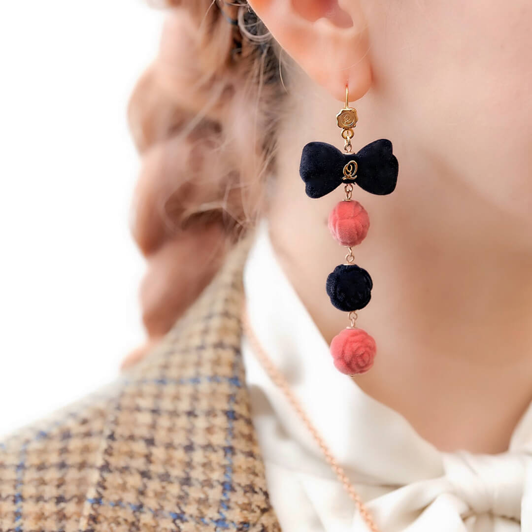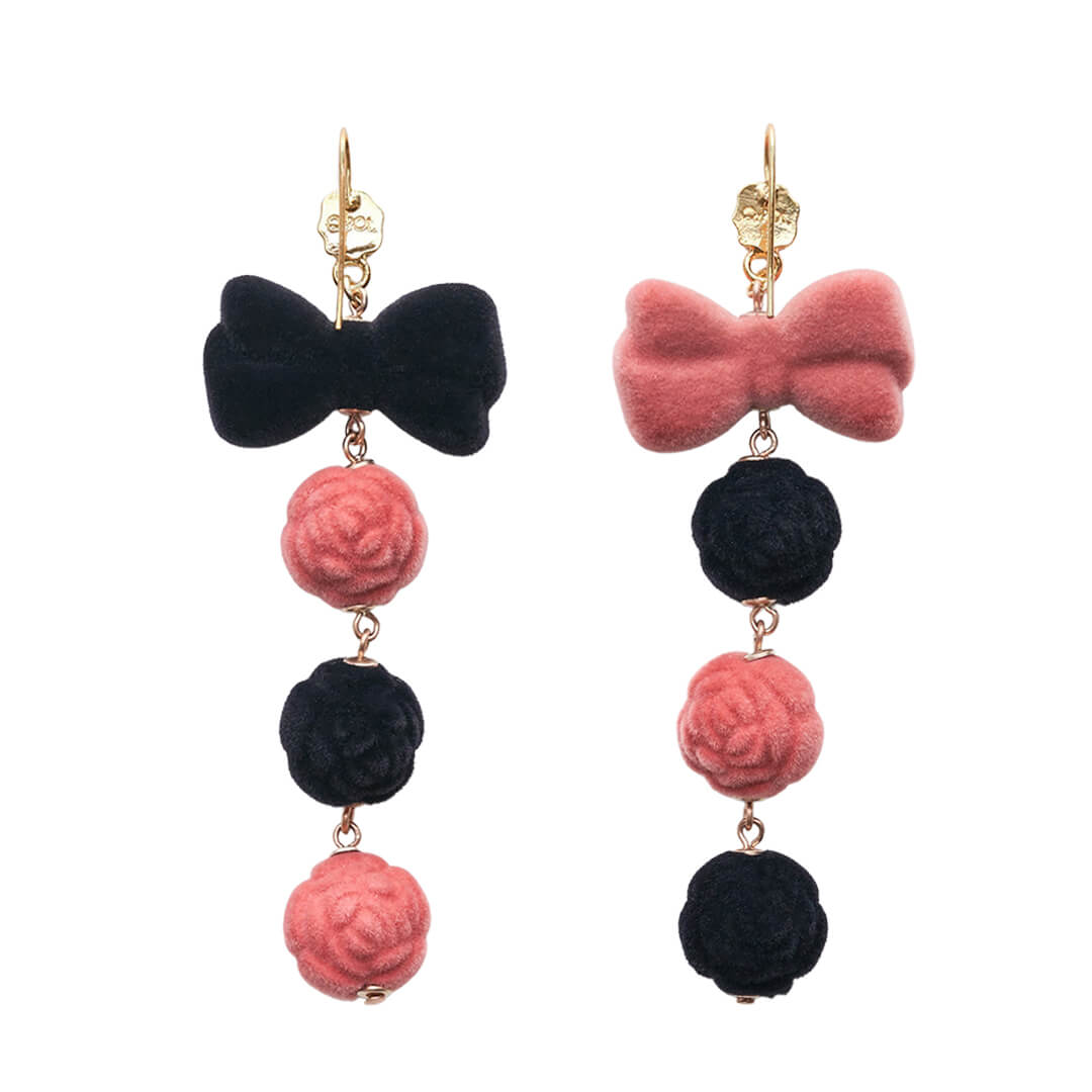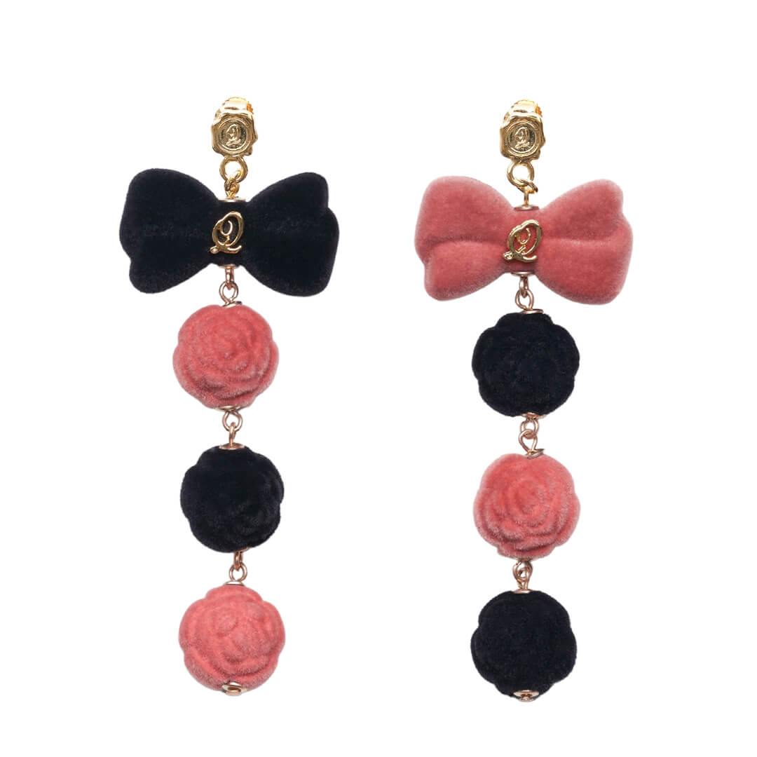 Flocky Black & Pink Ribbon Earrings (Pair)【Japan Jewelry】