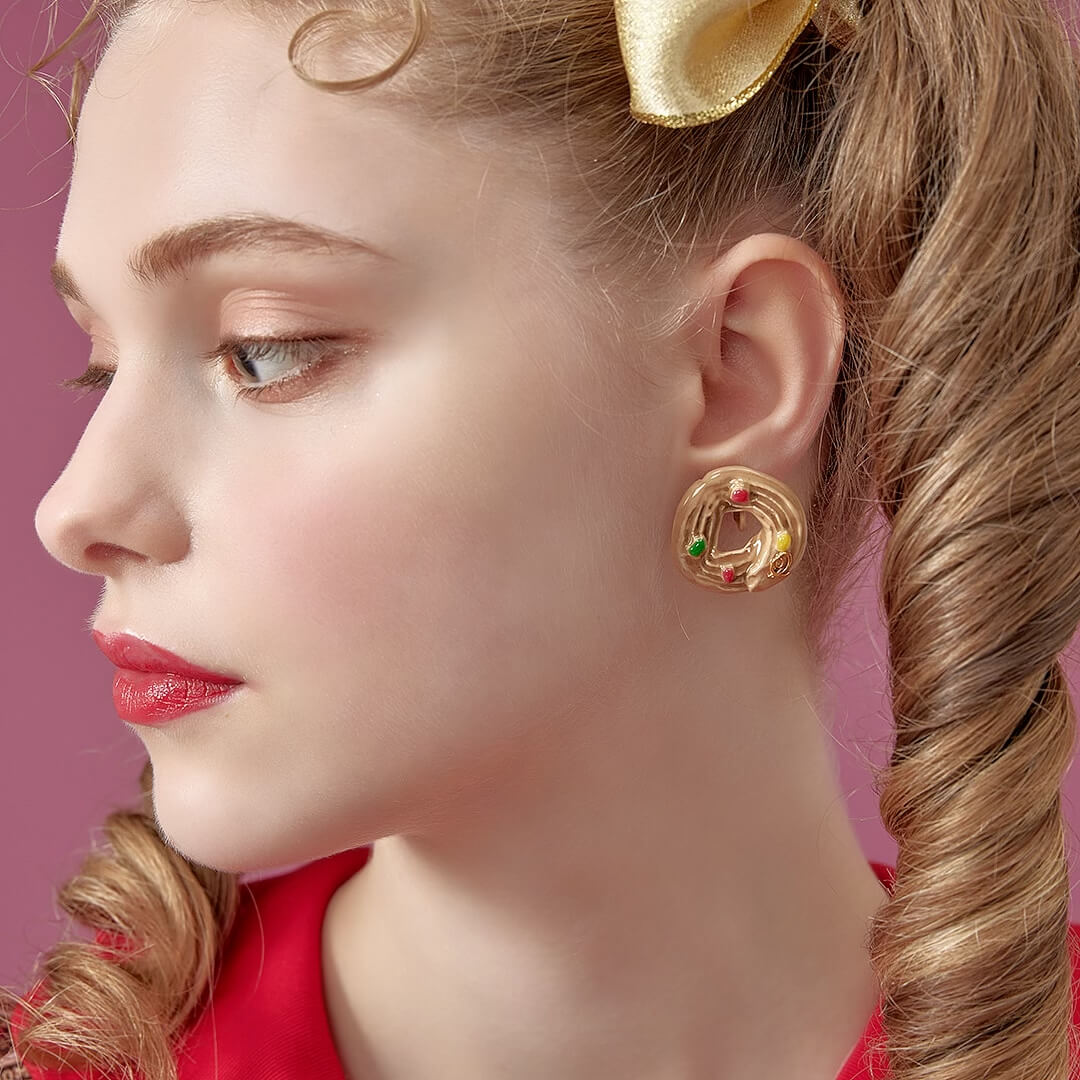 The colorful wreath cookie clip-on earring has a sparkling, luxurious finish with a gold Q logo.