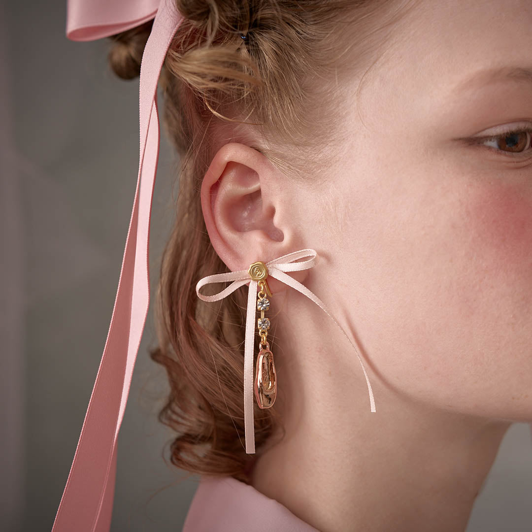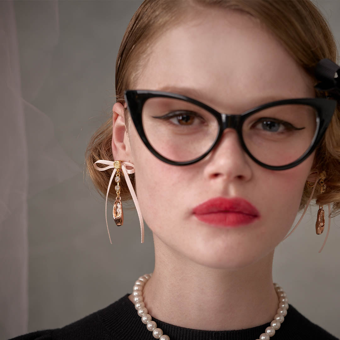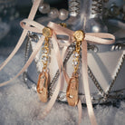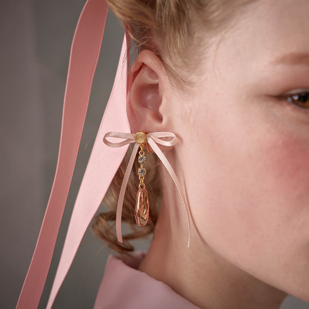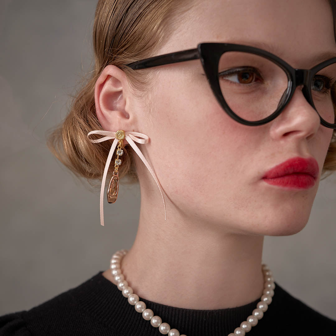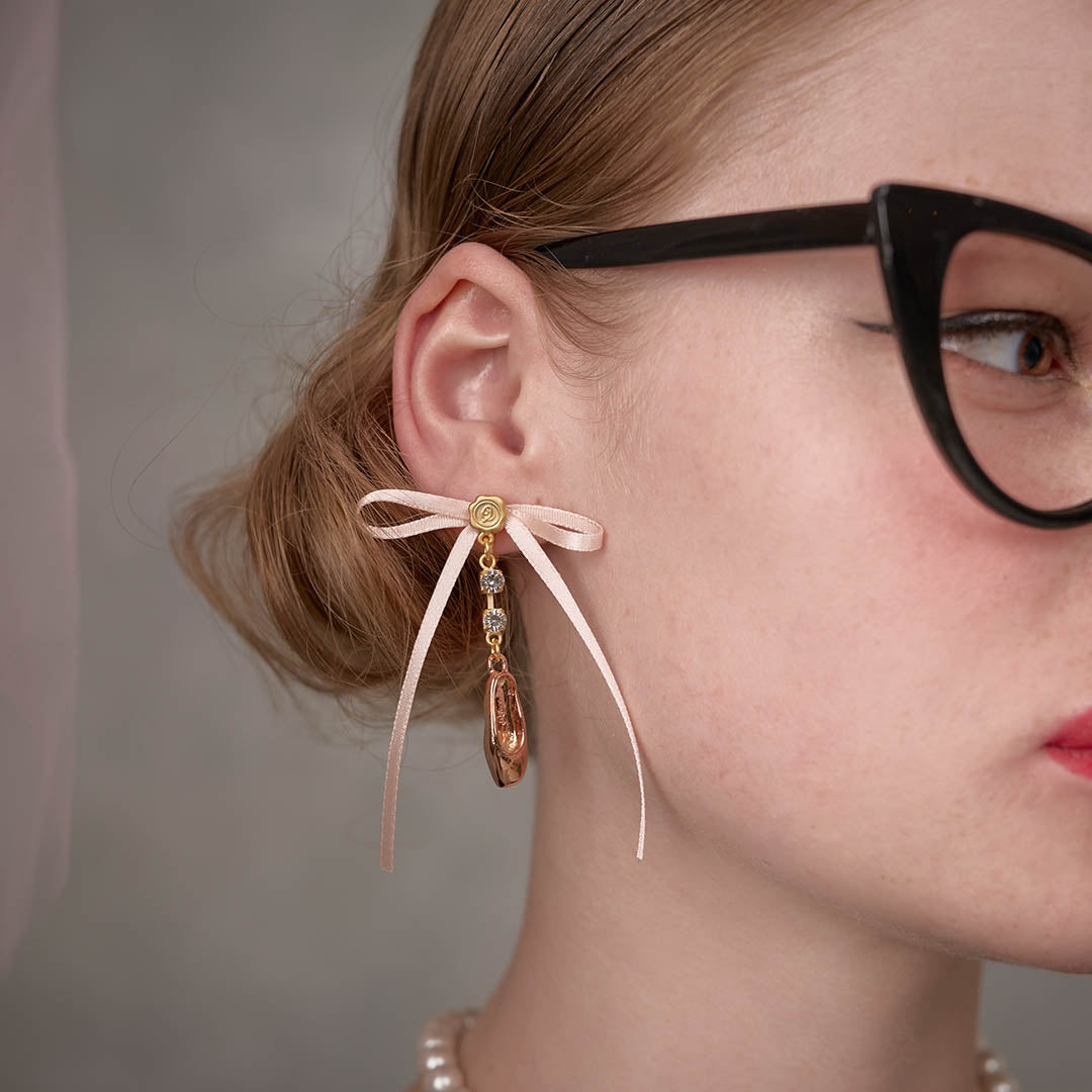 The earrings feature the iconic "pointe shoes" motif, a symbol of graceful ballerinas. The sparkling crystal glasses sway gently with every movement, adding a romantic touch. Delicate satin ribbons curve beautifully, evoking the elegant motion of a ballerina in dance.