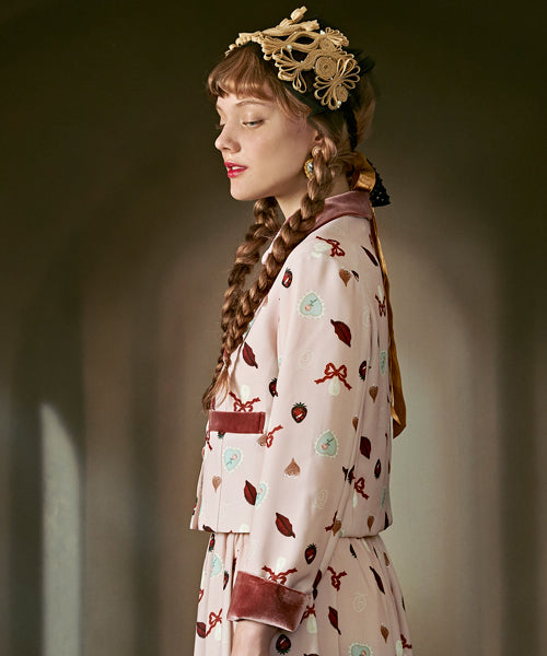 The jacket that you can enjoy a matching cloth with skirt. You can also roll up the sleeves and show the velvet part. From the fabric to the sewing, Q-pot. Dress line is all handmade in Japan. It's a special piece that has been finished with attention to detail and high sewing skill.