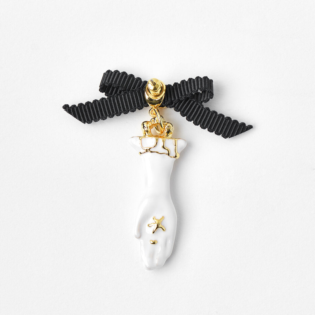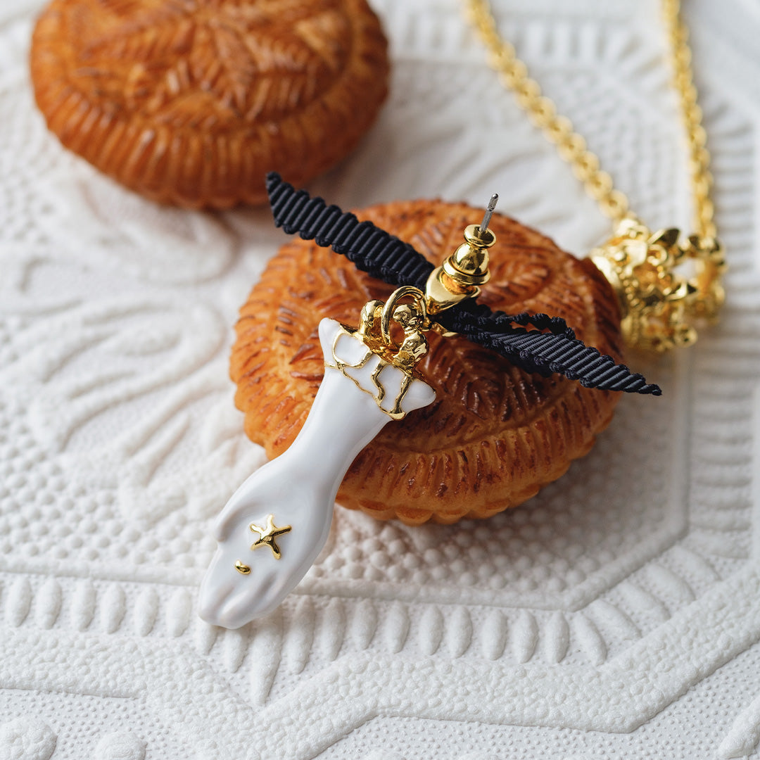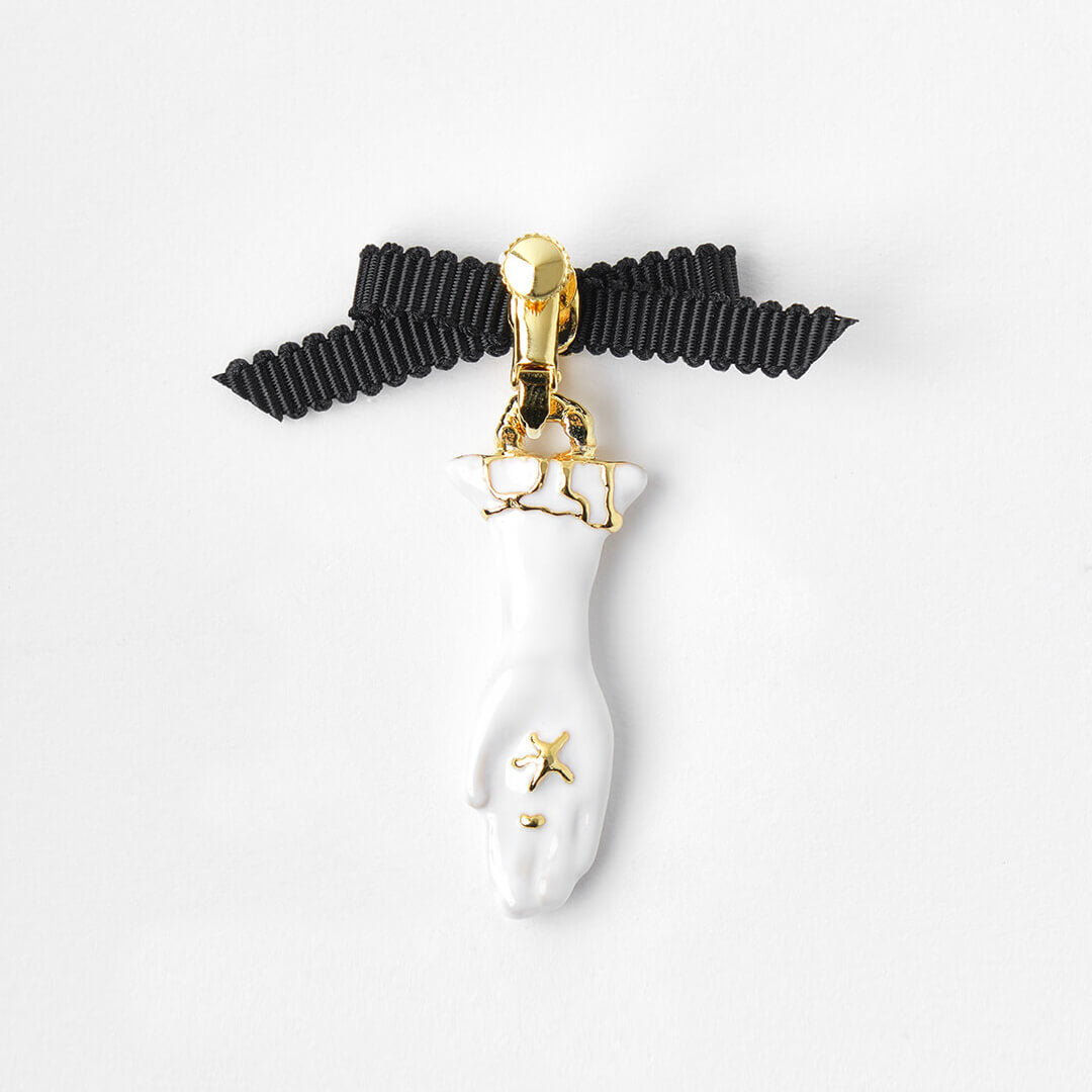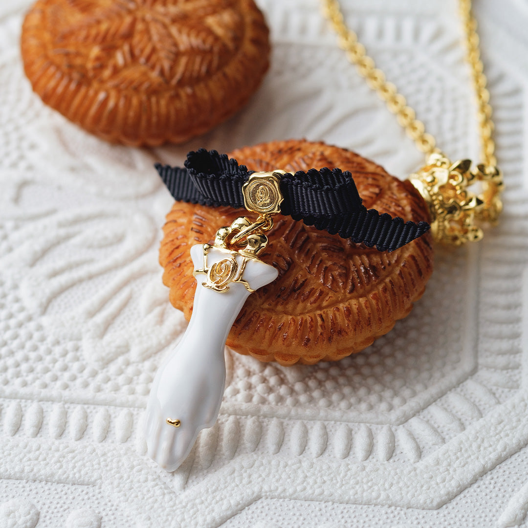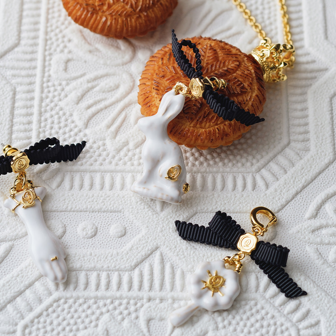 The feve jewelry with such a blessing mood is a premonition that happiness will come by wearing it! Choose your favorite feve according to your wishes. Epoxy resin-finished porcelain-like motif decorated with dazzling gold-colored Q mark on it and classical grosgrain ribbon at the top.