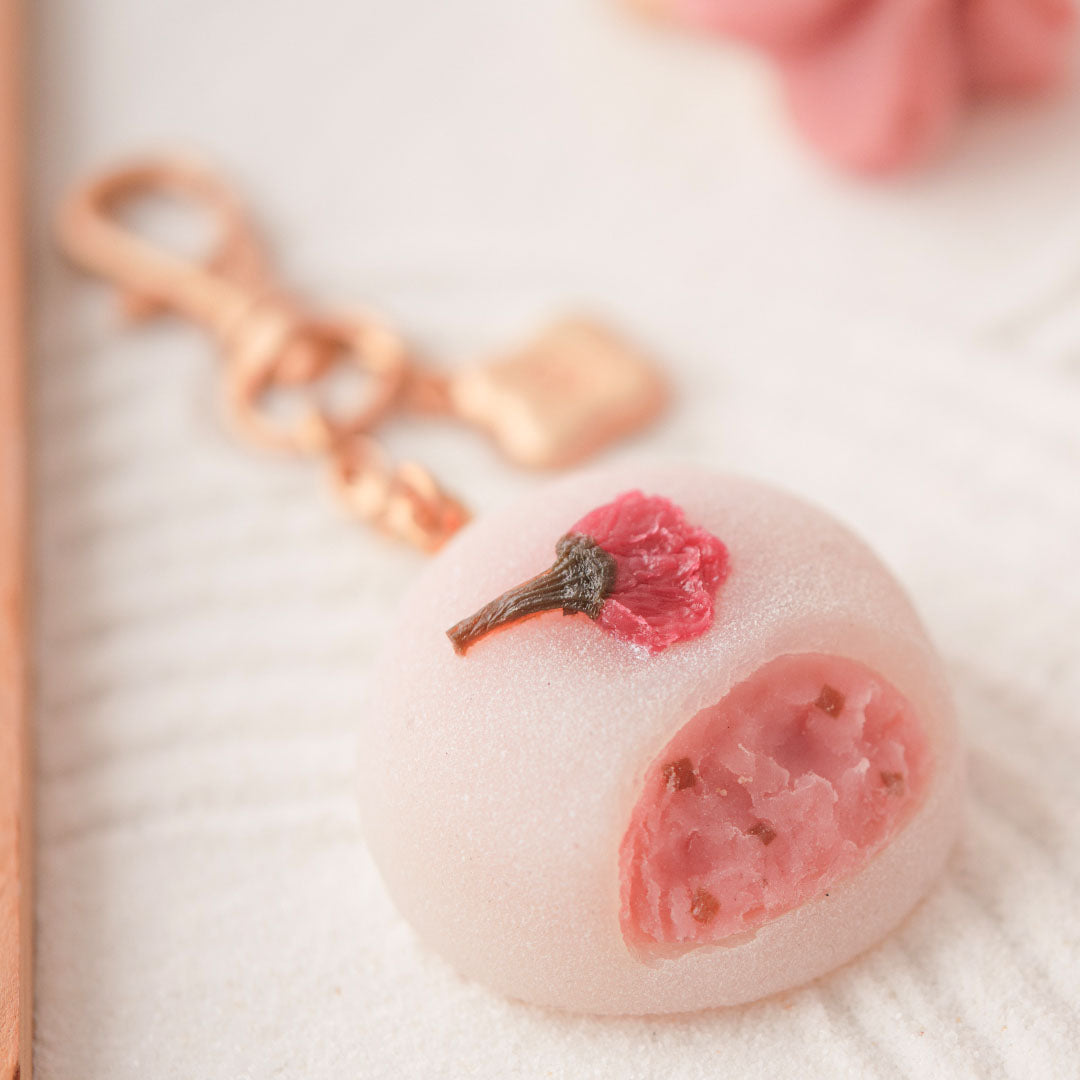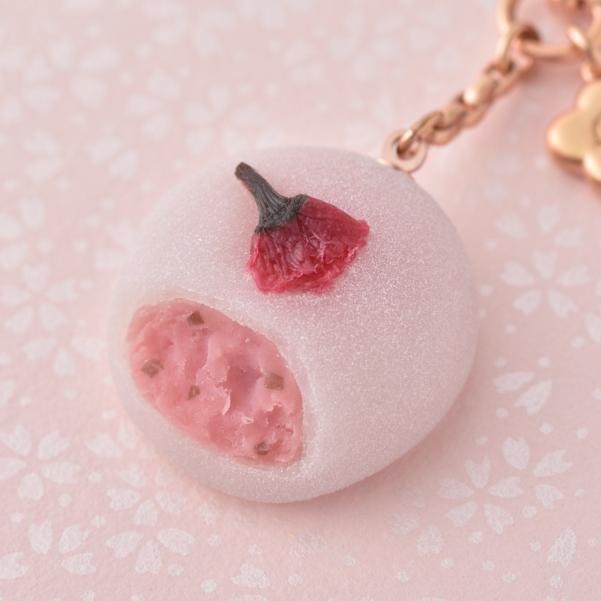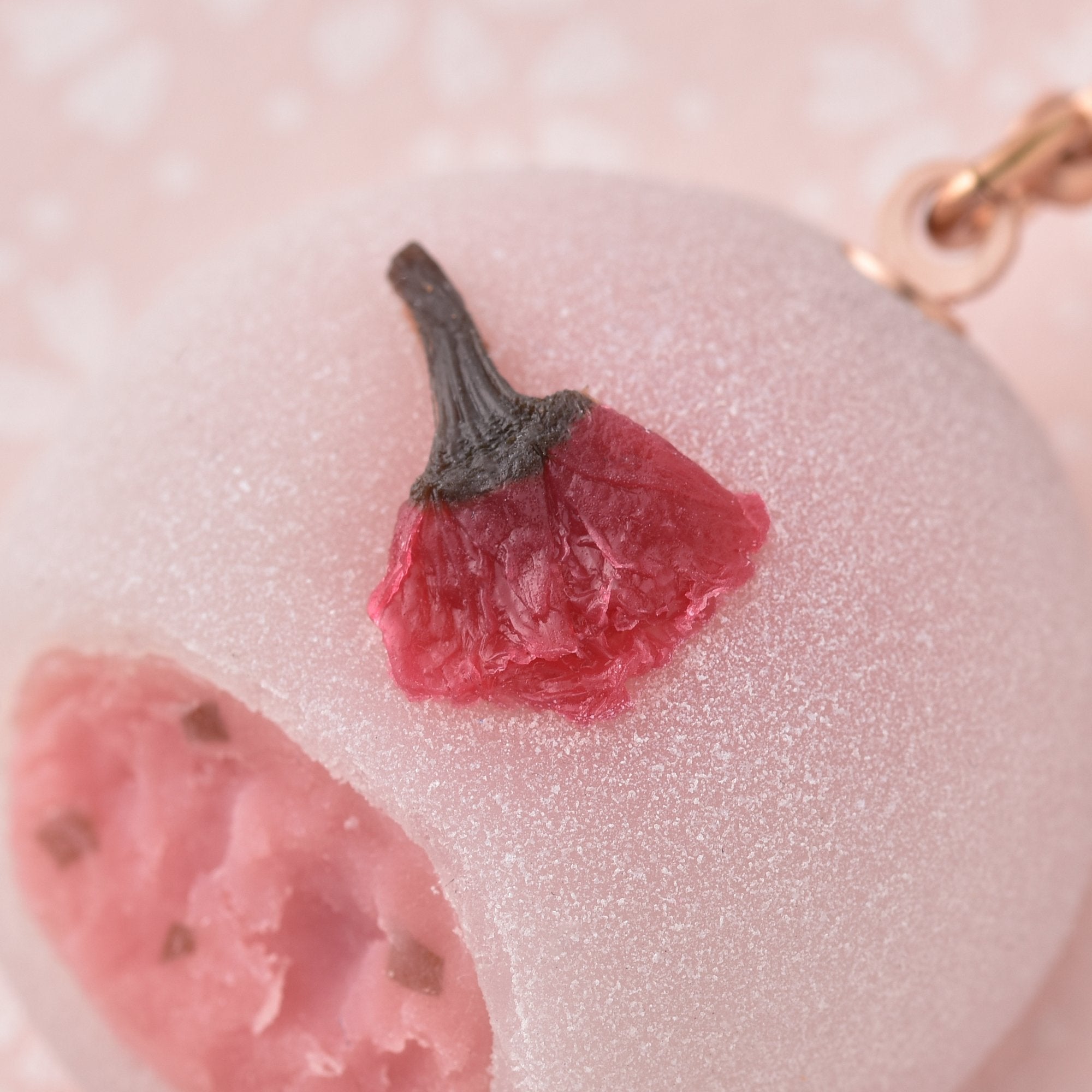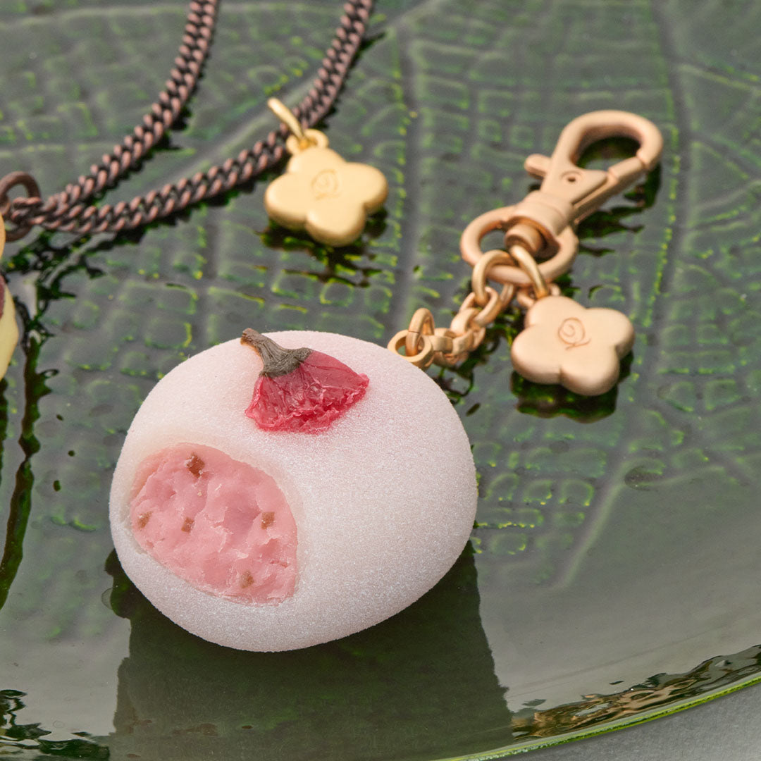 The salty leaf of sakura and the sweetness of white bean paste match in a harmony. Sakura bean paste and soft mochi around it, with a salt pickled cherry blossom on it. The detail of it is so charming that you can’t ignore. The sakura bean paste can be saw through the mochi, which makes it looks so real. Attached with a pink gold charm looks like Japanese family crest with it.