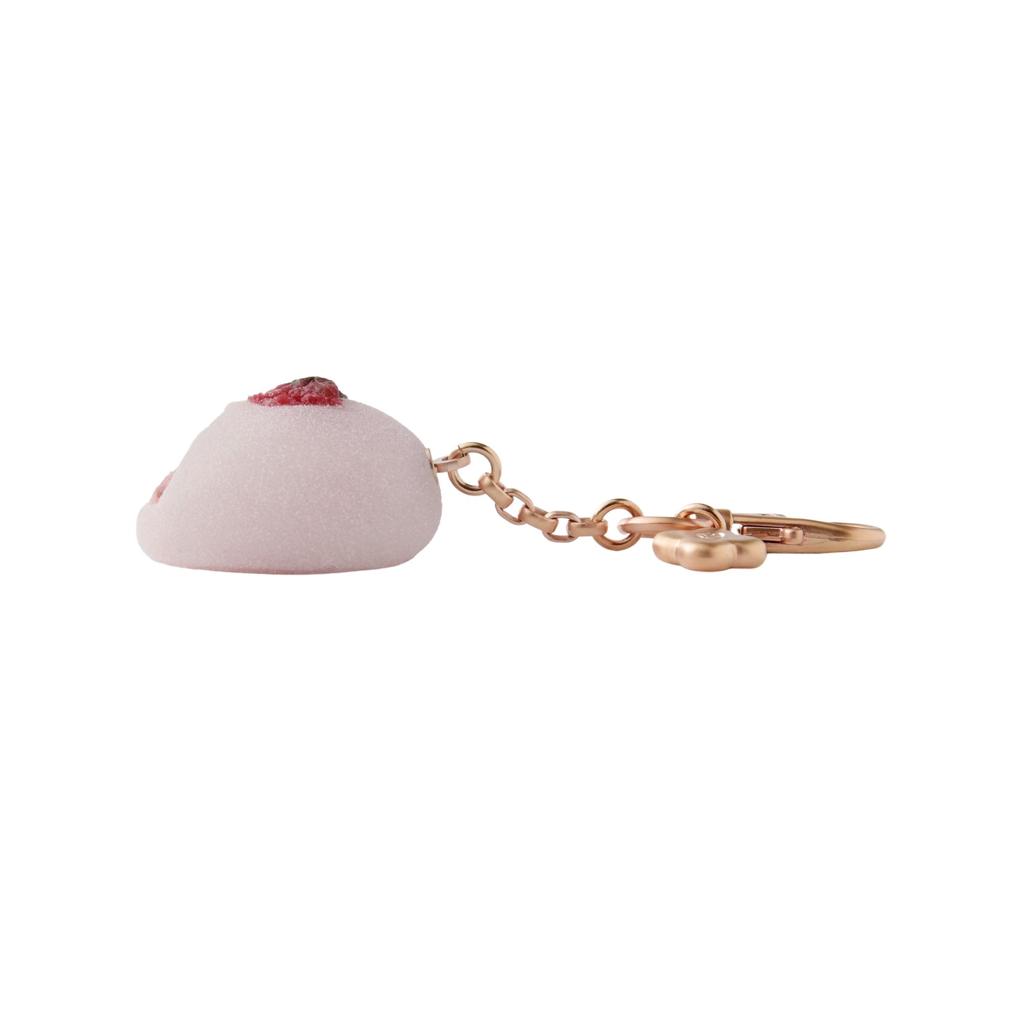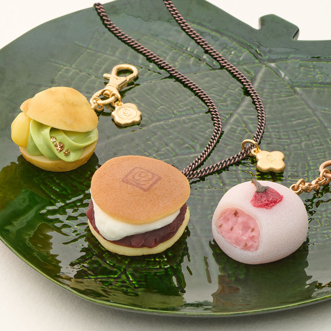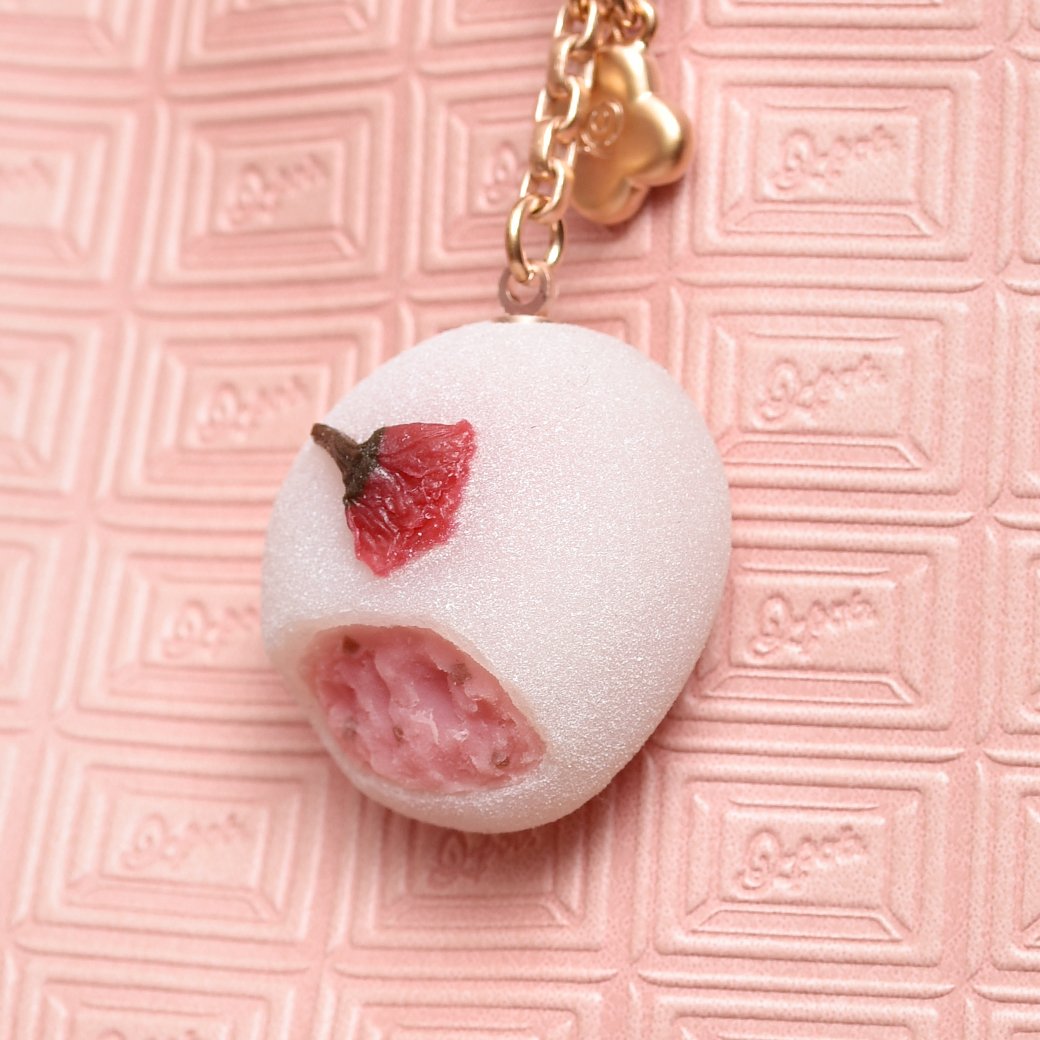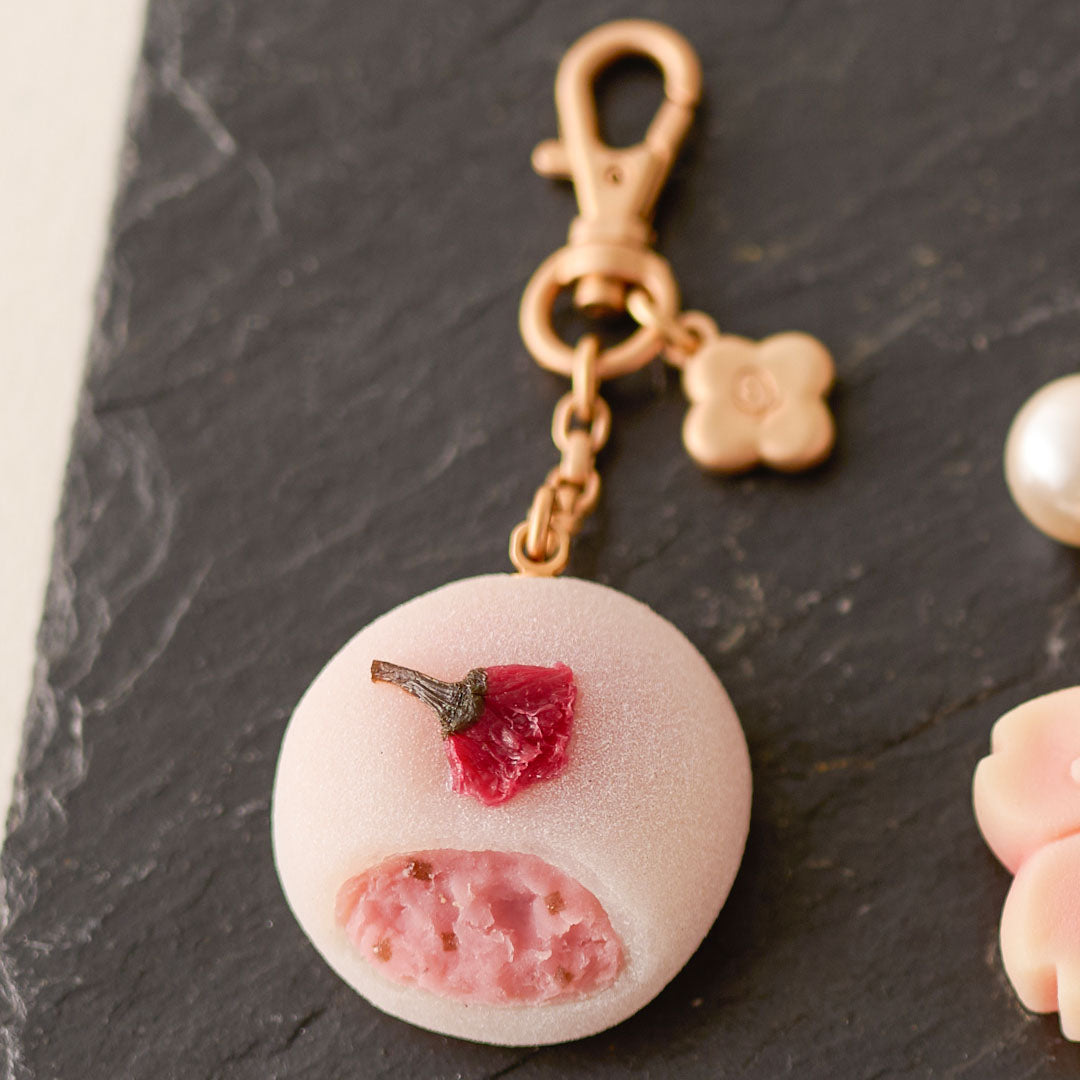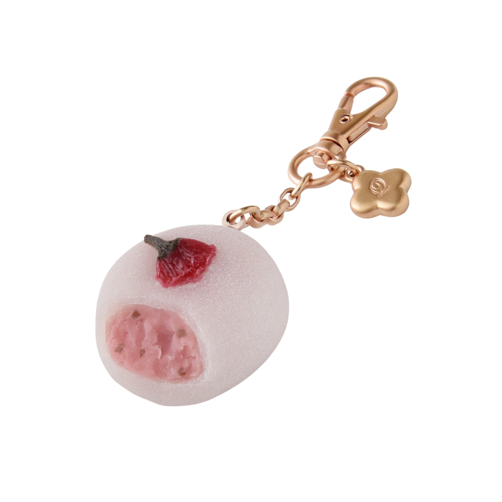 The salty leaf of sakura and the sweetness of white bean paste match in a harmony. Sakura bean paste and soft mochi around it, with a salt pickled cherry blossom on it. The detail of it is so charming that you can’t ignore. The sakura bean paste can be saw through the mochi, which makes it looks so real. Attached with a pink gold charm looks like Japanese family crest with it.