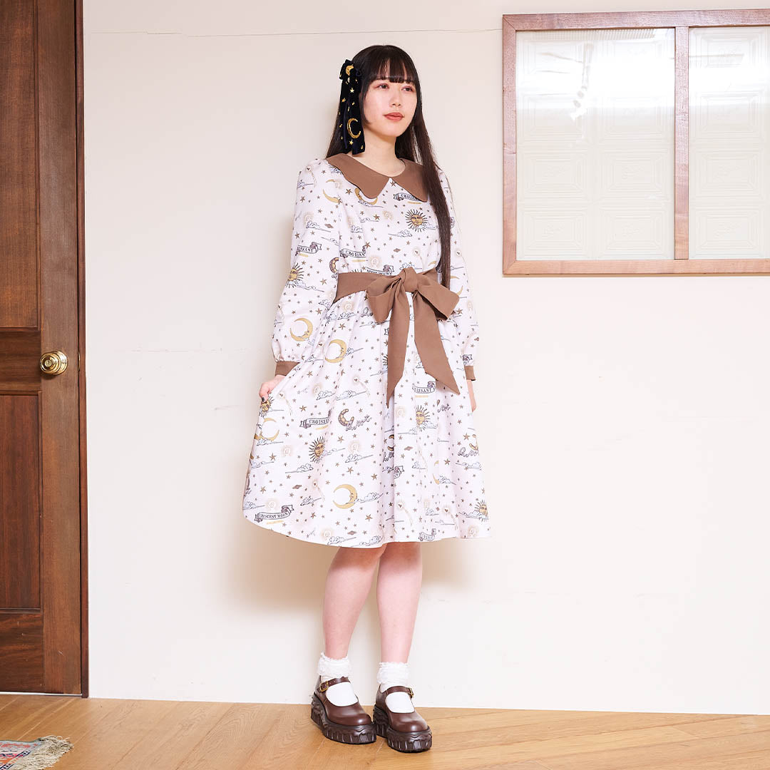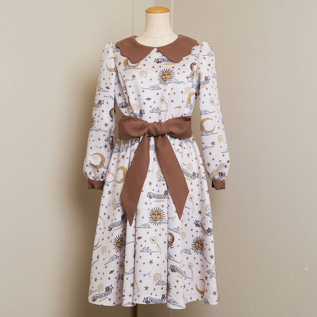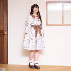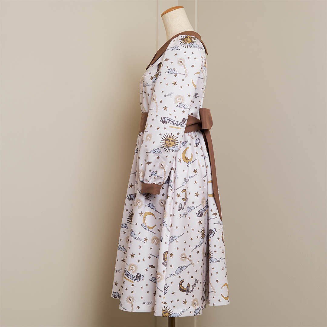 This charming one-piece dress features soft, rounded puff sleeves and a melting-shaped collar, creating a feminine silhouette with a graceful flow. The waist ribbon adds a chic accent, and can be tied at the front or back, or removed entirely for versatile styling.