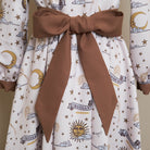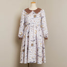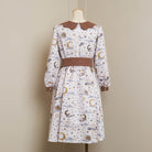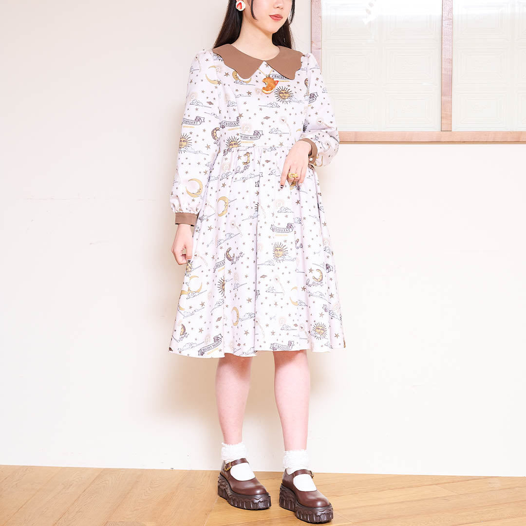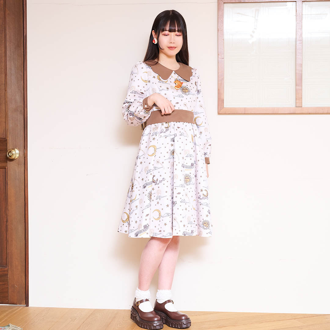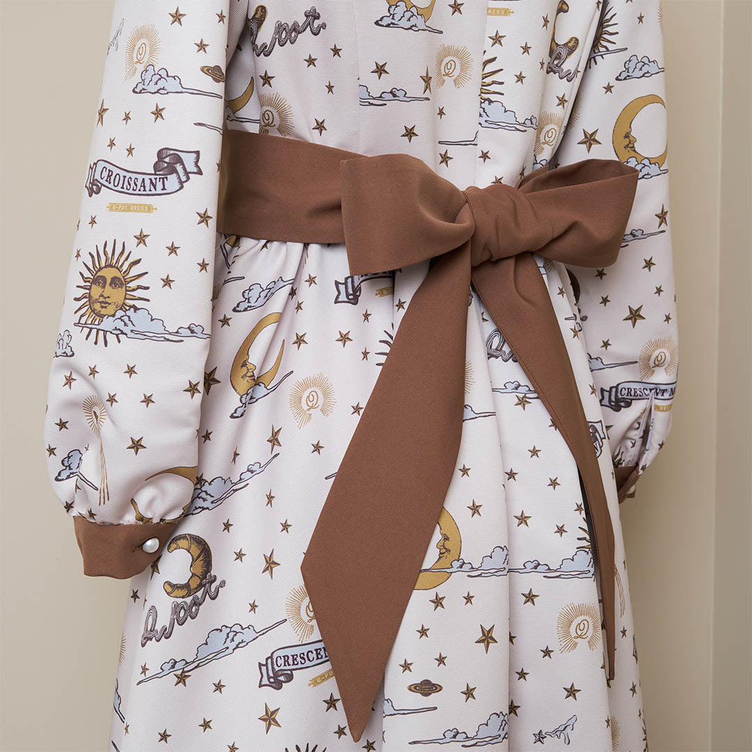 This charming one-piece dress features soft, rounded puff sleeves and a melting-shaped collar, creating a feminine silhouette with a graceful flow. The waist ribbon adds a chic accent, and can be tied at the front or back, or removed entirely for versatile styling.