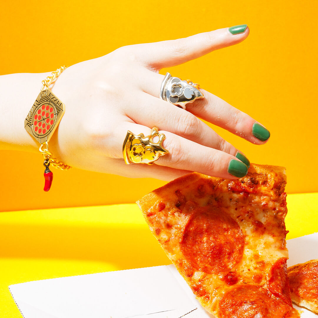 Loaded with toppings like mushrooms, salami, and peppers, it's full of flavor and visually striking. The melted cheese stretches to form a perfect ring, making this ring a delightful accessory inspired by everyone's favorite pizza moment.