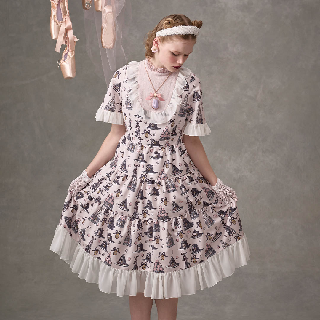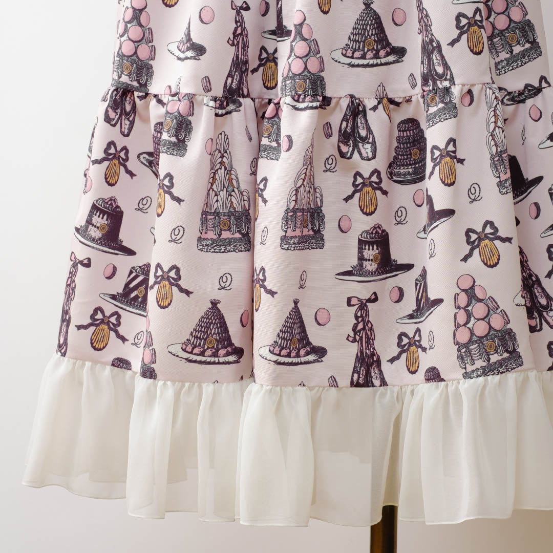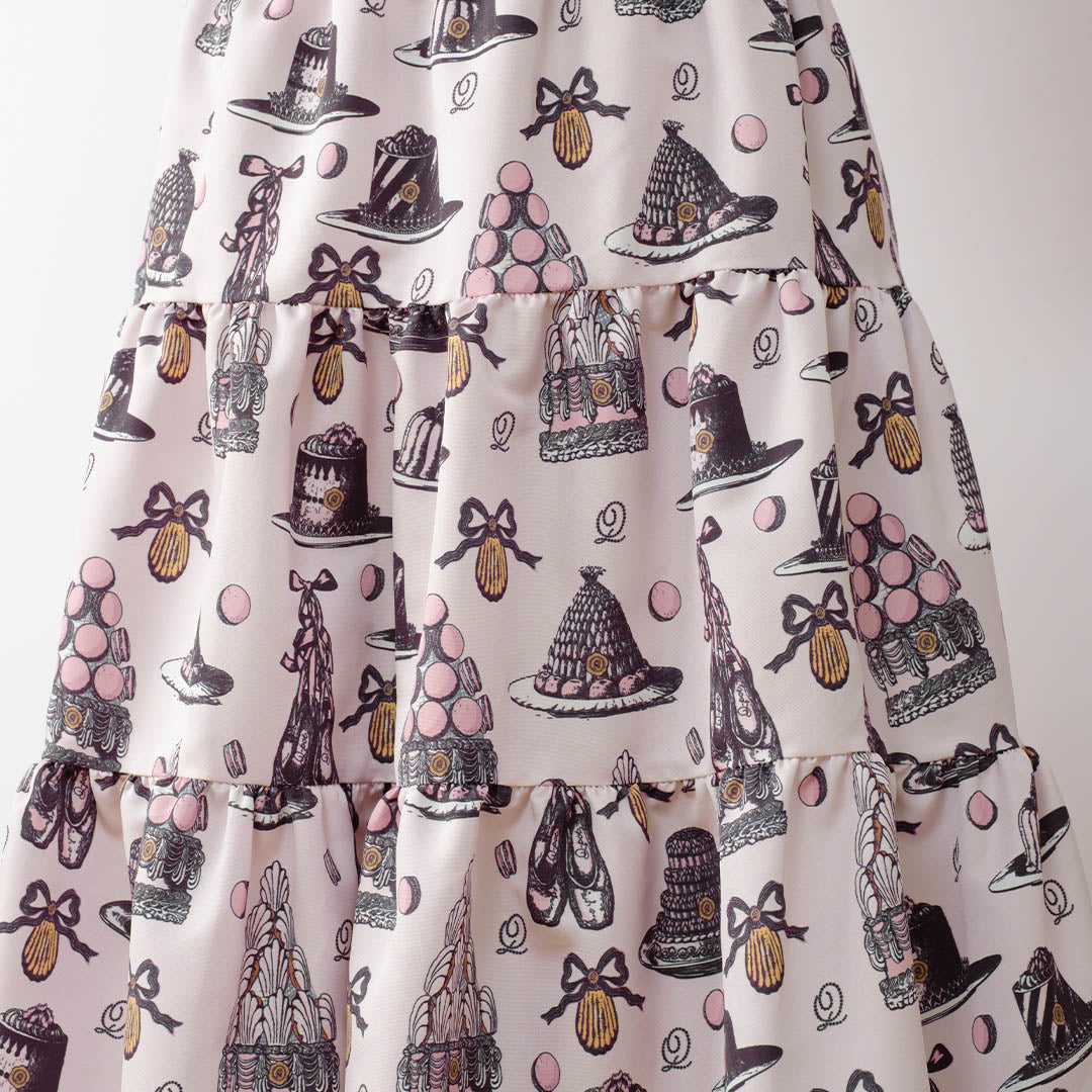 An original textile dress featuring a classical and elegant sweetness, adorned with iconic ballerina pointe shoes, madeleines, romantic cakes and macarons topped with whipped cream styled like delicate tutus.
