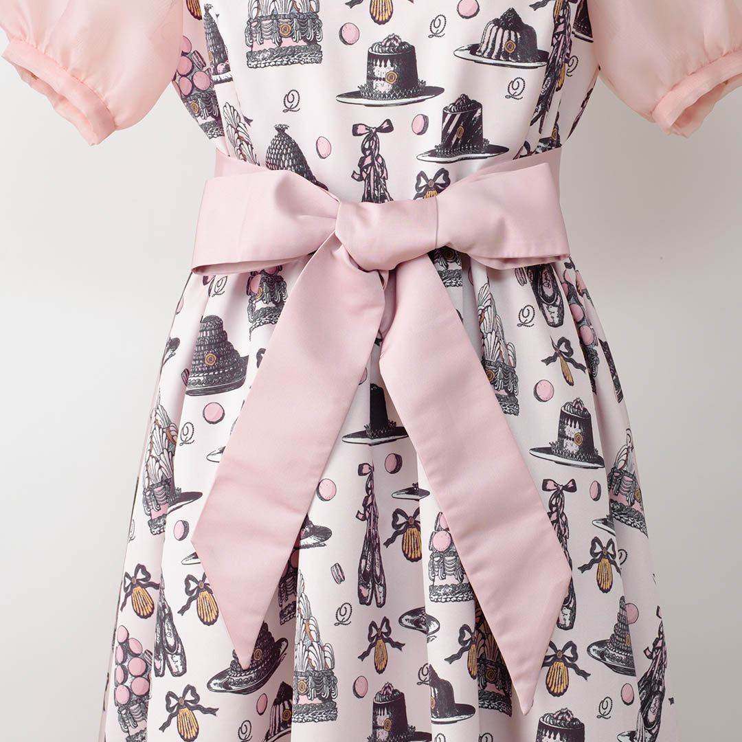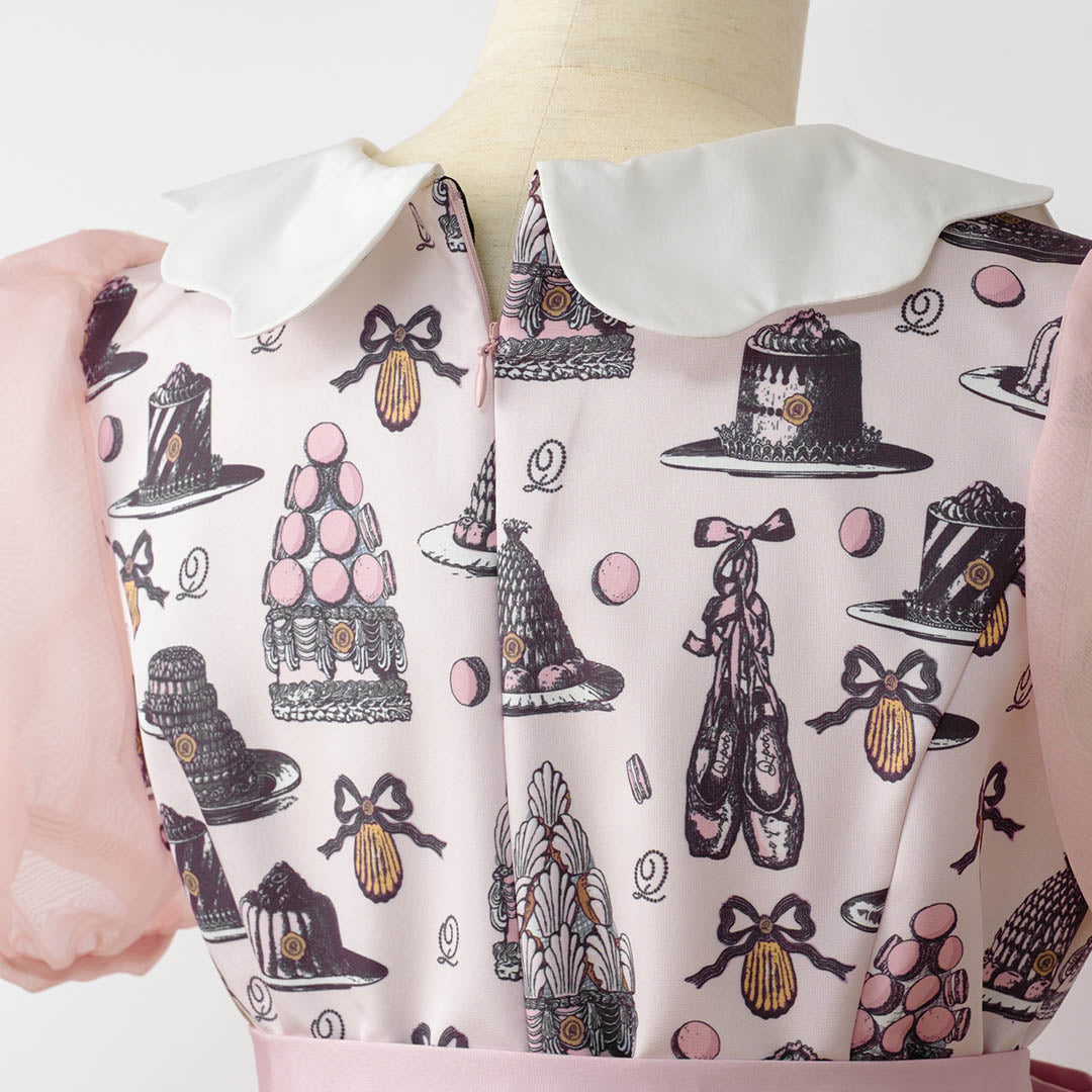 An original textile dress featuring a classical and elegant sweetness, adorned with iconic ballerina pointe shoes, madeleines, romantic cakes and macarons topped with whipped cream styled like delicate tutus.