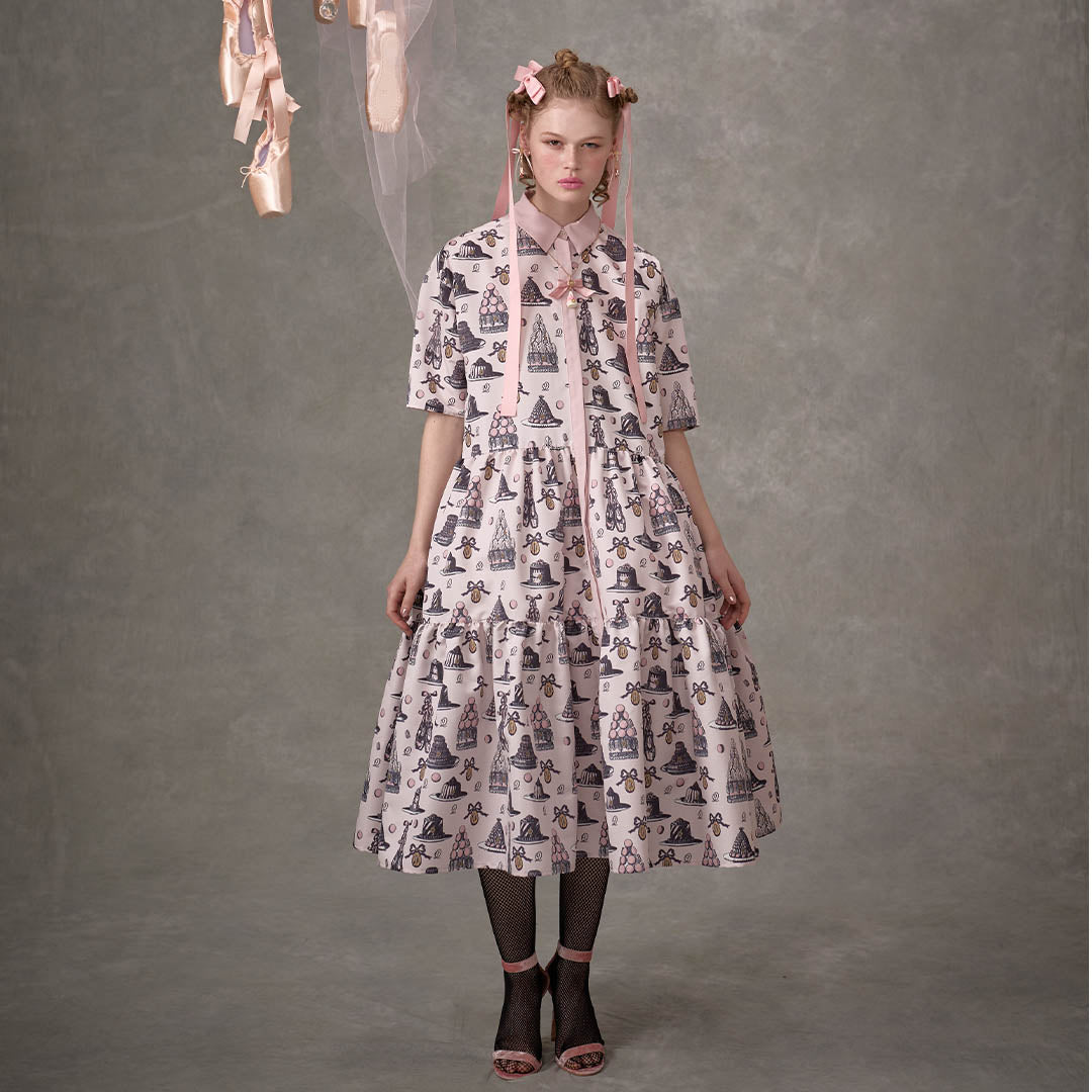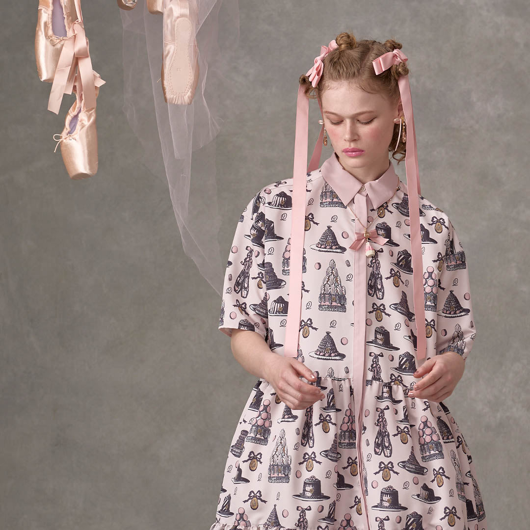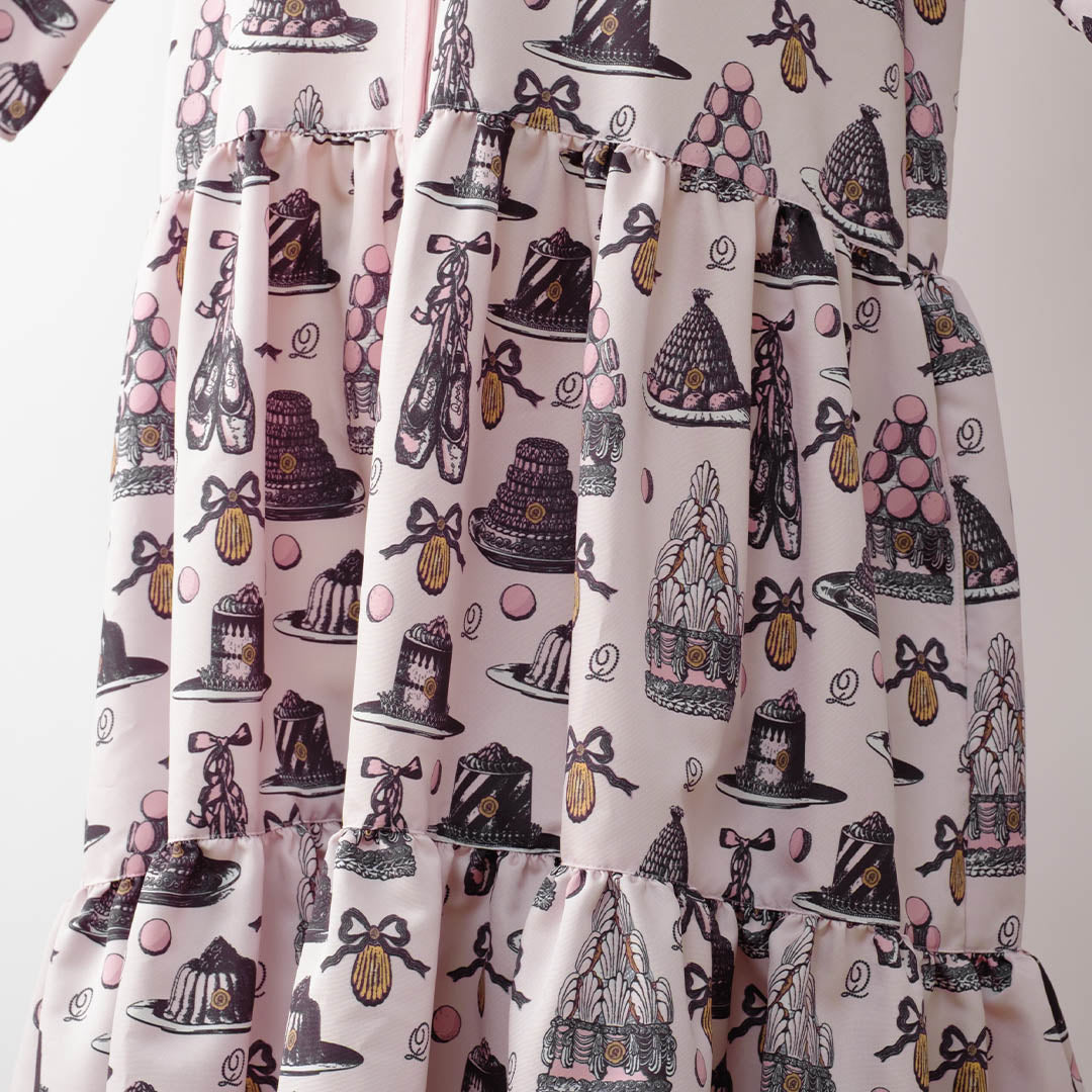 An original textile dress featuring a classical and elegant sweetness, adorned with iconic ballerina pointe shoes, madeleines, romantic cakes and macarons topped with whipped cream styled like delicate tutus.