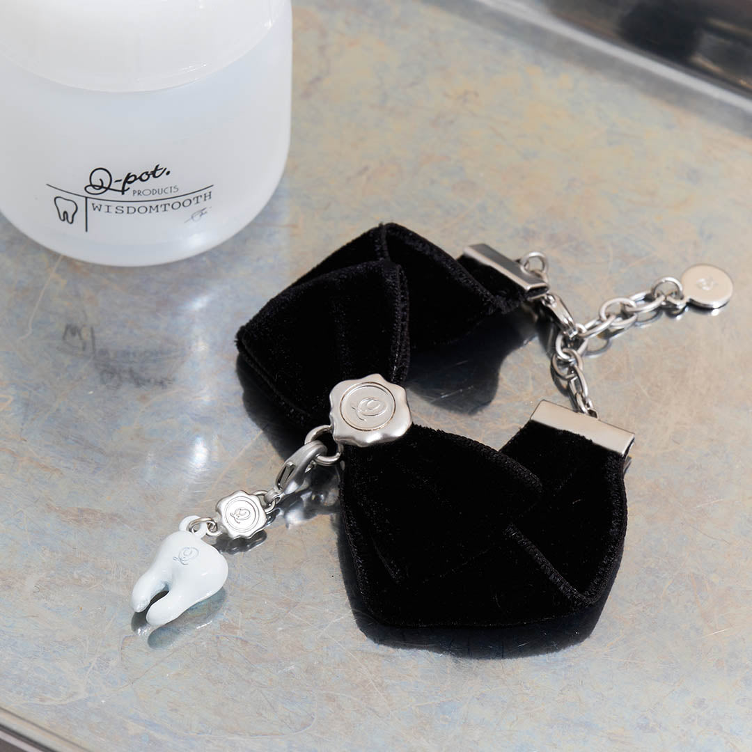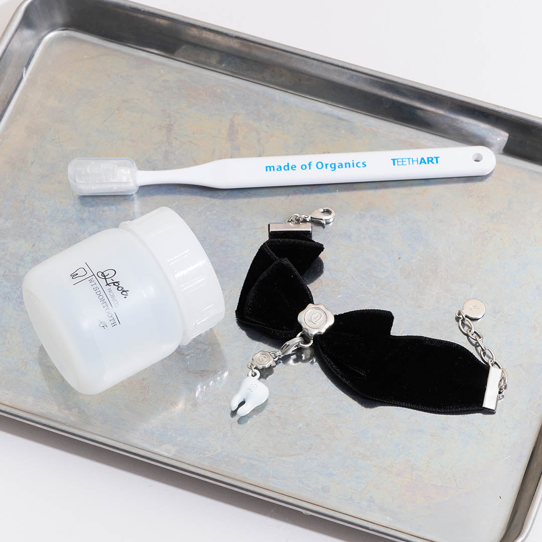 A piece of sparkling, whitened tooth with a "Q" logo in the middle of the tooth. Made in Japan, and each piece is carefully finished by craftsmen.