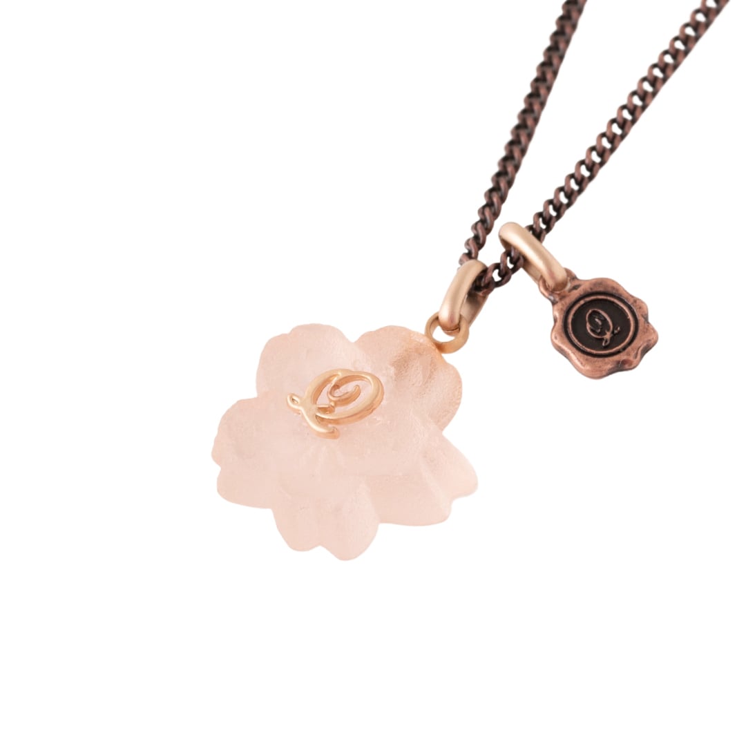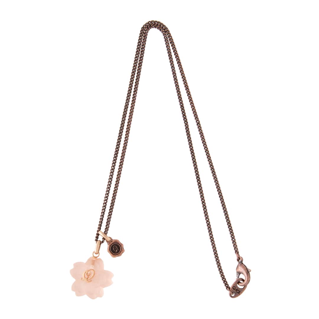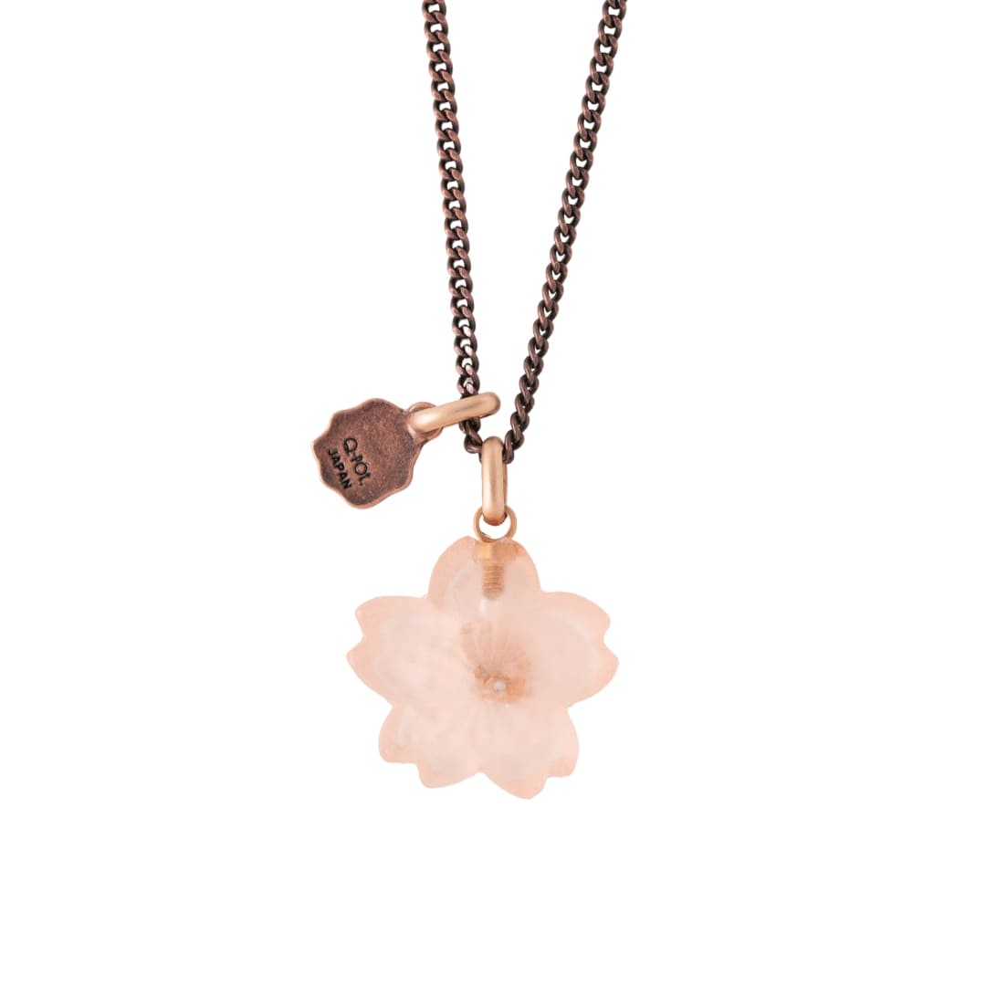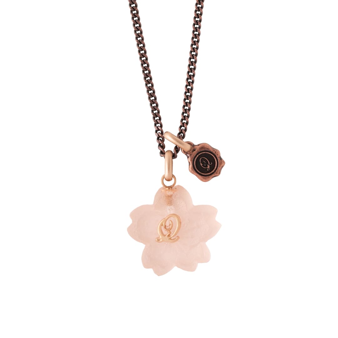 An elegant necklace decorated with the translucent Sakura Wasanbon. A bronze chain like a branch of Sakura finished with a Q logo plate.