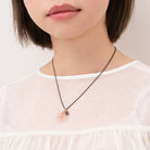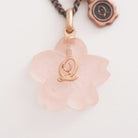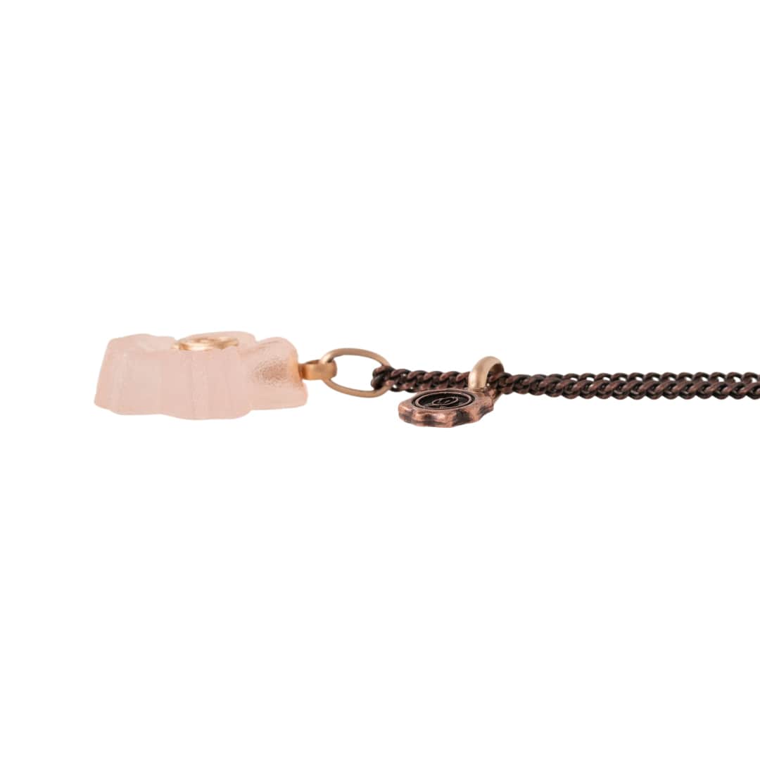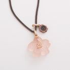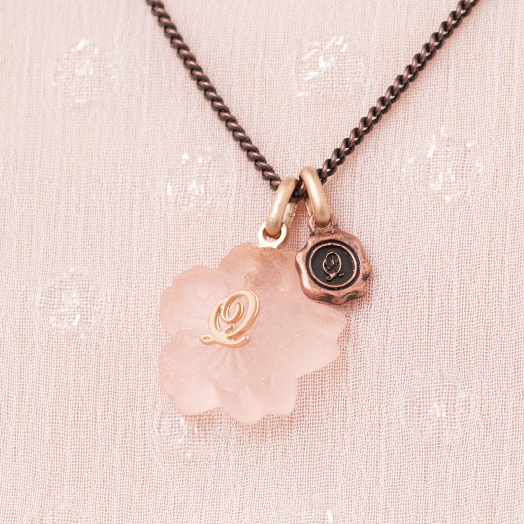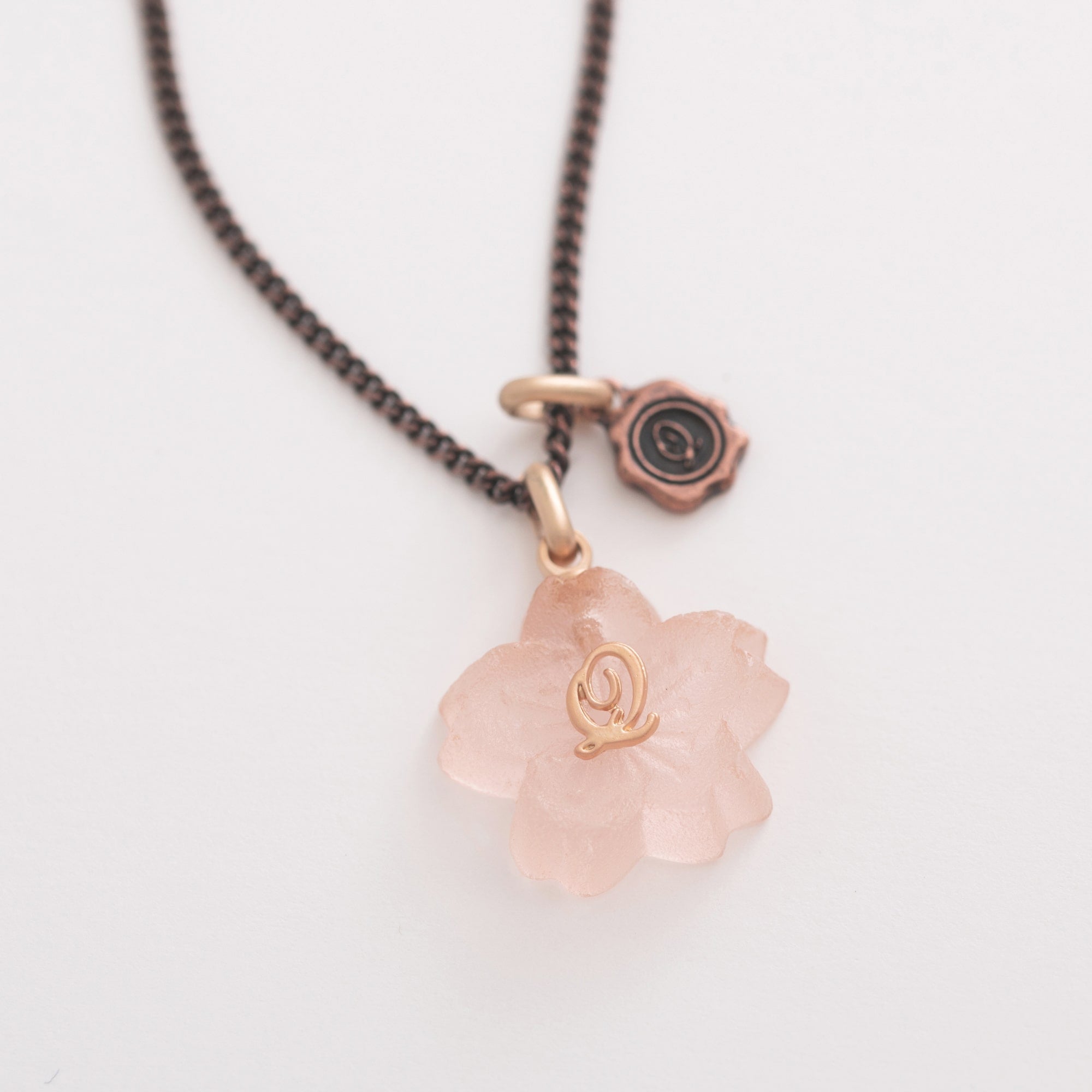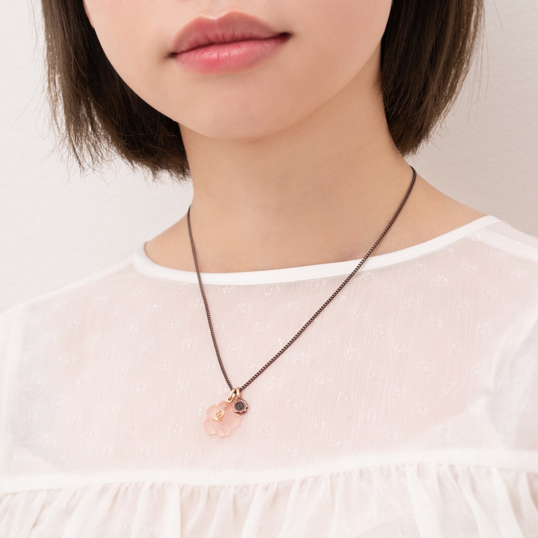 An elegant necklace decorated with the translucent Sakura Wasanbon. A bronze chain like a branch of Sakura finished with a Q logo plate.