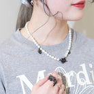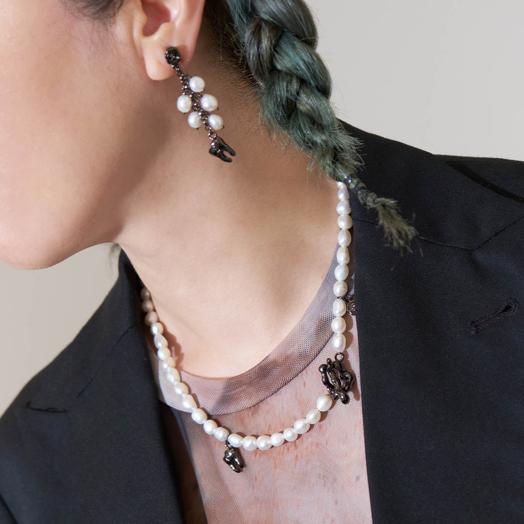 The tooth motif, iconic to Q-pot., is featured in this stylish natural stone necklace, blending the elegance of pearls with the surrealism of a tooth. Baroque freshwater pearls are strung like perfect teeth, adorned with a piece of bad tooth with cavity.