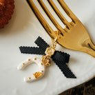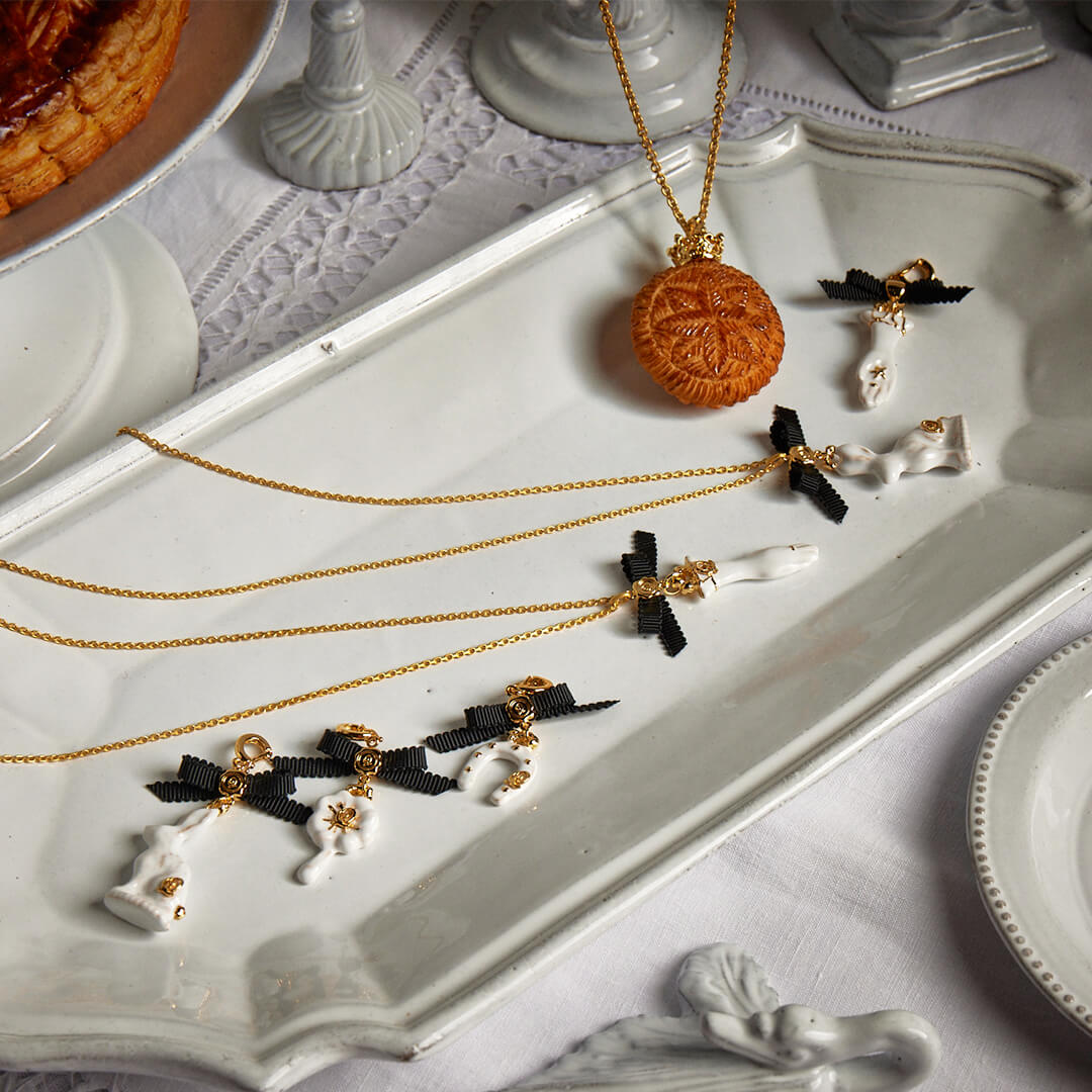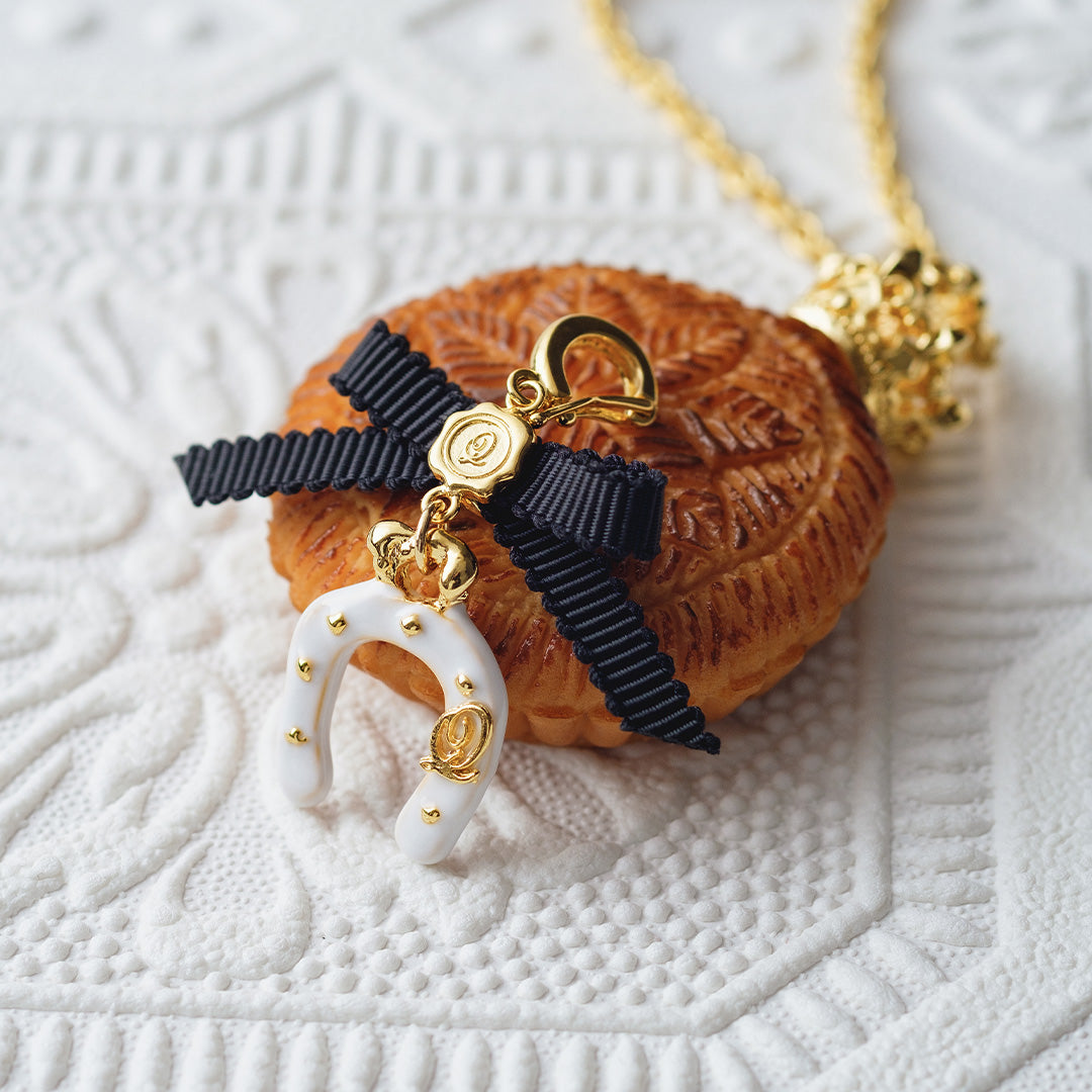 The feve jewelry with such a blessing mood is a premonition that happiness will come by wearing it! Choose your favorite feve according to your wishes. Epoxy resin-finished porcelain-like motif decorated with dazzling gold-colored Q mark on it and classical grosgrain ribbon at the top.
