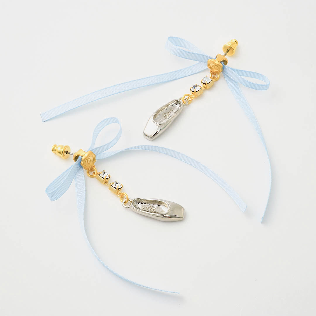 The pointe shoes, as if capturing the stage lights, are adorned with delicate satin ribbons that trace the beautiful arc of a dancer in motion.