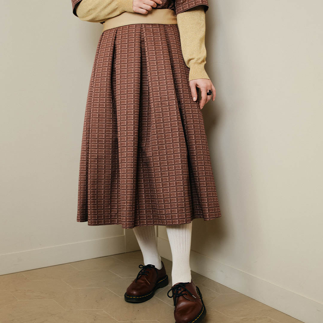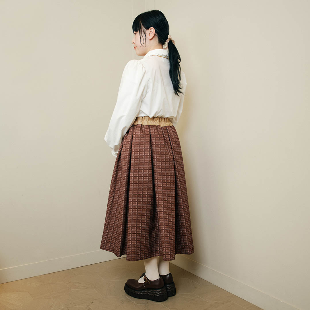 The tucked skirt has a pleated silhouette. The flare skirt with longer length is elegant and luxurious. The waist on the back with adjustable rubber and attached with a pocket.