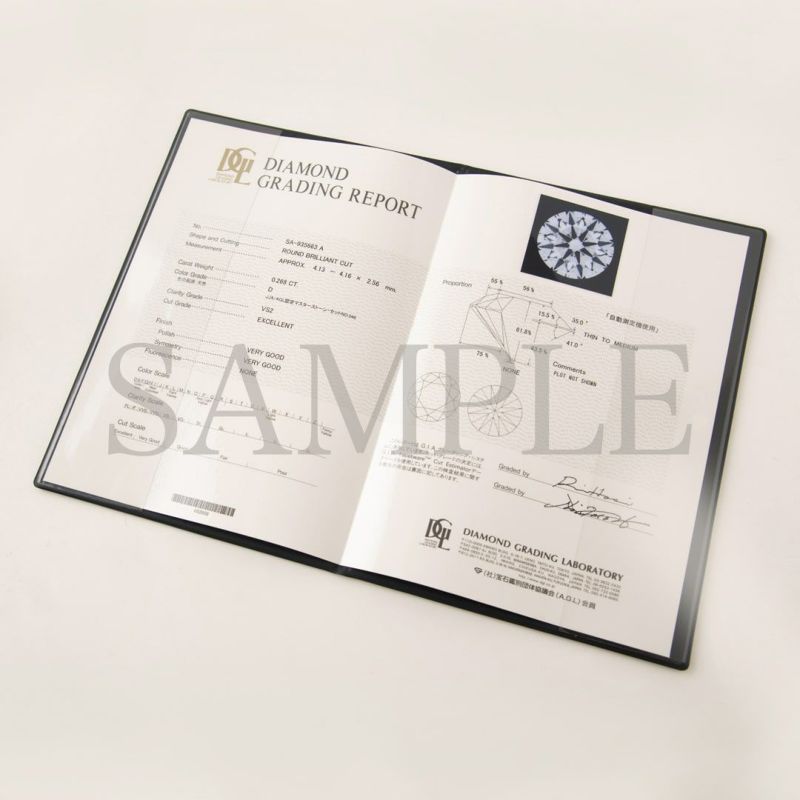 Comes with a diamond grading report evaluated by an appraisal organization that is affiliated with A.G.L. The certificate certifies the results of the natural diamond's 4Cs (Carat, Color, Clarity, Cut), etc.