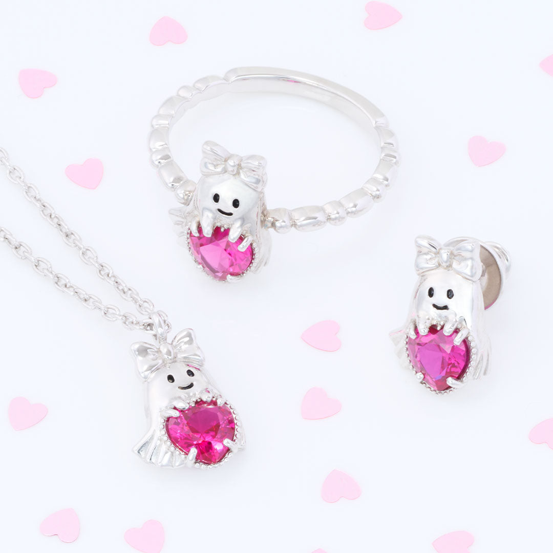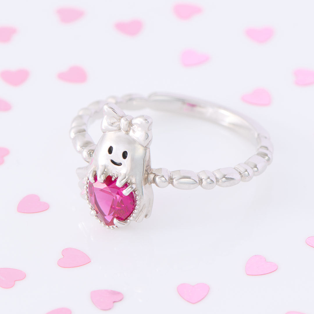Q-pot.’s smallest ever "Ghost Q" is all dressed up with a big ribbon, charmingly hugging a heart with an adorable expression. The heart, sparkling like candy, is made of a sophisticated synthetic ruby. The intricate frame surrounding the heart adds a luxurious touch. The delicate details of fluttering sheet as if the Ghost Q is floating in the air.