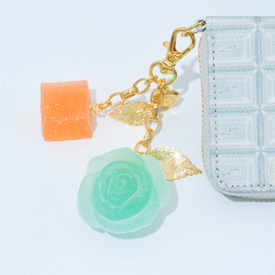 A glamorous bag charm featuring romantic rose pate de fruit and adorable bite-sized square pate de fruit. Its bold and eye-catching size adds a touch of elegance to any outfit.