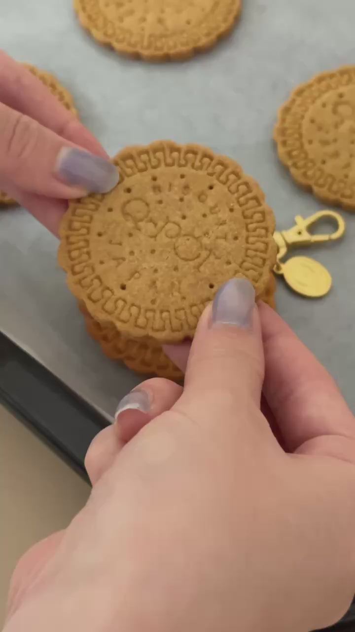 The round biscuit-shaped cookie features an original design with the Q-pot. logo and the word "BisQuit," making it irresistibly cute and realistic. With its bold size, this accessory becomes the centerpiece of any outfit. Wearing this playful and unique design is sure to spark delightful conversations and spread delicious communication!