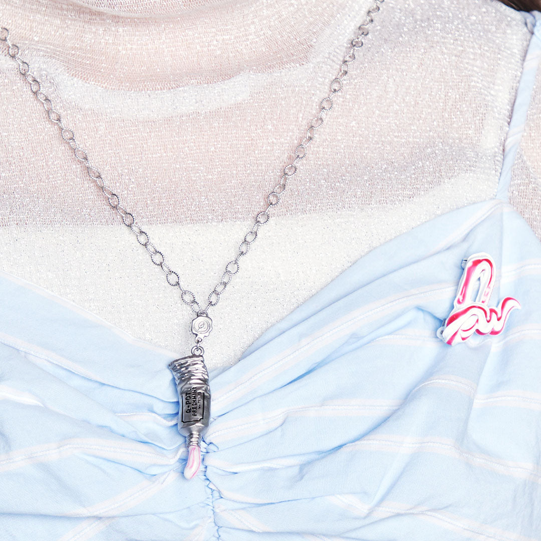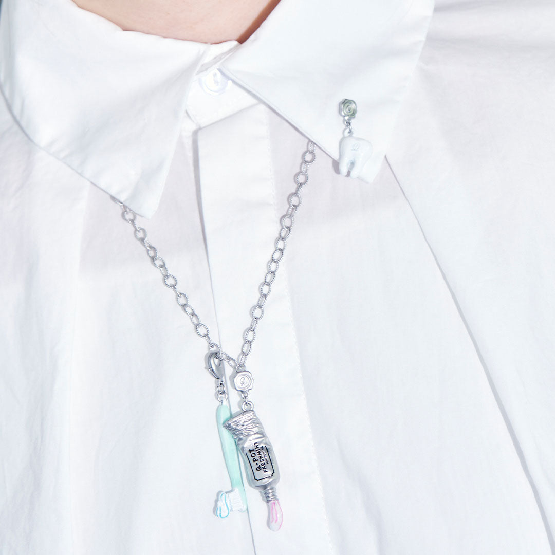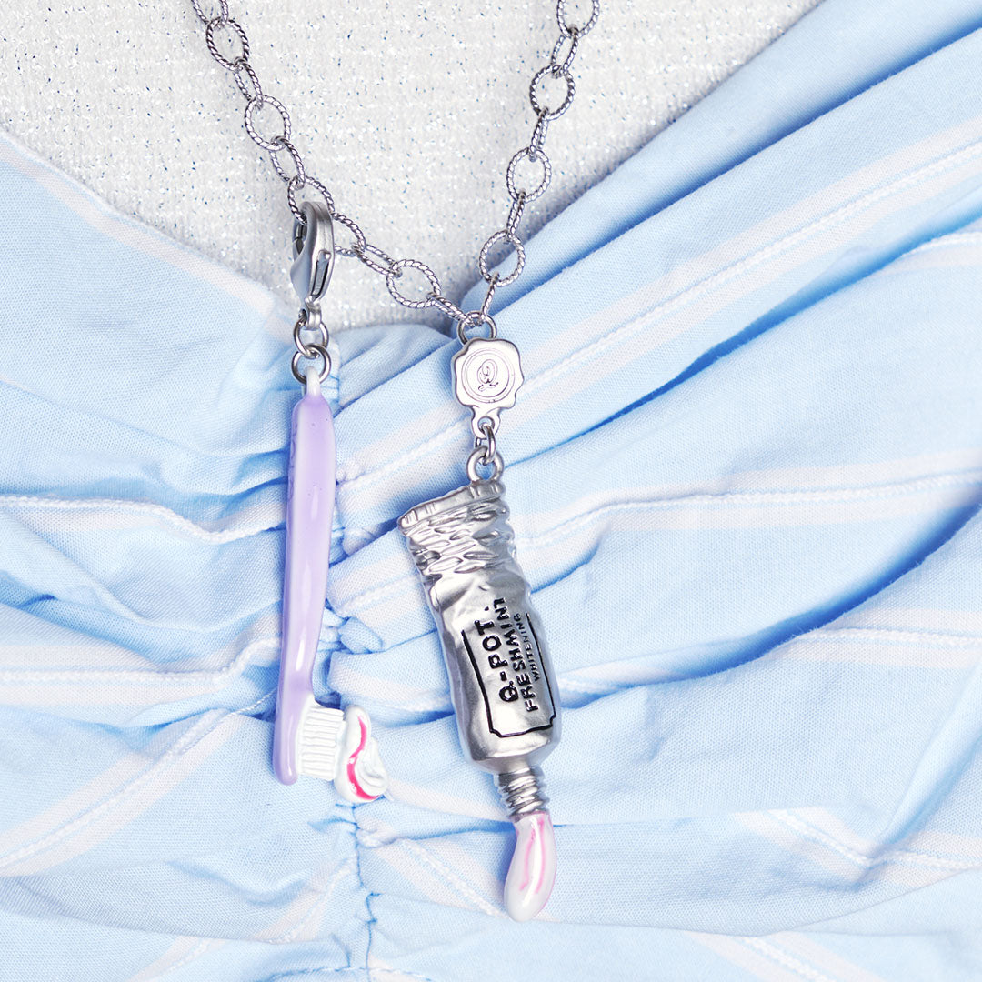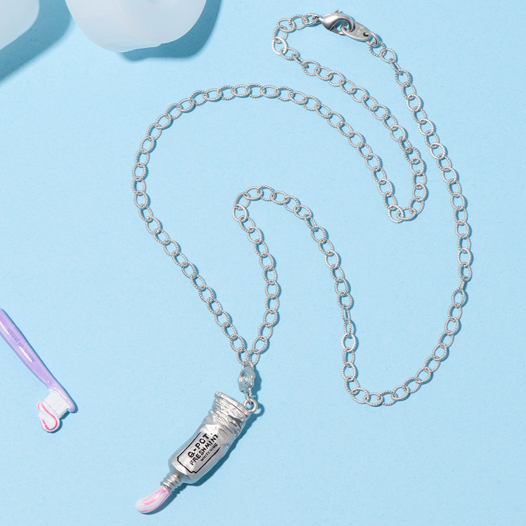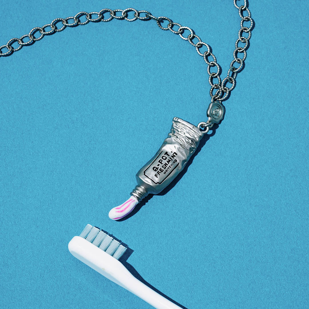 A playful toothpaste necklace with unique design that marble-colored toothpaste pops out. It's a truly wearable piece of pop art even the look of the squeezed tube is reproduced!