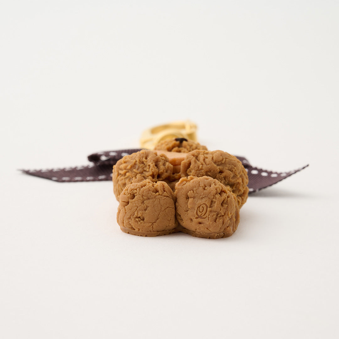 Holding a piece of biscuit, mocha teddy bear cookie with mild bitterness. Chocolate painted nose and eyes, and a Q logo engraved on the feet.