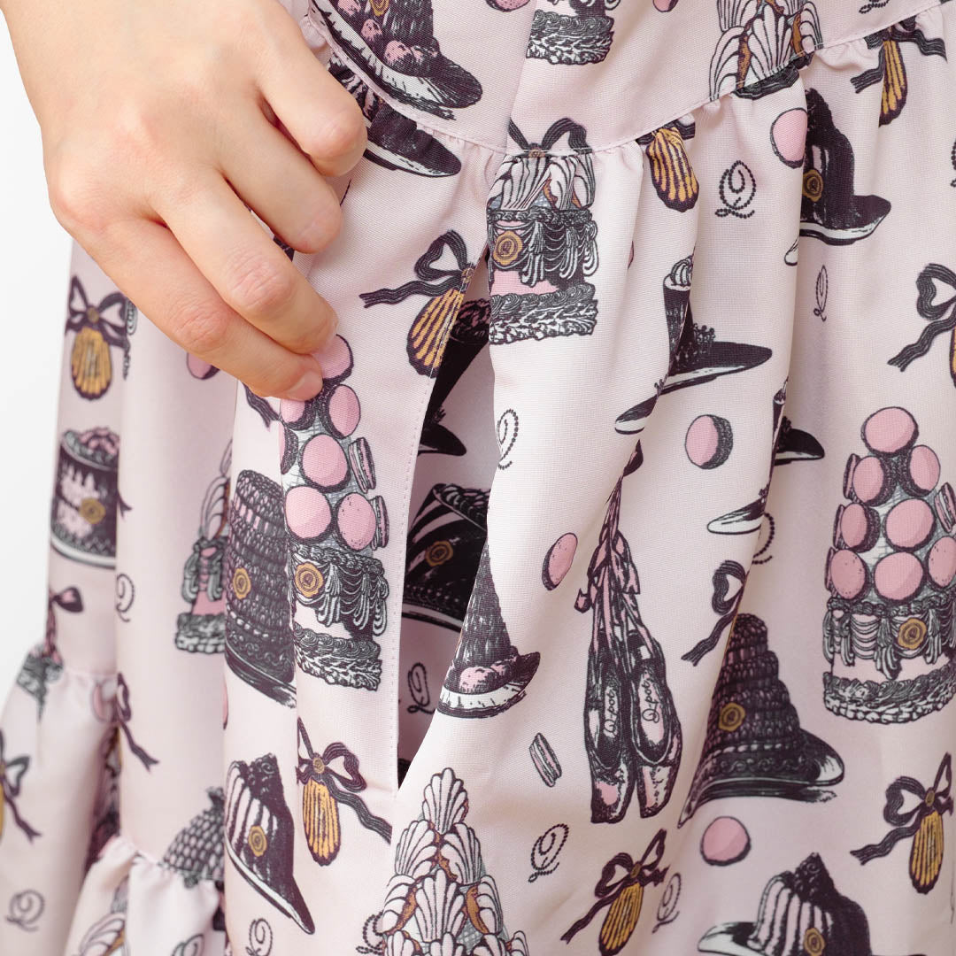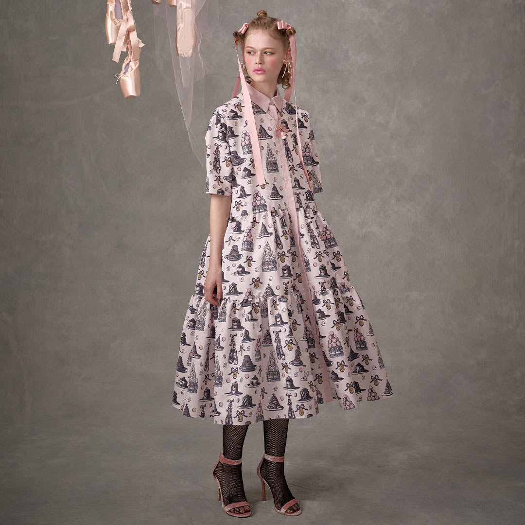An original textile dress featuring a classical and elegant sweetness, adorned with iconic ballerina pointe shoes, madeleines, romantic cakes and macarons topped with whipped cream styled like delicate tutus.