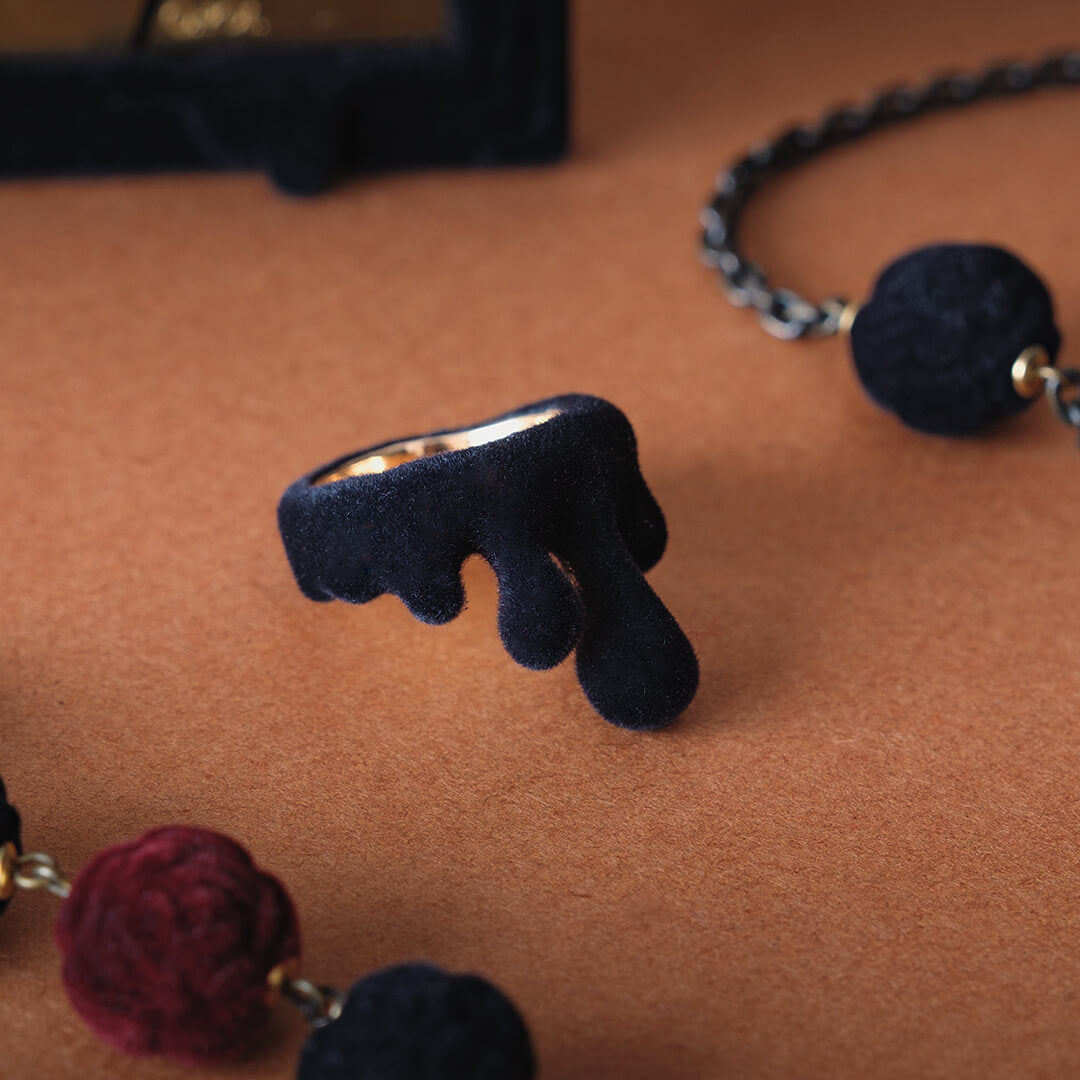 The odd feeling and contradiction with the flocky processing applied to glossy melt ring. You can feel warmth from the melt ring in flocky version that is completely different from the appearance so far. Simple yet unique and one of a kind, with a pop art-like design that is loved by a wide range of ages and genders. Made in Japan and carefully finished by craftsmen.