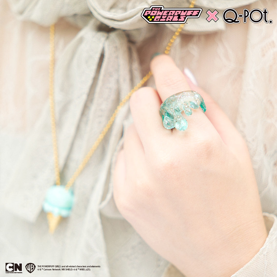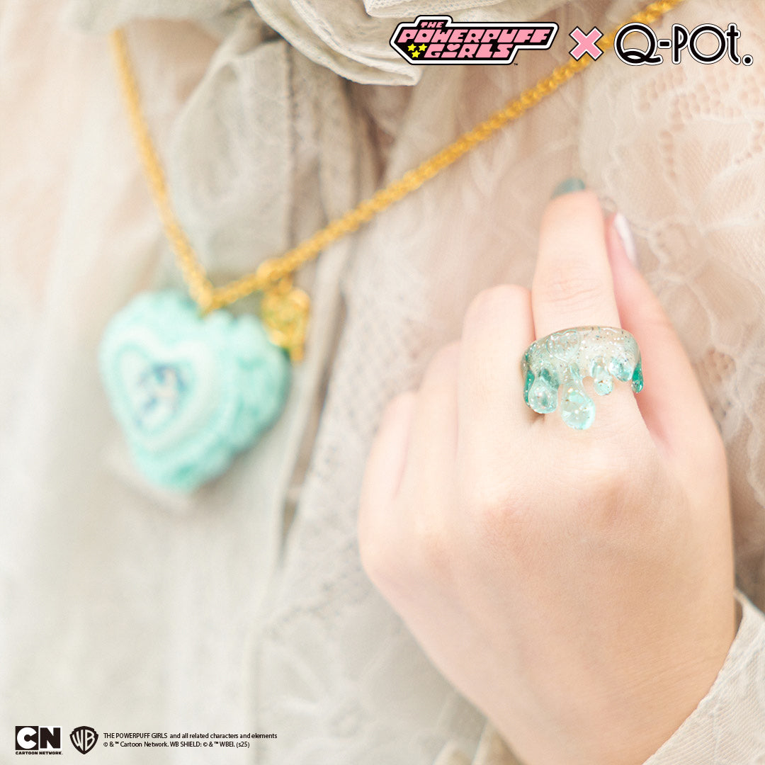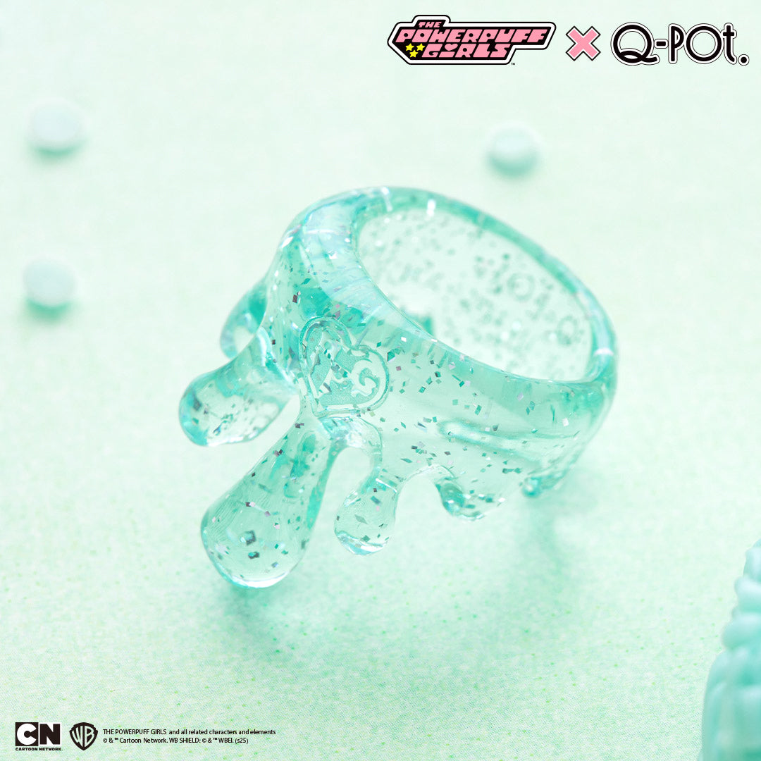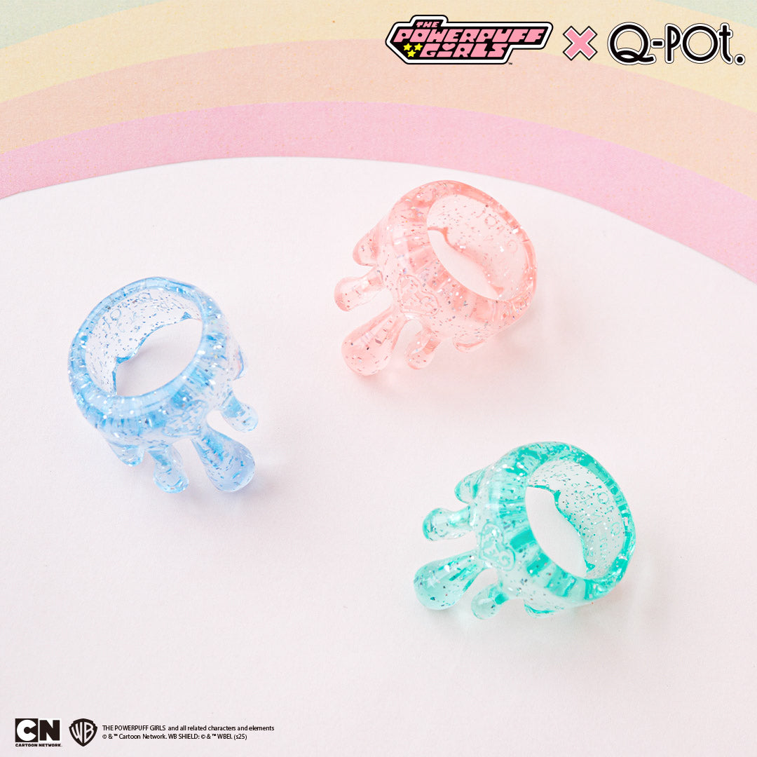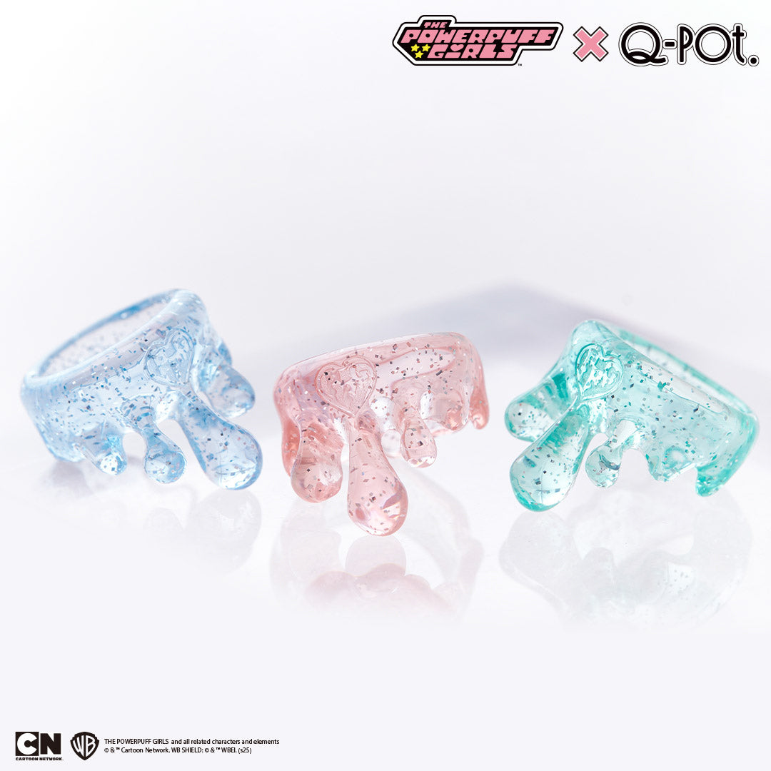 These pop rings, reminiscent of bursting candy, feature Q-pot.'s iconic melting design. The original "PPG (The Powerpuff Girls)" heart logo is engraved on the side. The glitter, like sugar, is encased in a translucent candy for a fantastical look.