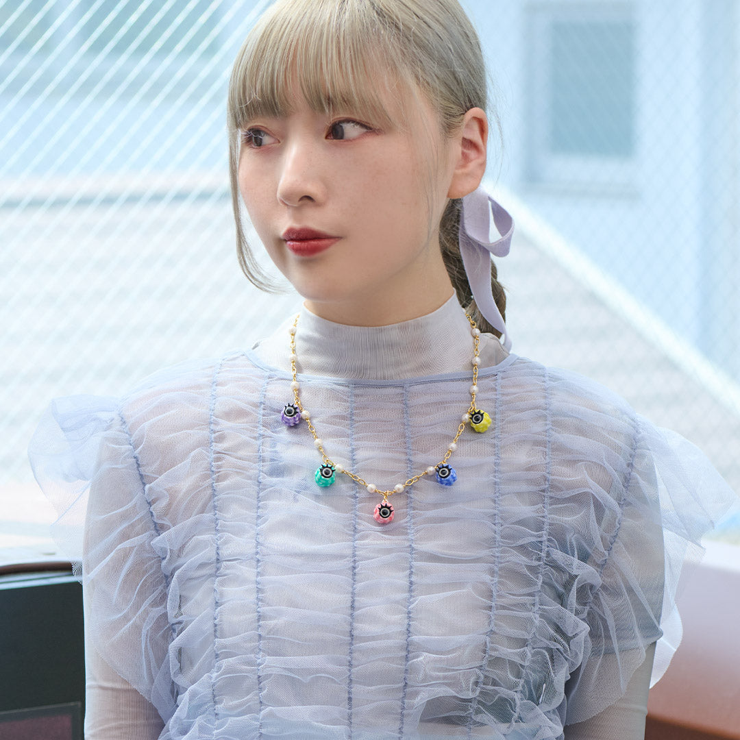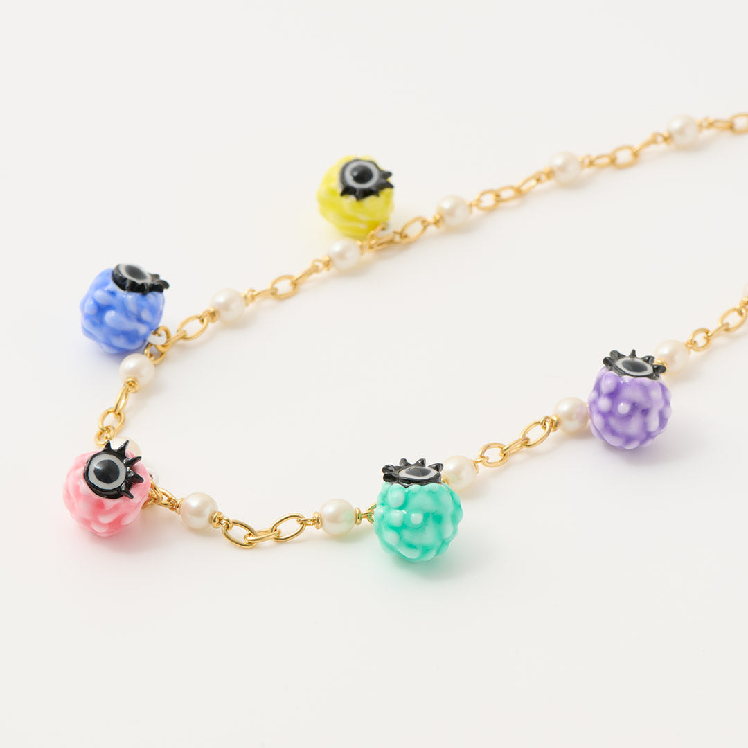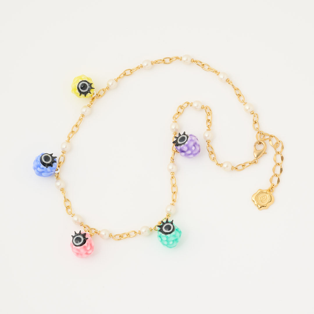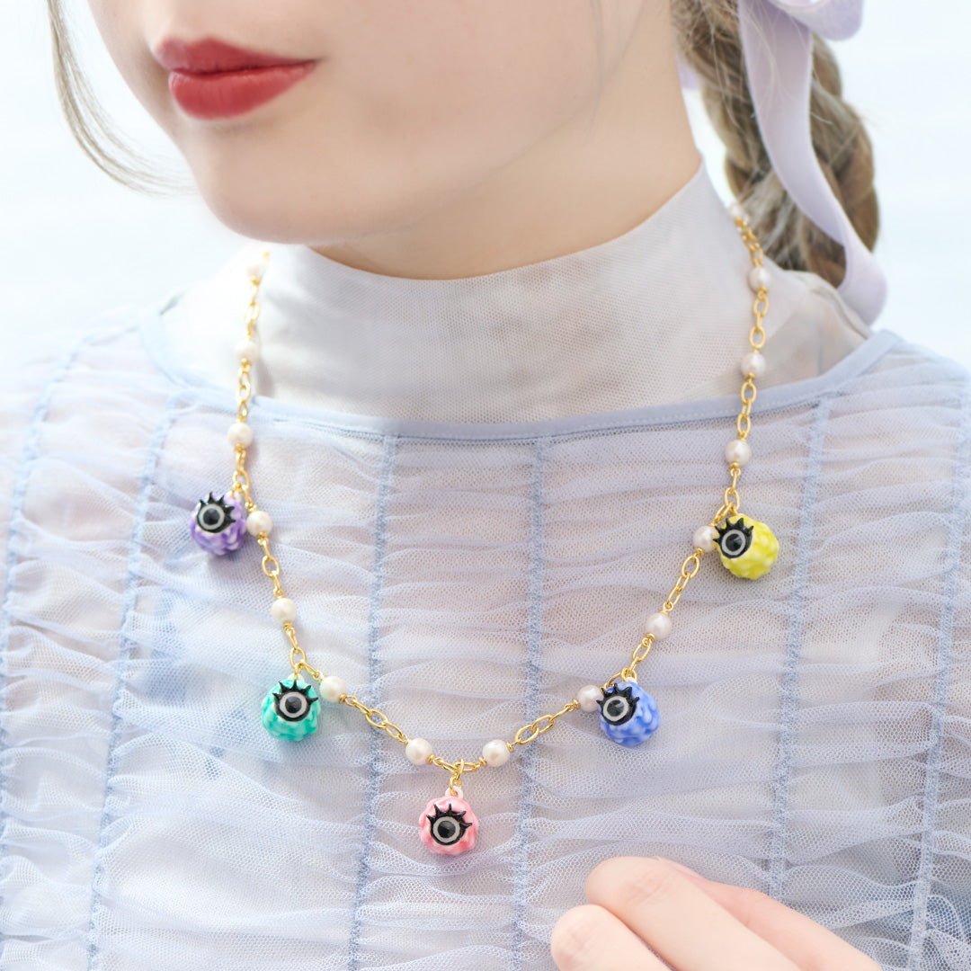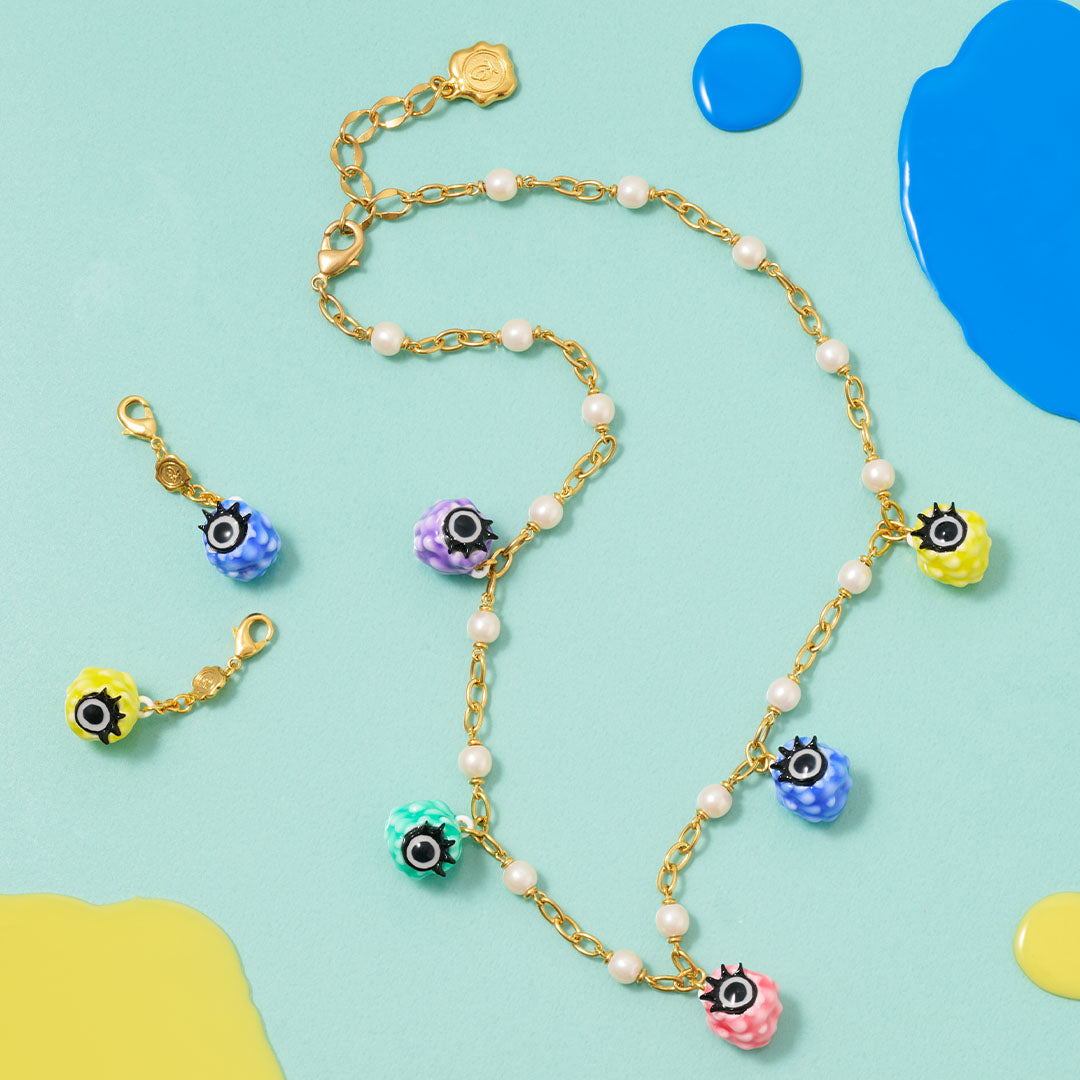 The melted sweets monsters have come together to start a fun-filled party. Emitting sweet scents, they gather every night to perform a mysterious dance that no one has ever seen before. This conceptual necklace, featuring five swaying monsters in Sweet Pink, Cool Mint, Purple Pop, Sunny Yellow, and Frosty Blue, is a standout piece representing the collection. Take your monster companion and head out into the Halloween night!