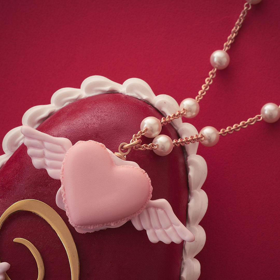 This sweet and charming macaron features a plump, heart-shaped shell, filled generously with fluffy whipped cream and topped with pure white feathers made of sugar. The chain is decorated with pearls like the ornaments.