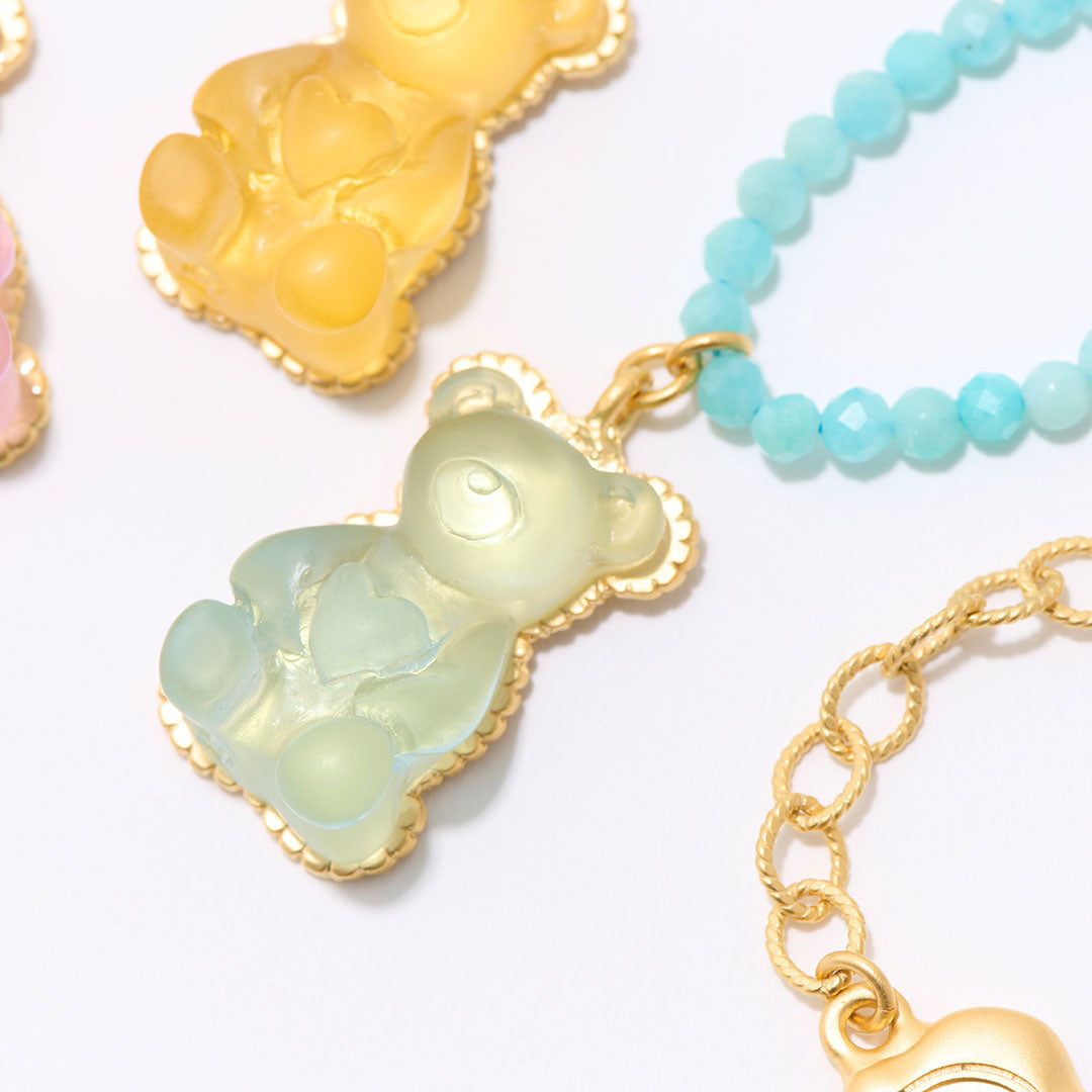 Juicy gummy teddy bear adorned with the sparkle pink tourmaline, a luxurious jewelry with a pop taste. Amazonite with the characteristic white streaks is a symbol of hope, self-expression, and empowering. By wearing it, it helps to promote emotional healing.